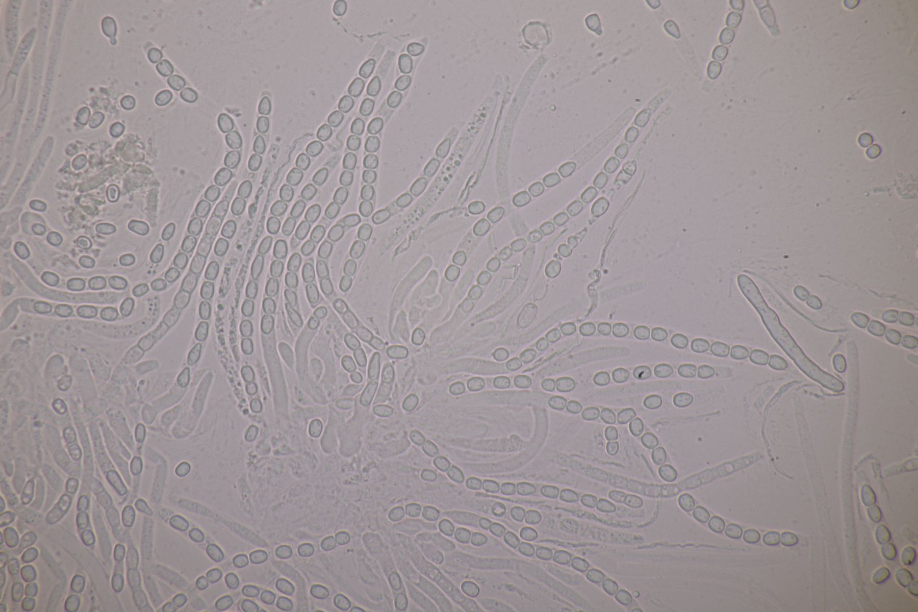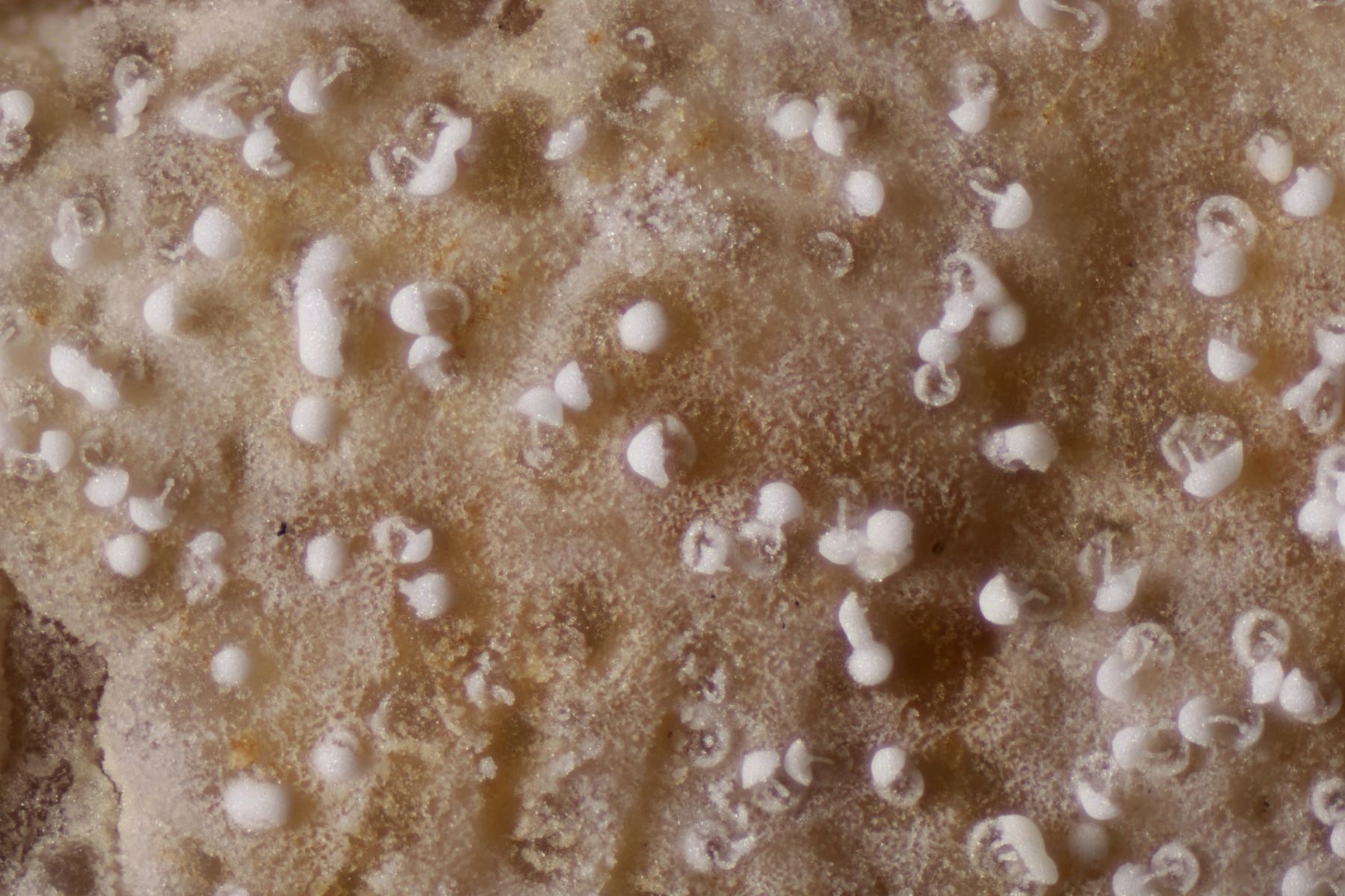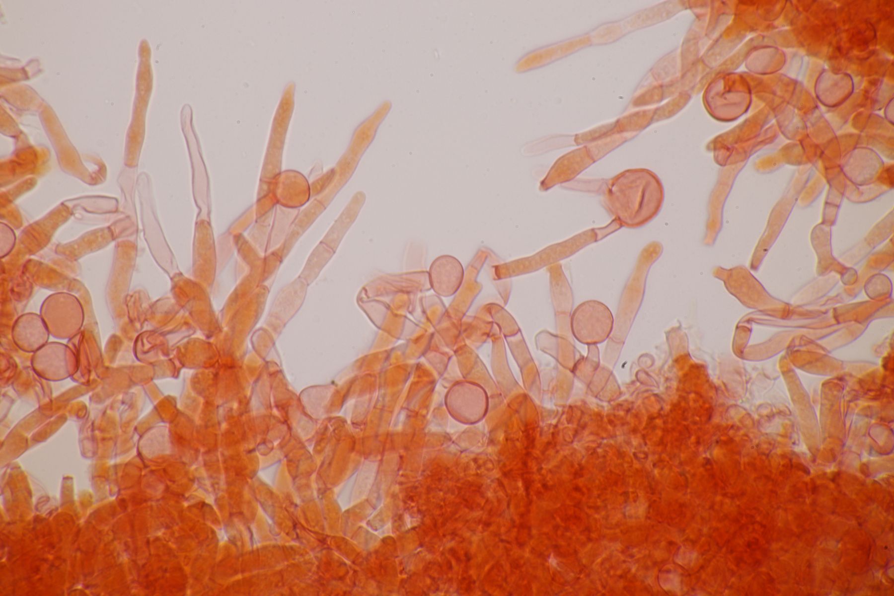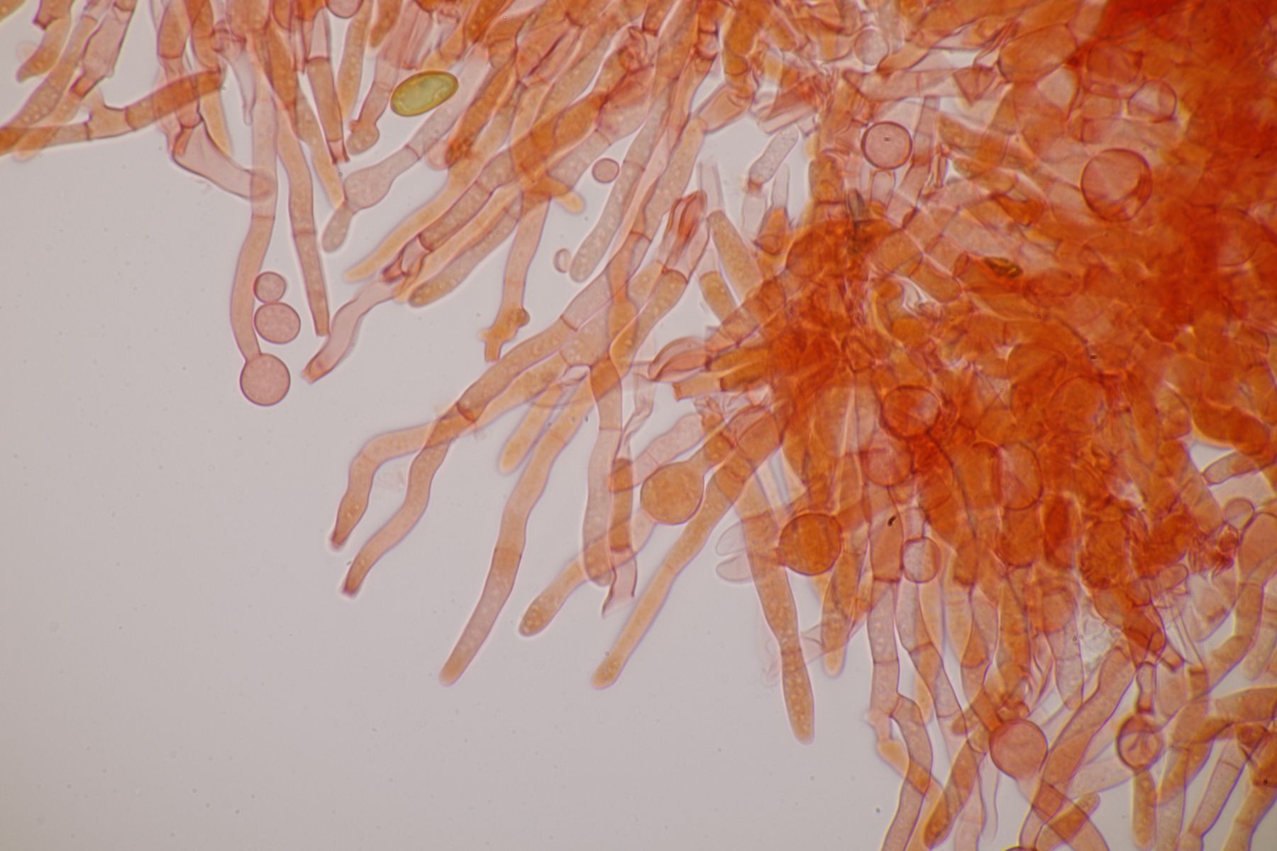 3. Auf der Schnittfläche von einem alten Fomitopsis pinicola Fruchtkörper gab es dann noch einen weißen Belag. In der Hoffnung, daß das ein fungicoler Phragmobasidiomycet ist, hatte ich das Dingen eingepackt, wurde dann aber am Mikro enttäuscht: Eine Anamorphe, zu der mit leider nichts einfällt. Vielleicht hat ja einer von euch eine Idee dazu?