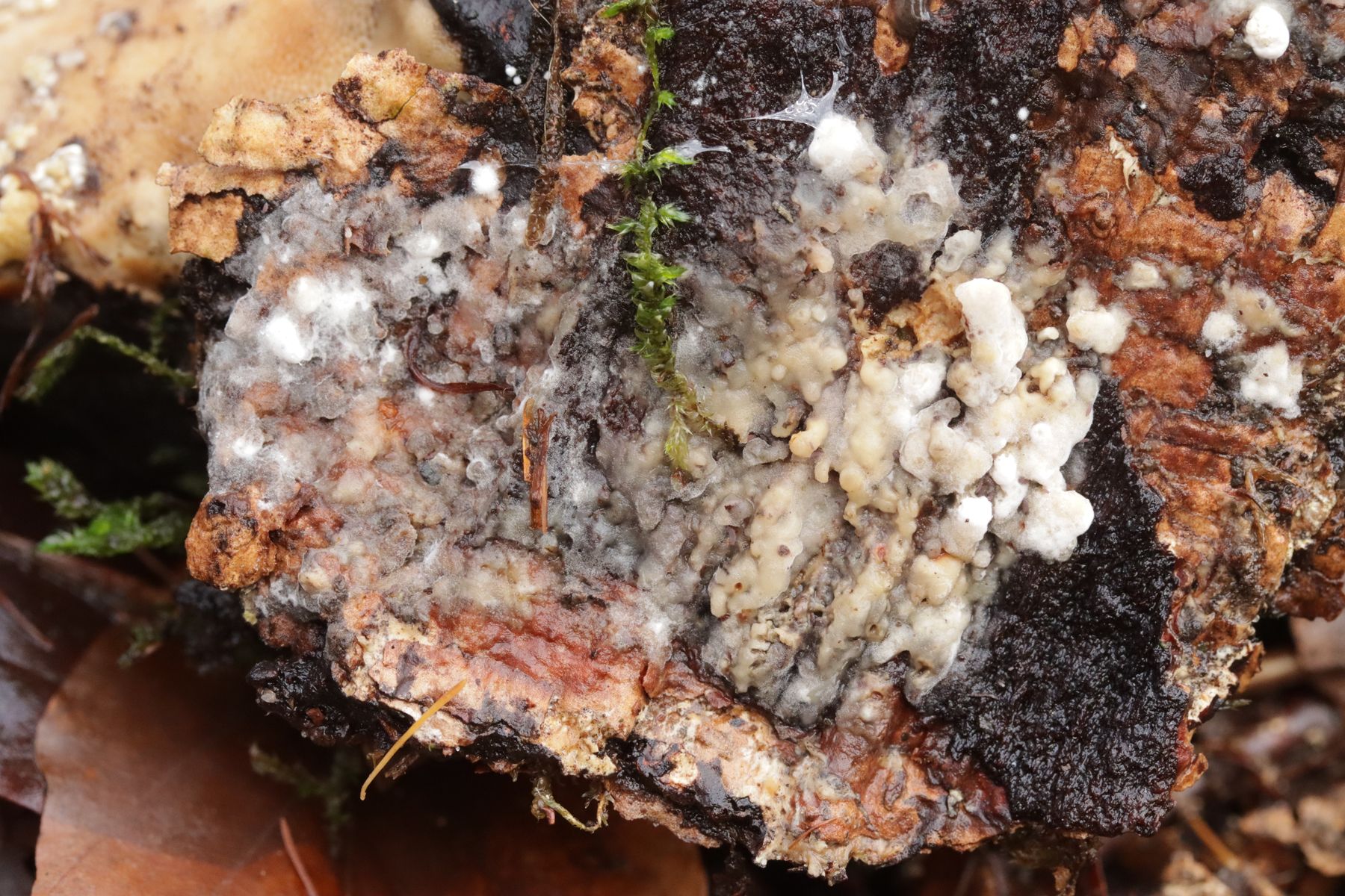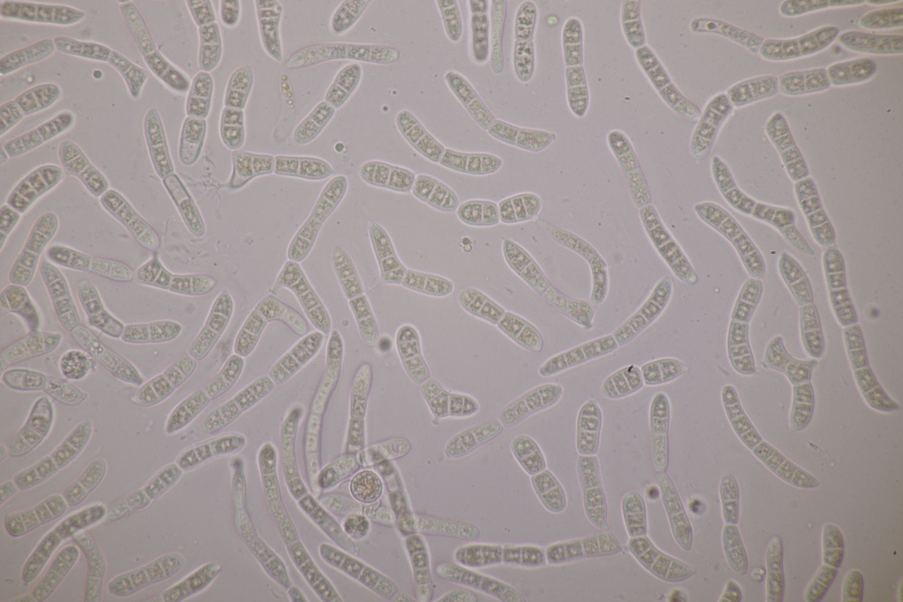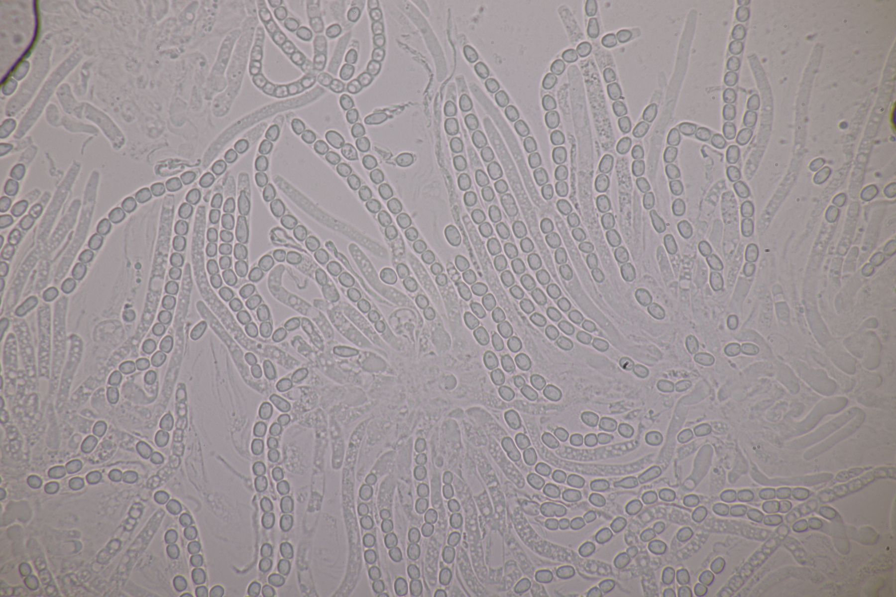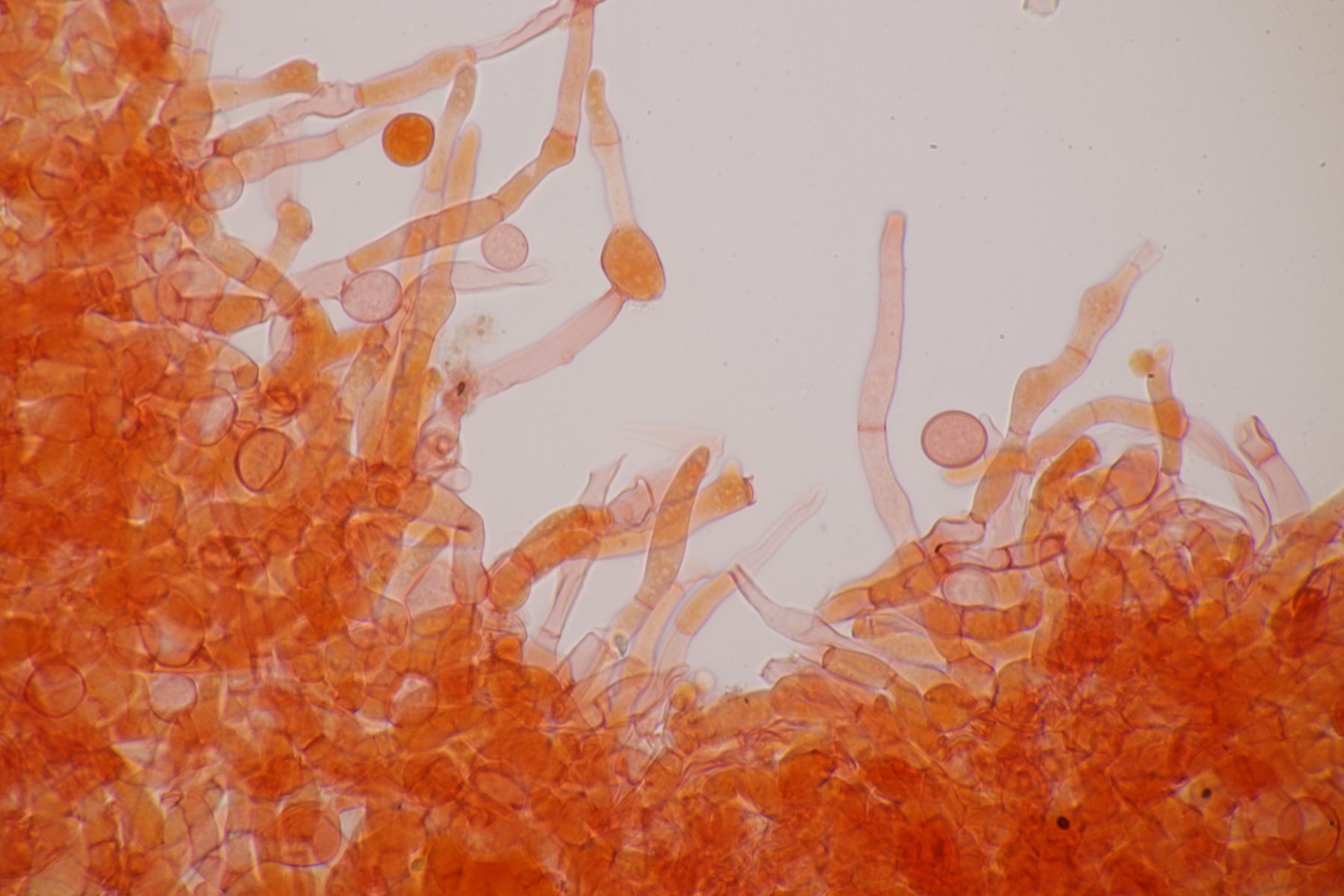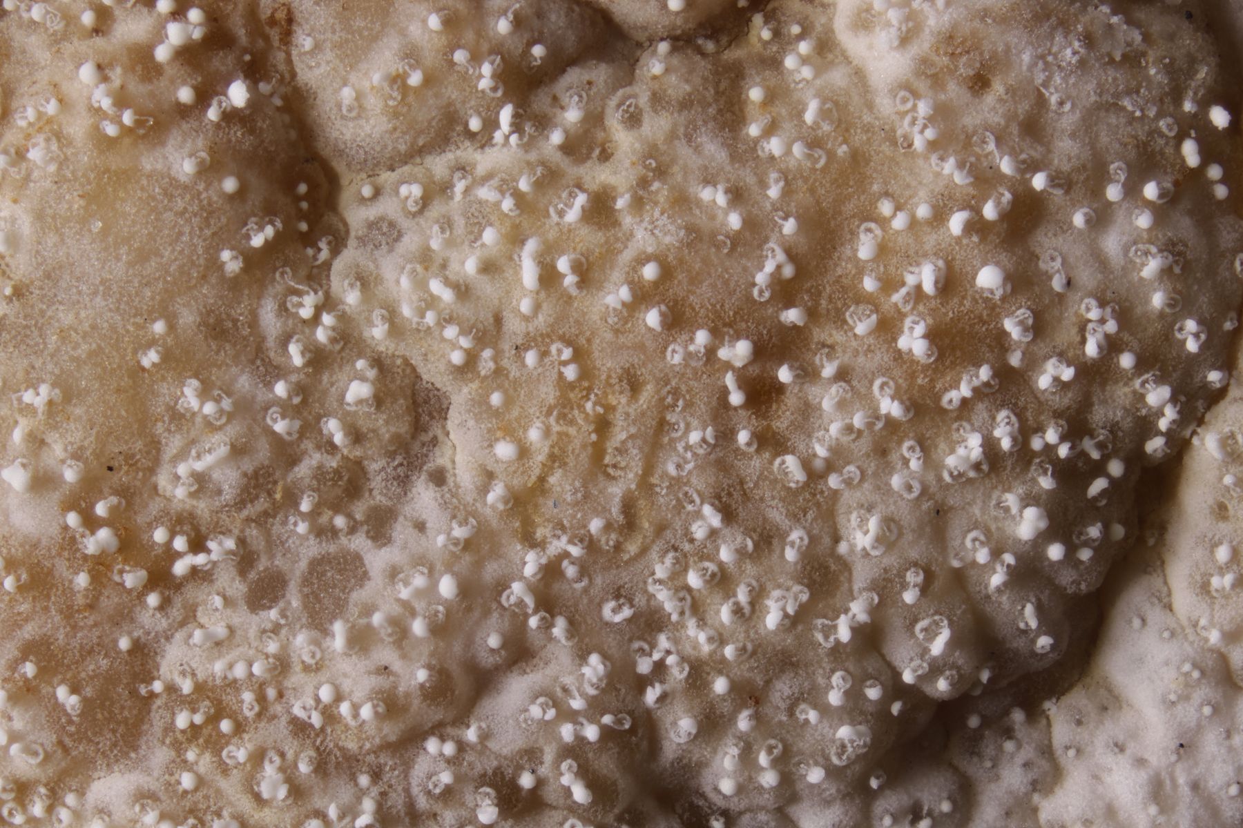 3. Auf der Schnittfläche von einem alten Fomitopsis pinicola Fruchtkörper gab es dann noch einen weißen Belag. In der Hoffnung, daß das ein fungicoler Phragmobasidiomycet ist, hatte ich das Dingen eingepackt, wurde dann aber am Mikro enttäuscht: Eine Anamorphe, zu der mit leider nichts einfällt. Vielleicht hat ja einer von euch eine Idee dazu?
