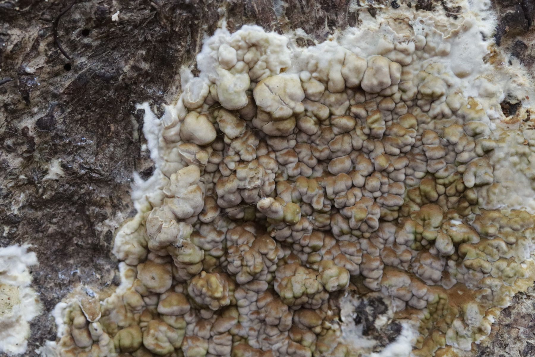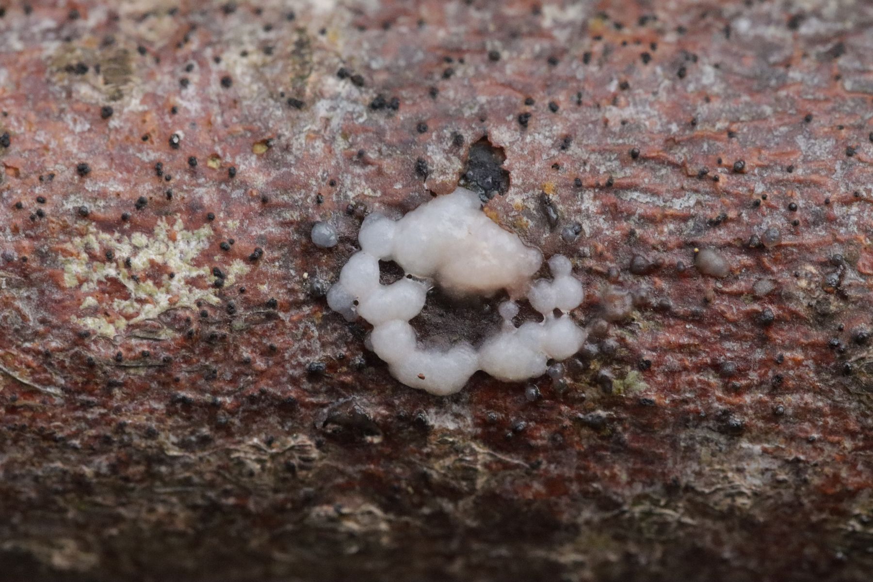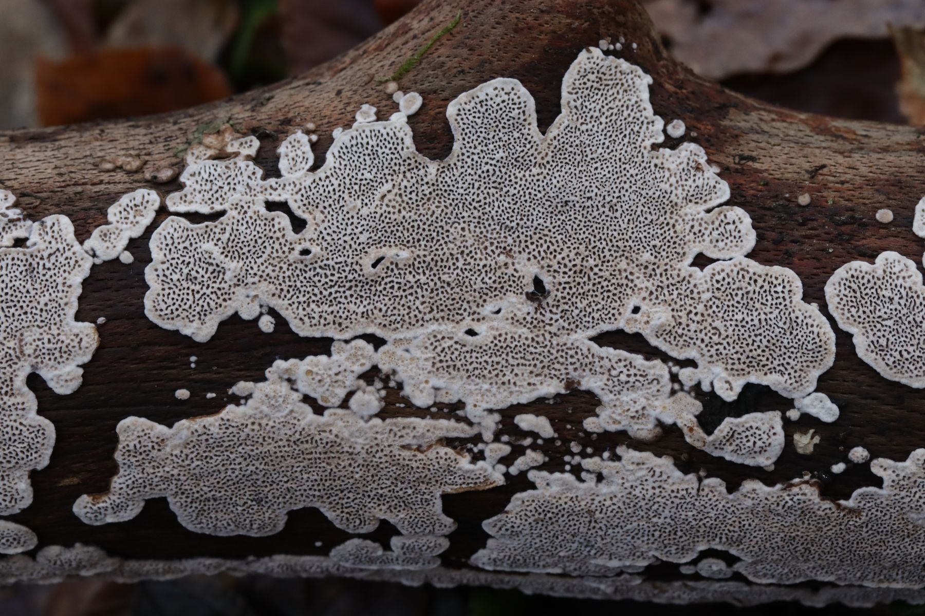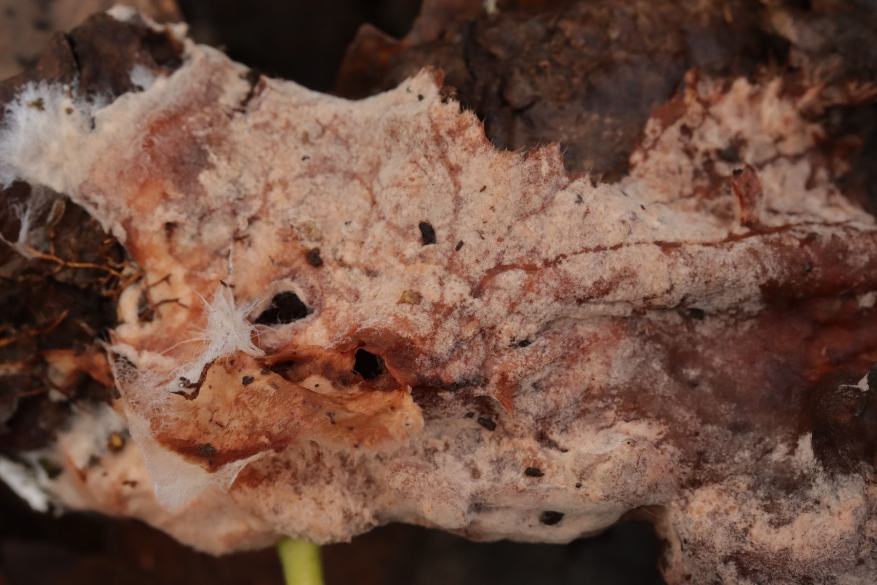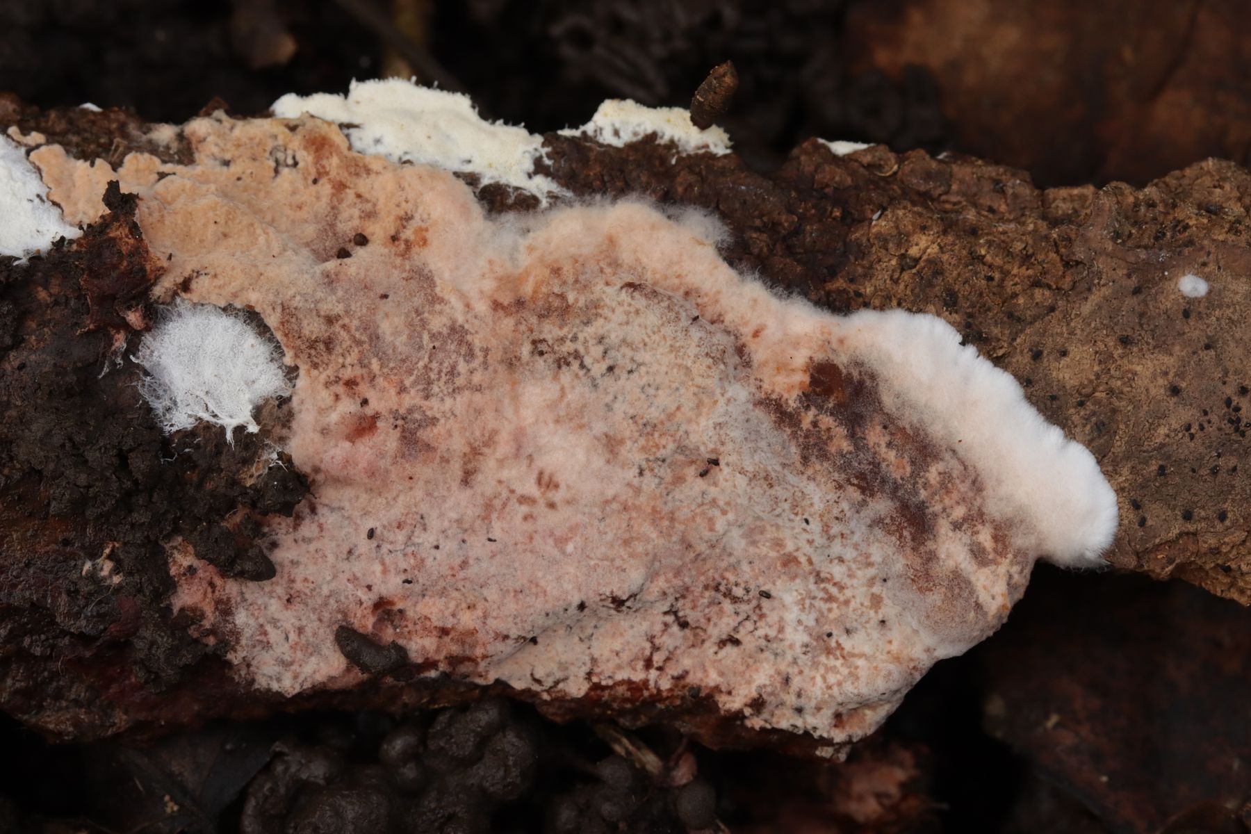 4. Hier hatte ich im Feld auf ein Helicobasidium gehofft. Leider war dann zu Hause unter dem Mikroskop nur ein Hyphengeflecht sichtbar, keine Basidien, keine Konidienträger. Also für mich unbestimmbar.