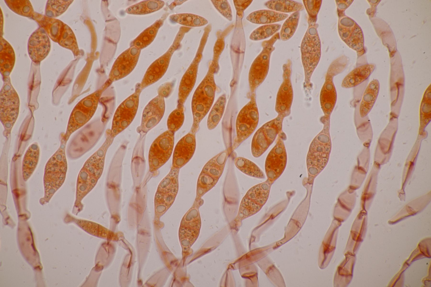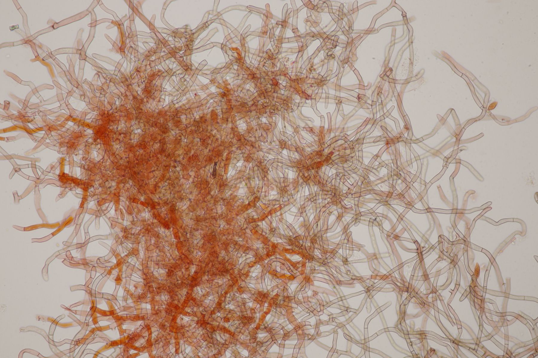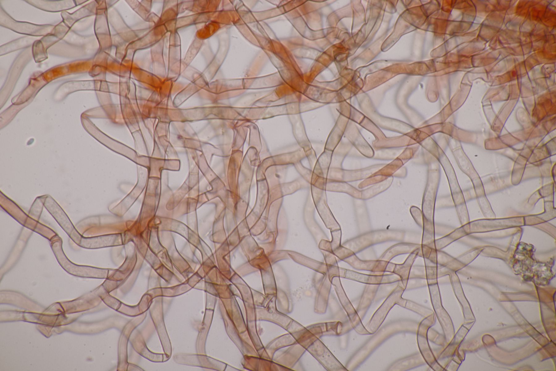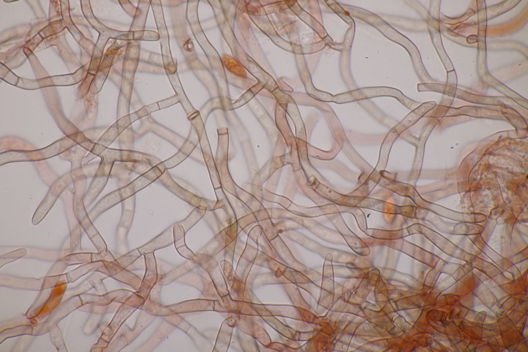 5. Hier hatte ich im Feld auch erstmal an einen Phragmobasidiomyceten gedacht. Mikroskopisch dann die Überraschung: Nur Bündel aus verdickten Hyphen, die entfernt an dicke Maden erinnern. Auch hier fehlt mir jegliche Idee, was es sein könnte.