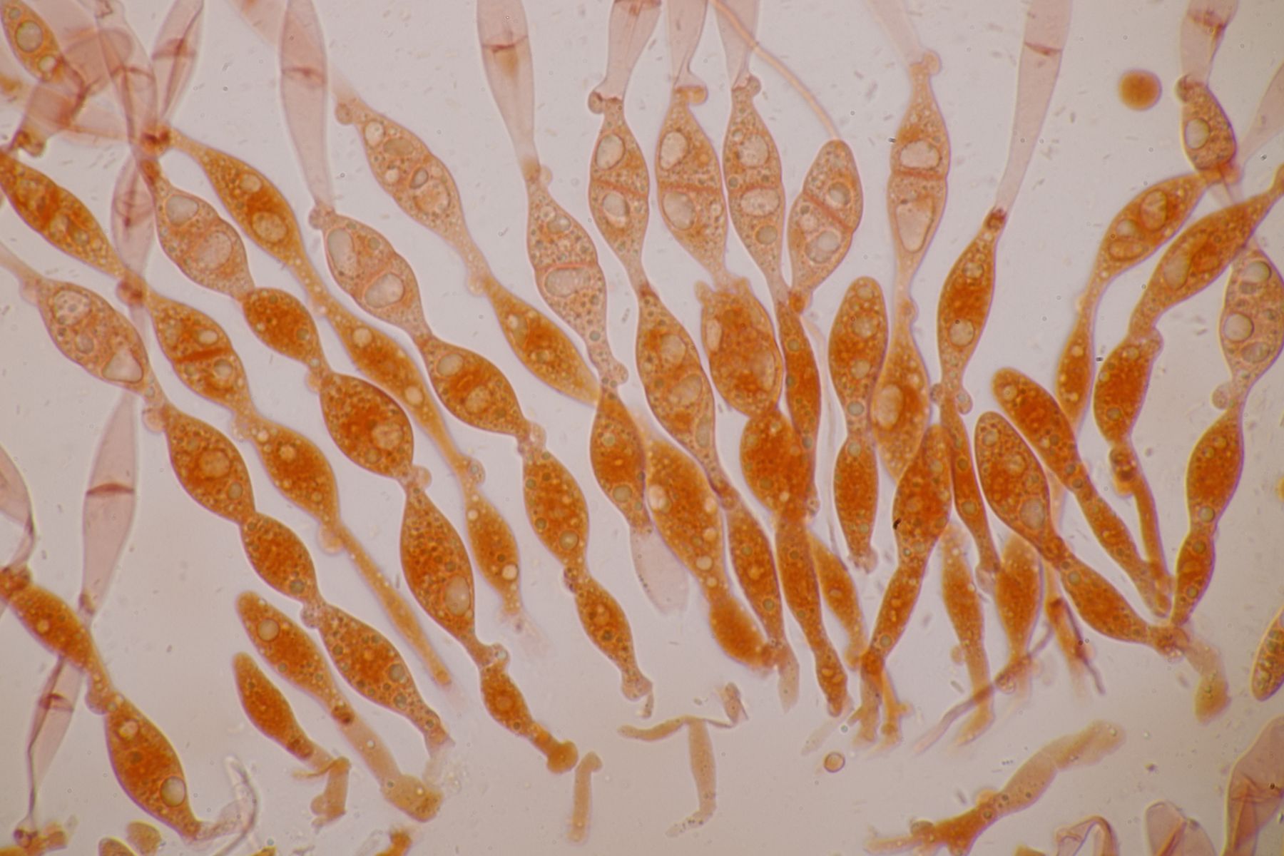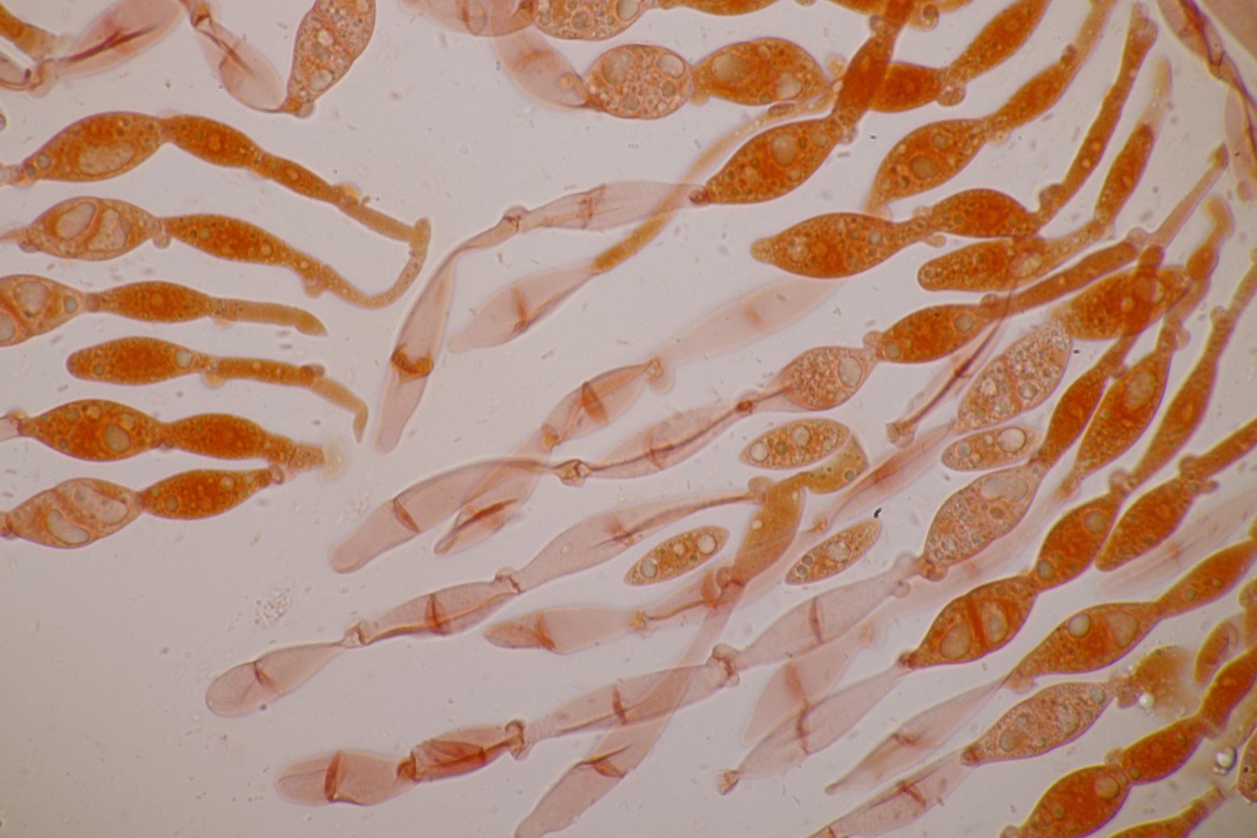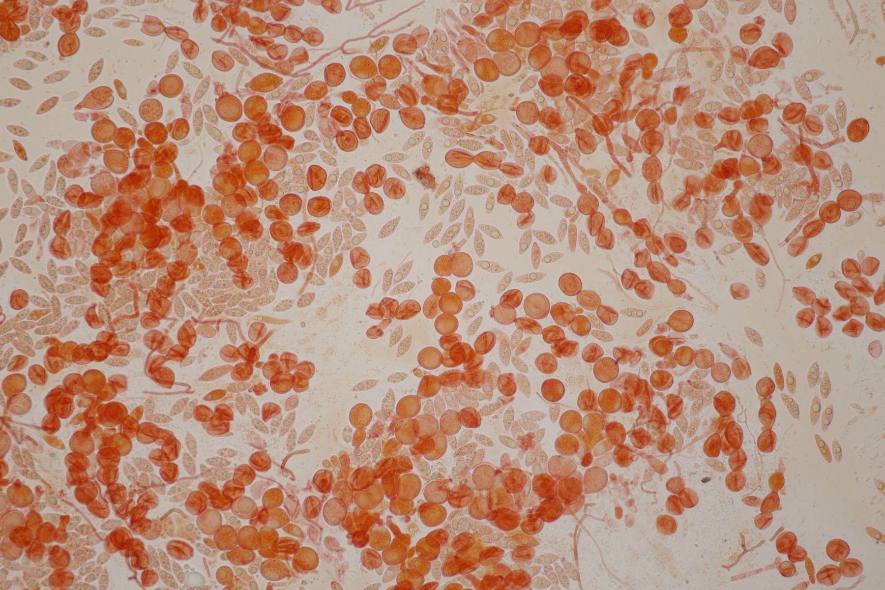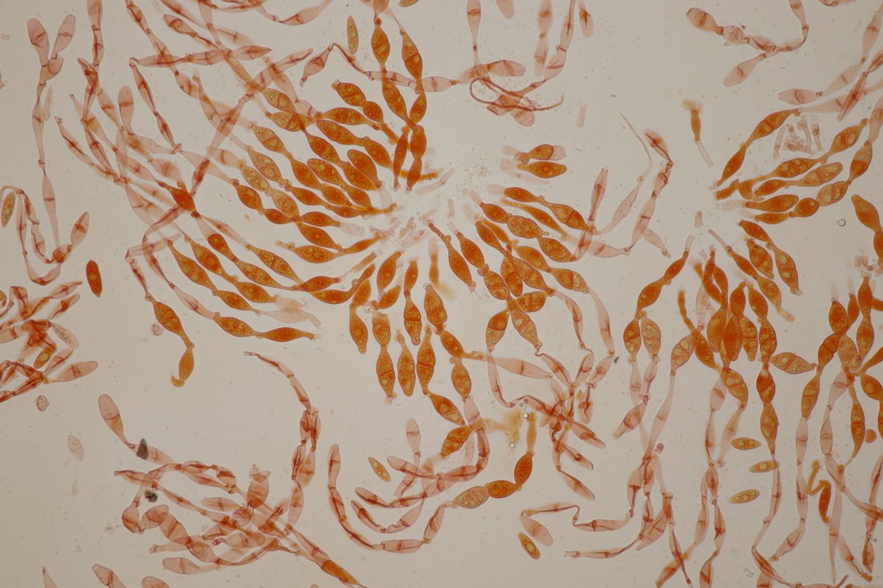5. Hier hatte ich im Feld auch erstmal an einen Phragmobasidiomyceten gedacht. Mikroskopisch dann die Überraschung: Nur Bündel aus verdickten Hyphen, die entfernt an dicke Maden erinnern. Auch hier fehlt mir jegliche Idee, was es sein könnte.