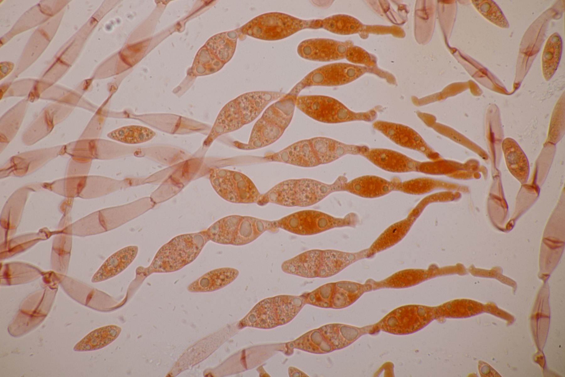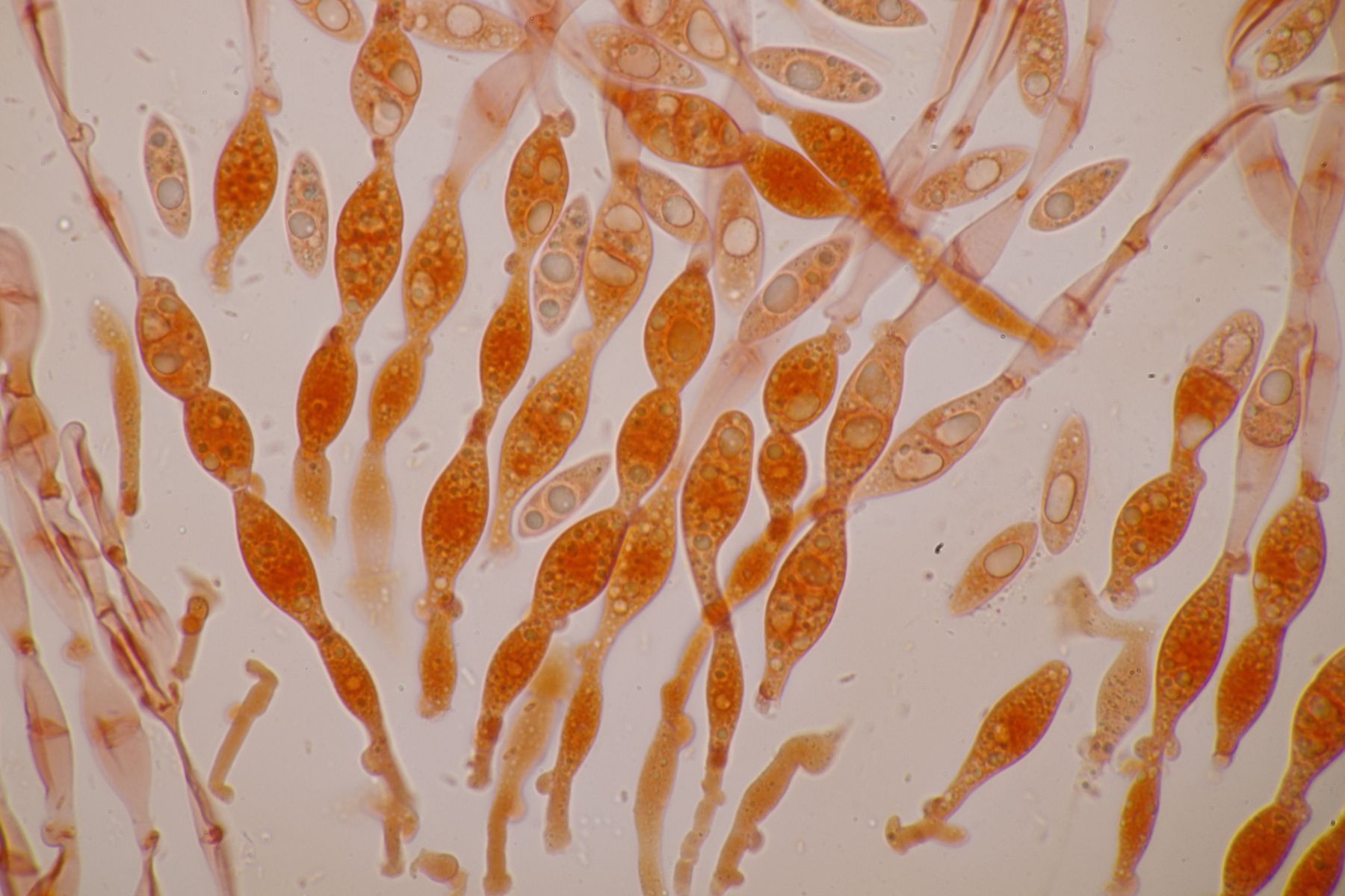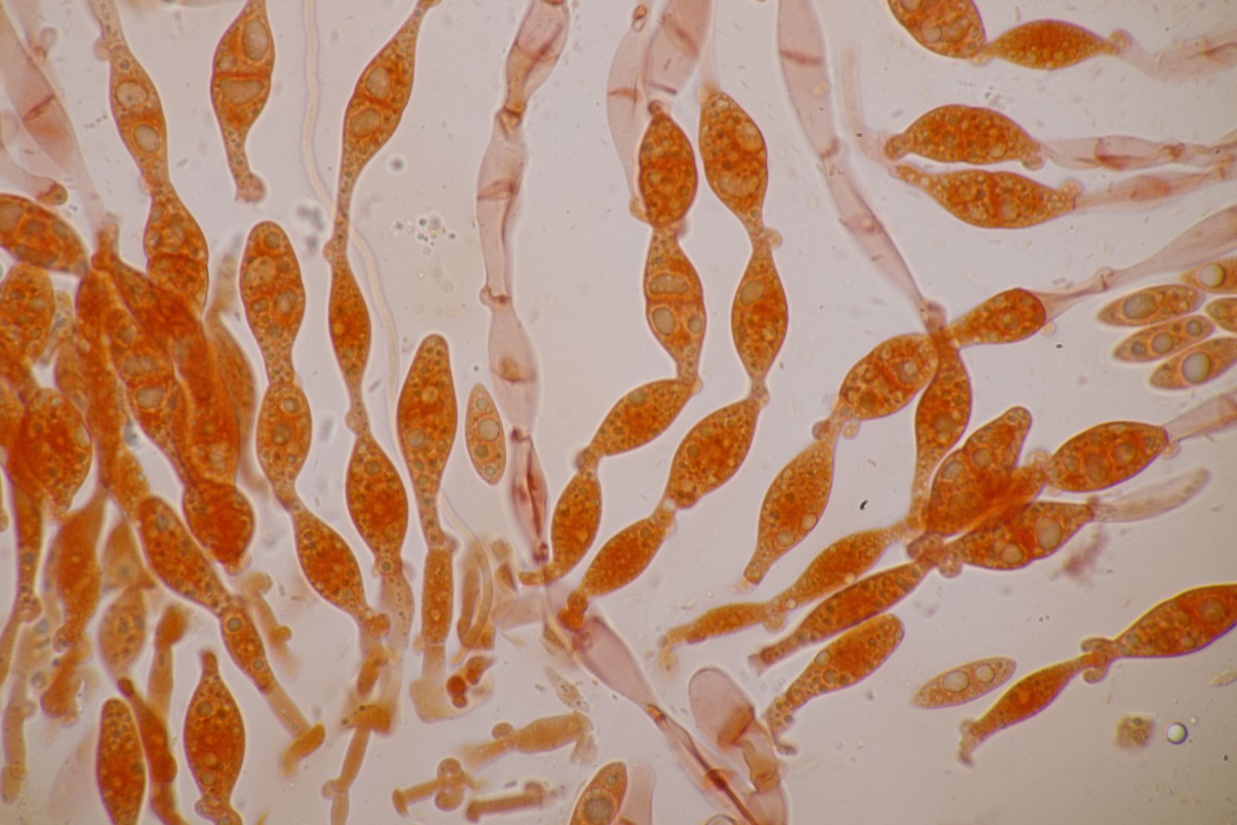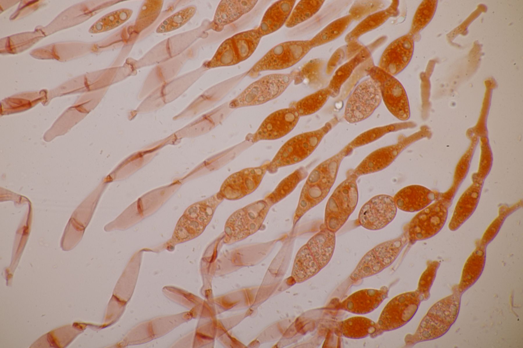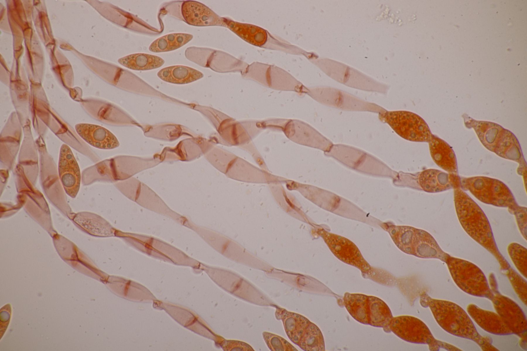 5. Hier hatte ich im Feld auch erstmal an einen Phragmobasidiomyceten gedacht. Mikroskopisch dann die Überraschung: Nur Bündel aus verdickten Hyphen, die entfernt an dicke Maden erinnern. Auch hier fehlt mir jegliche Idee, was es sein könnte.