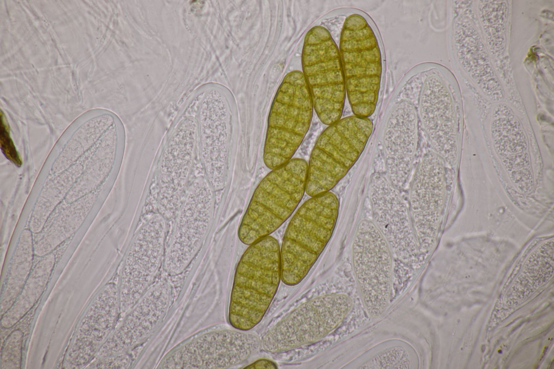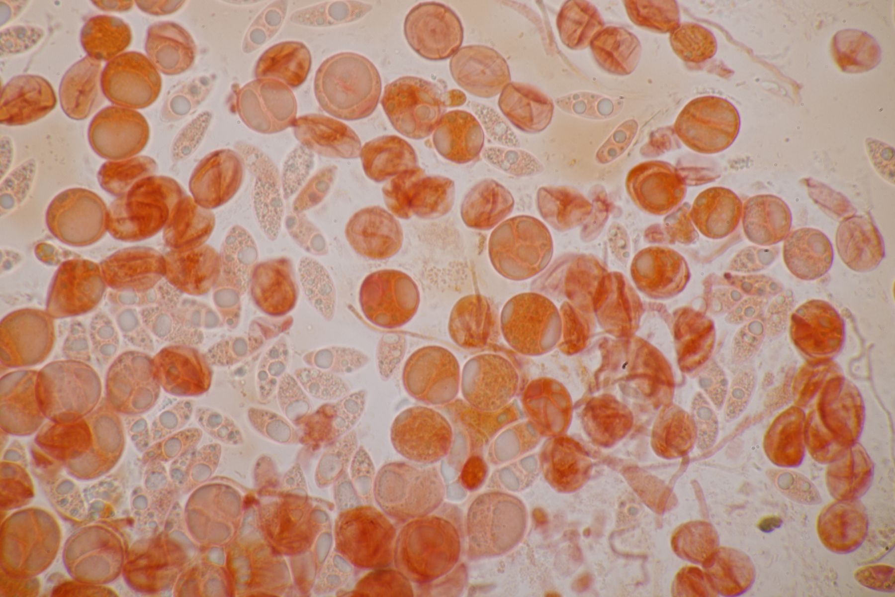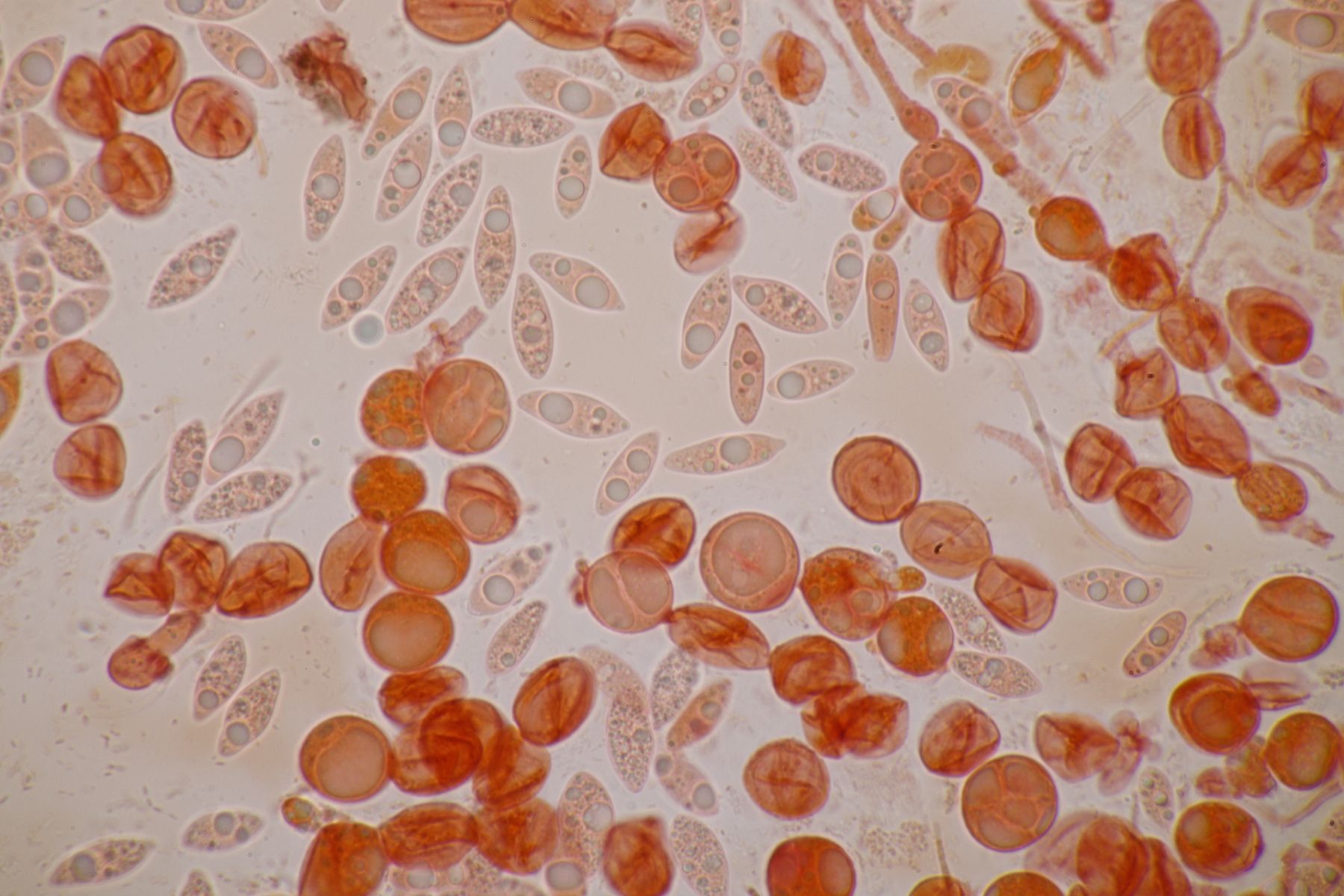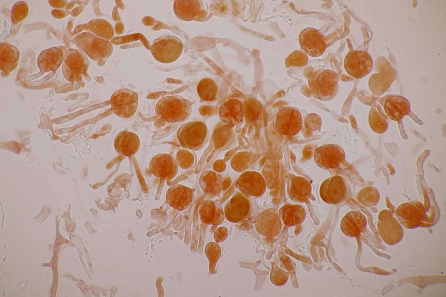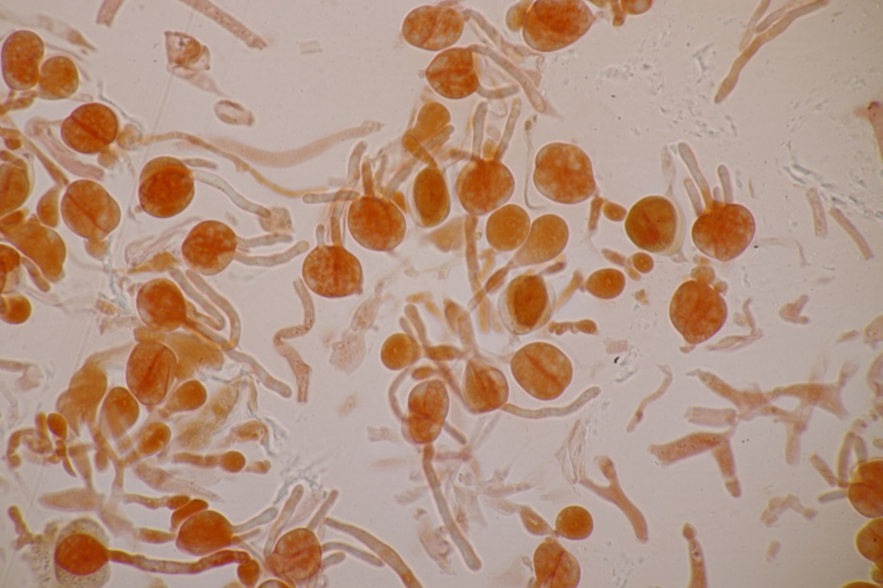 6. Noch ein Sirobasidium, ebenfalls neu für den Volksgarten: Die runden, vierfach septierten Basidien bringen uns hier zu Sirobasidium albidum.