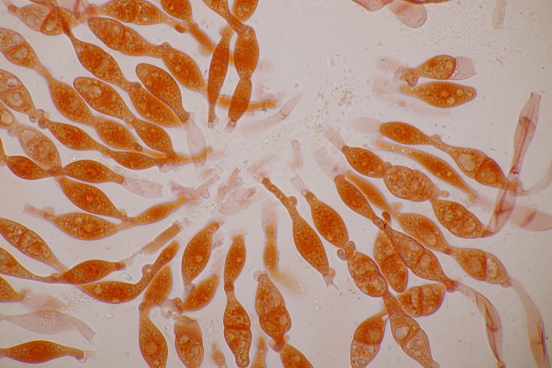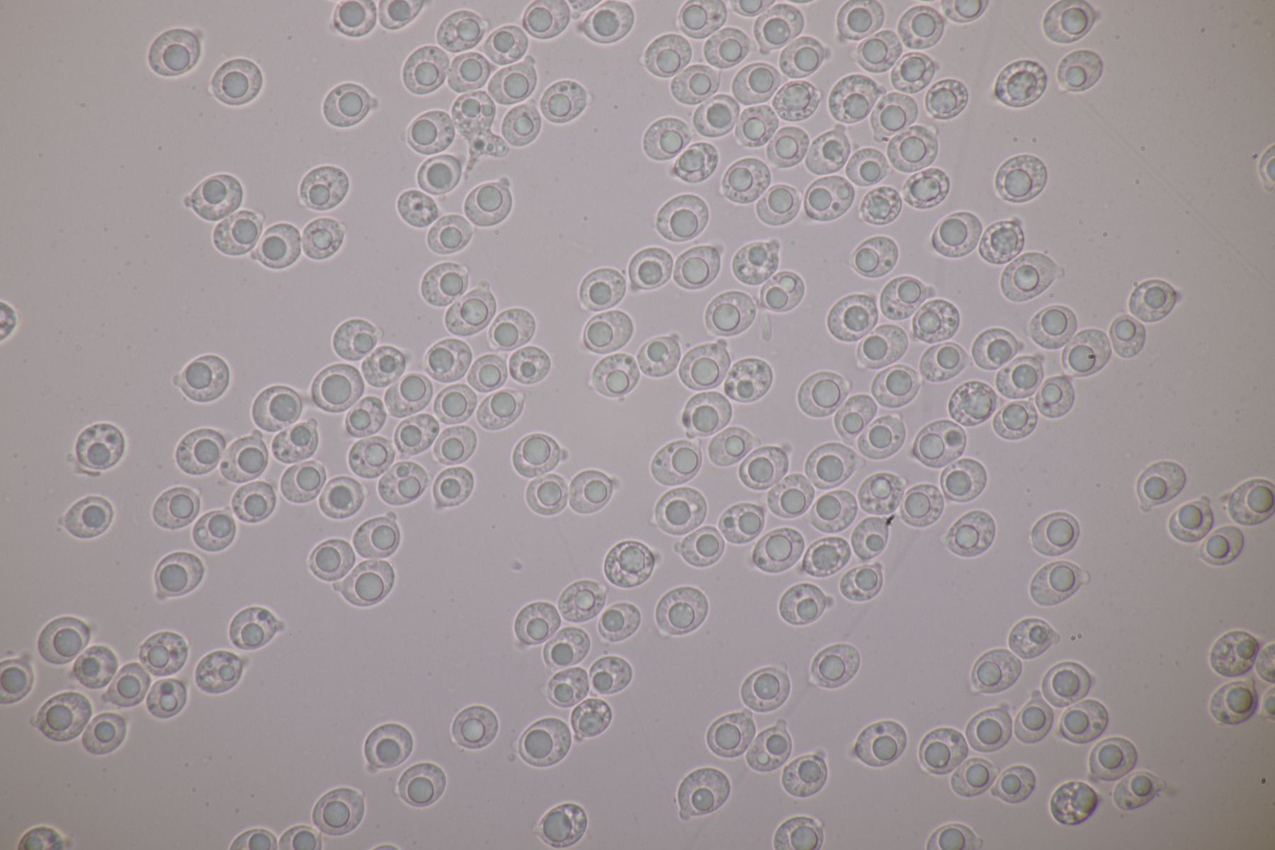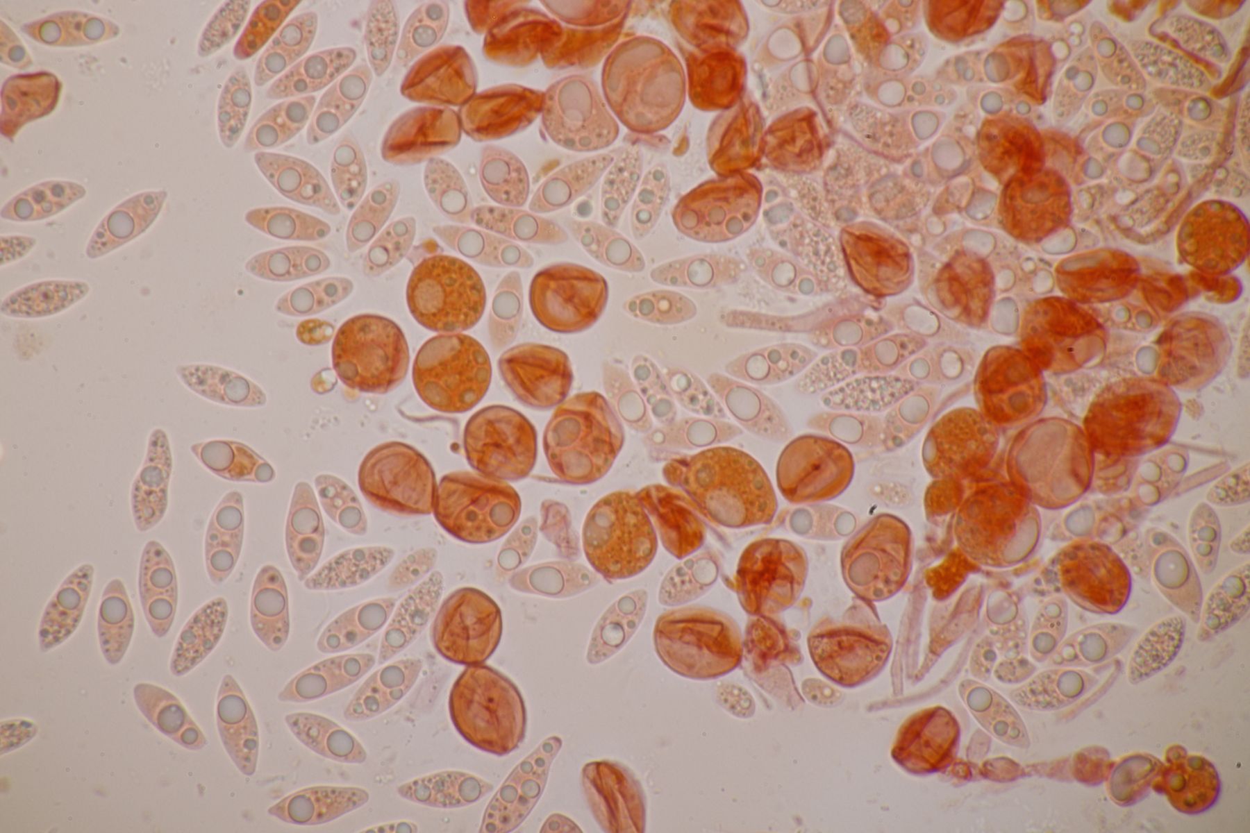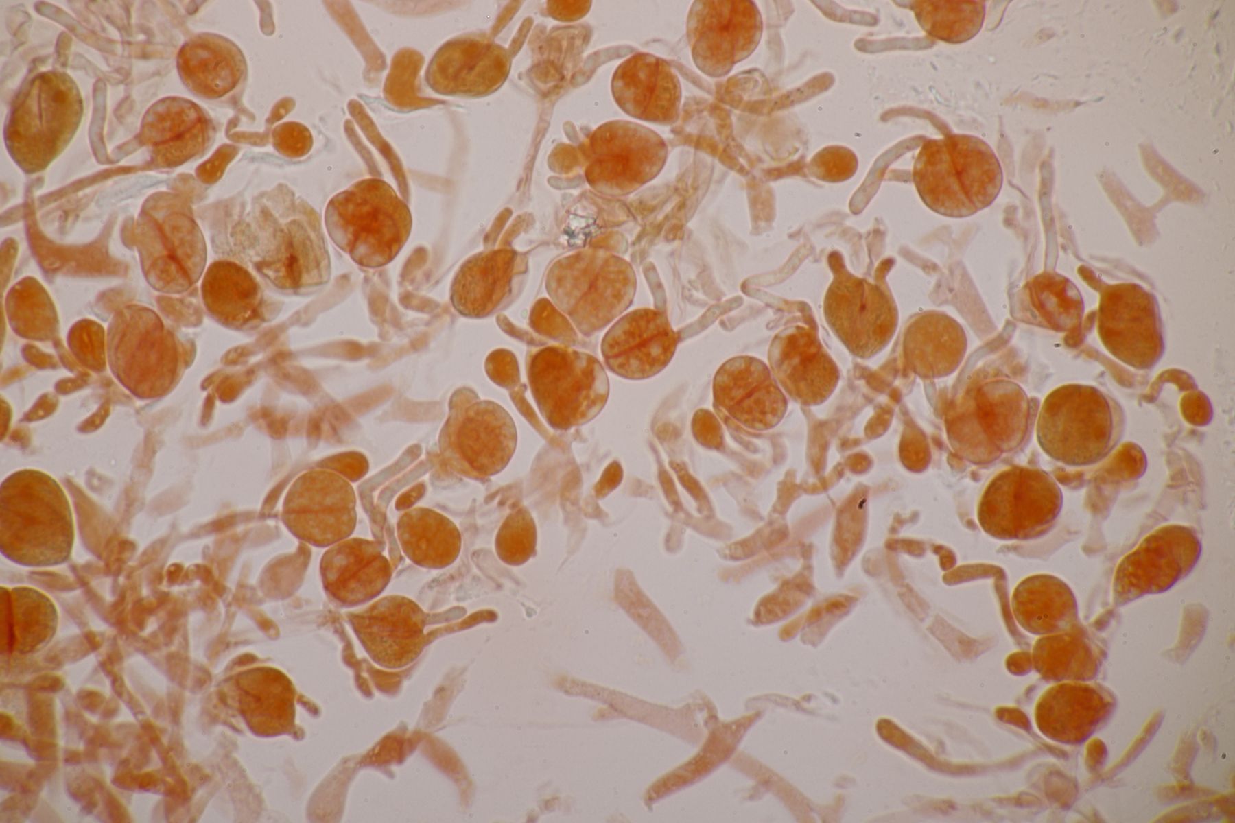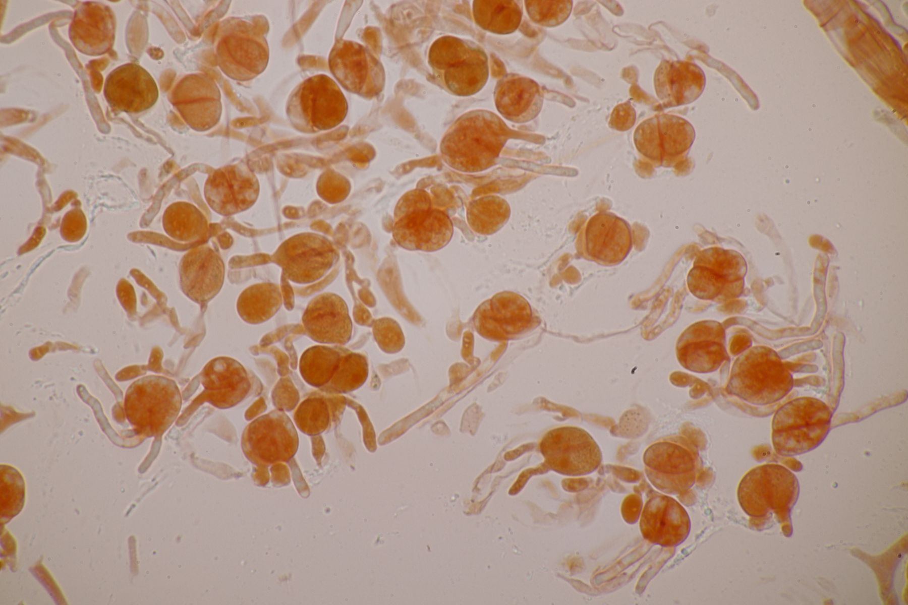 6. Noch ein Sirobasidium, ebenfalls neu für den Volksgarten: Die runden, vierfach septierten Basidien bringen uns hier zu Sirobasidium albidum.