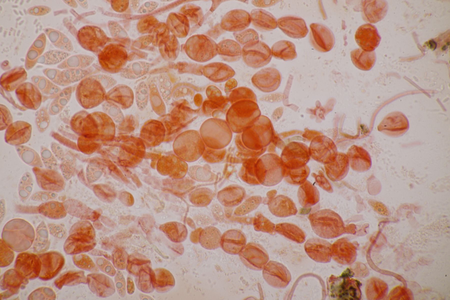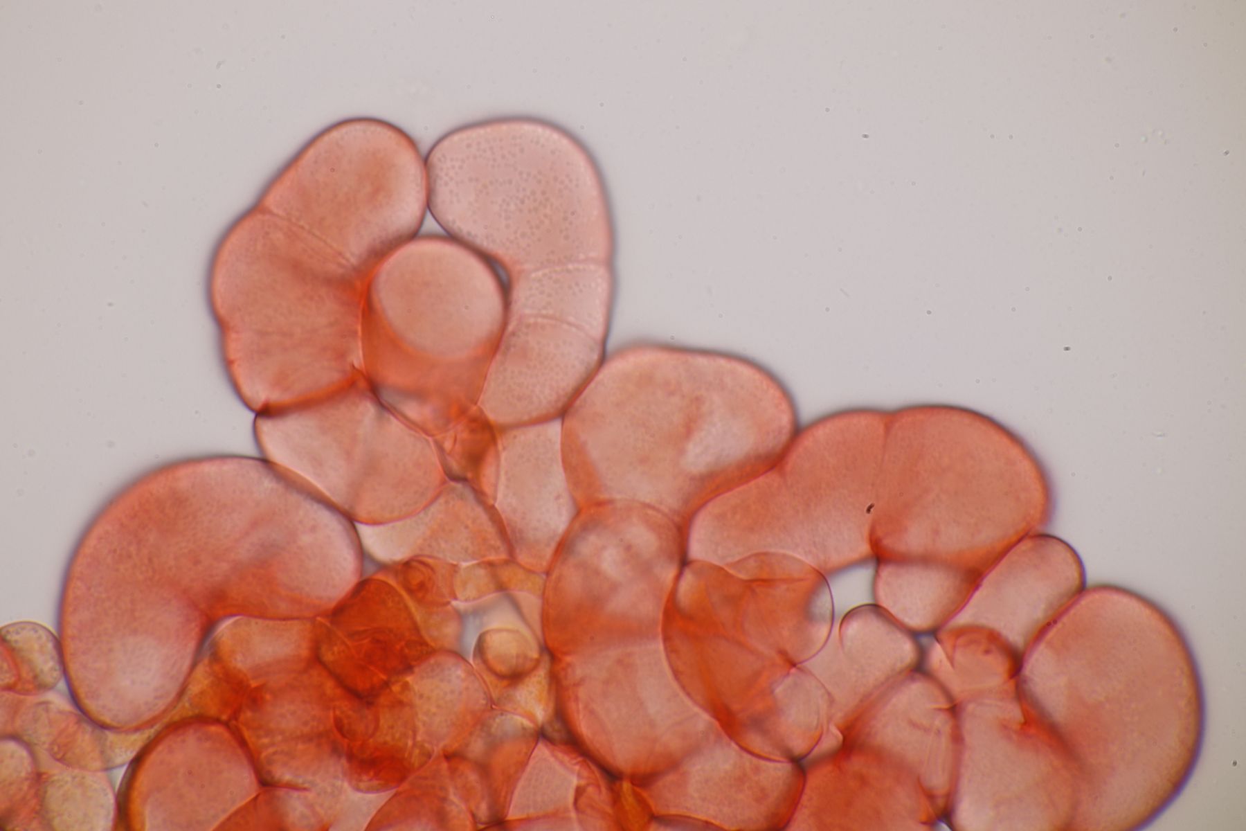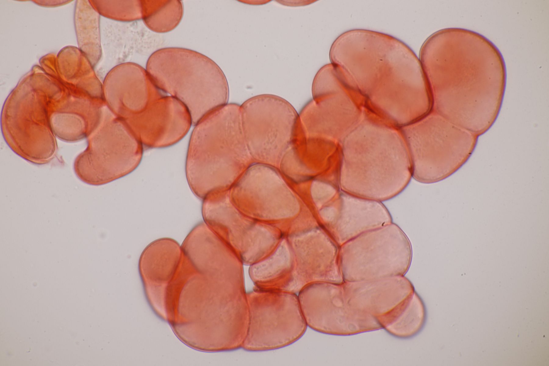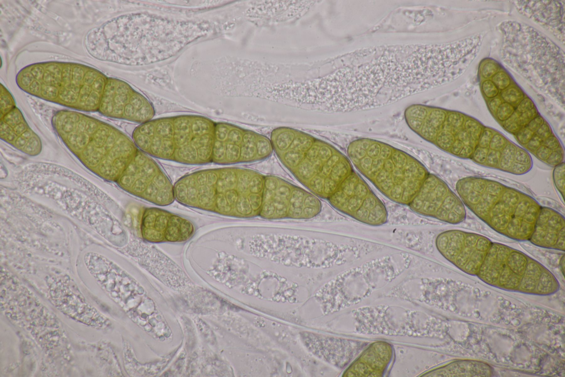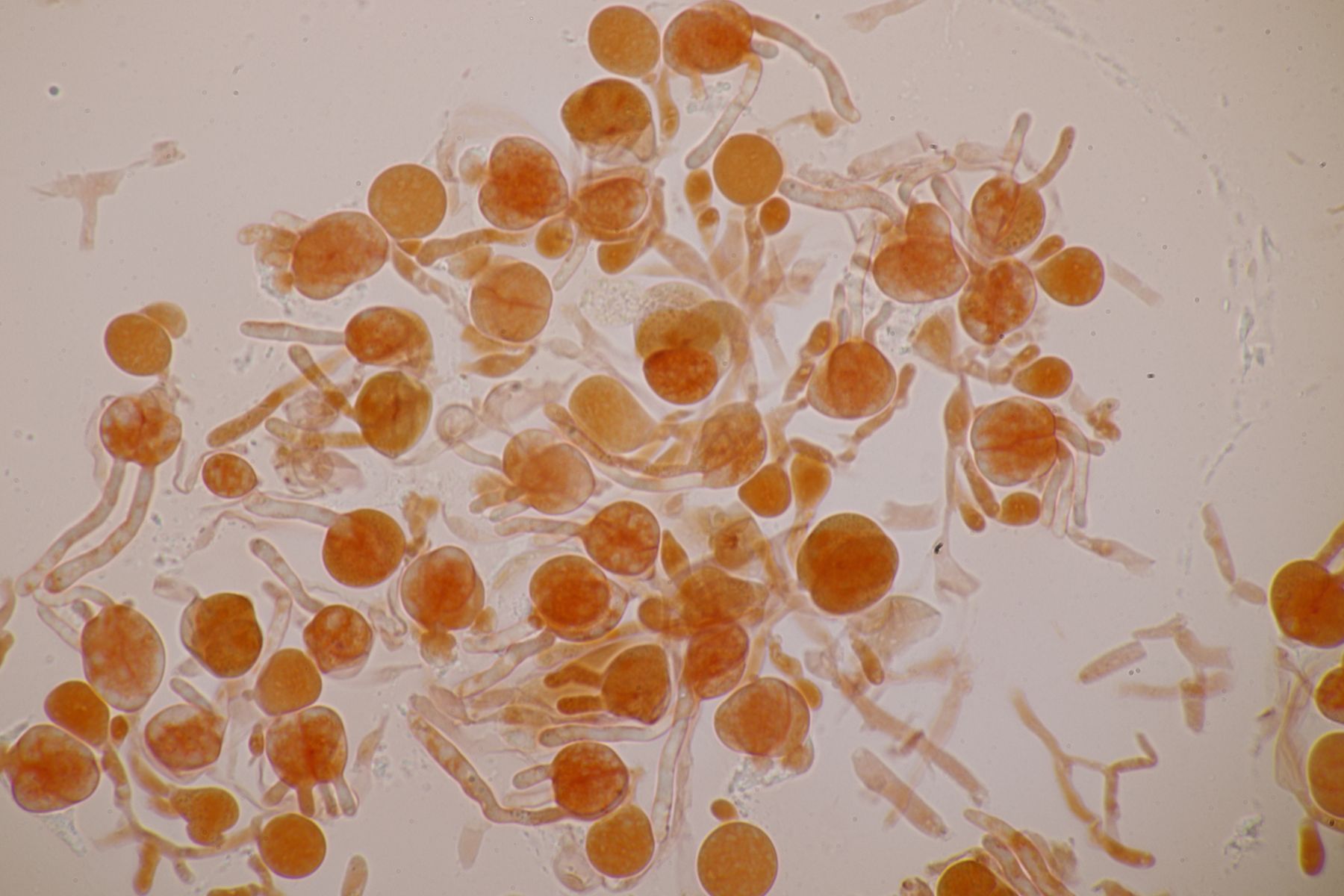 6. Noch ein Sirobasidium, ebenfalls neu für den Volksgarten: Die runden, vierfach septierten Basidien bringen uns hier zu Sirobasidium albidum.