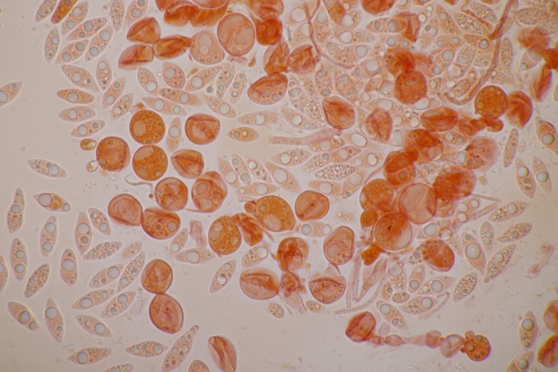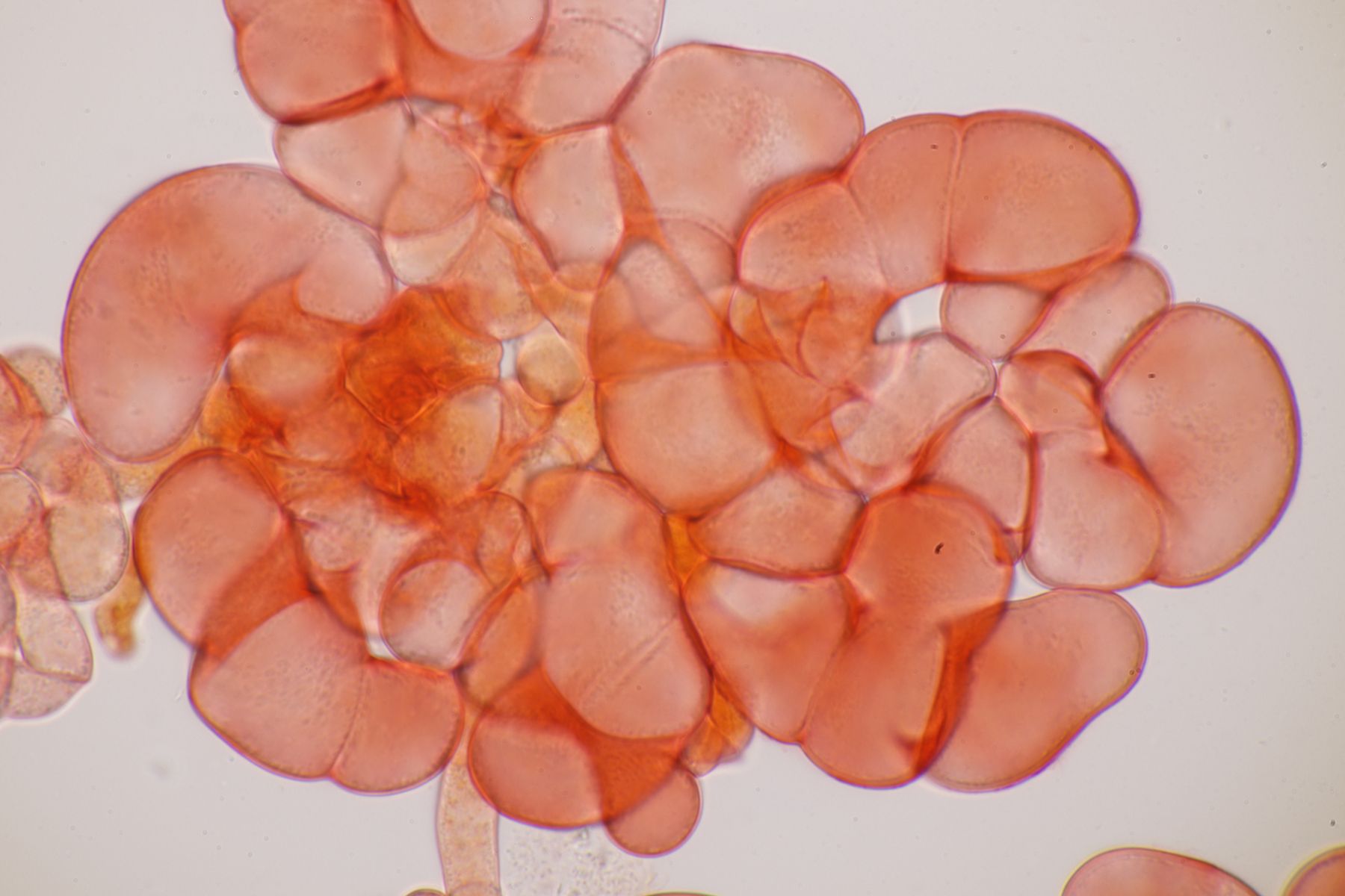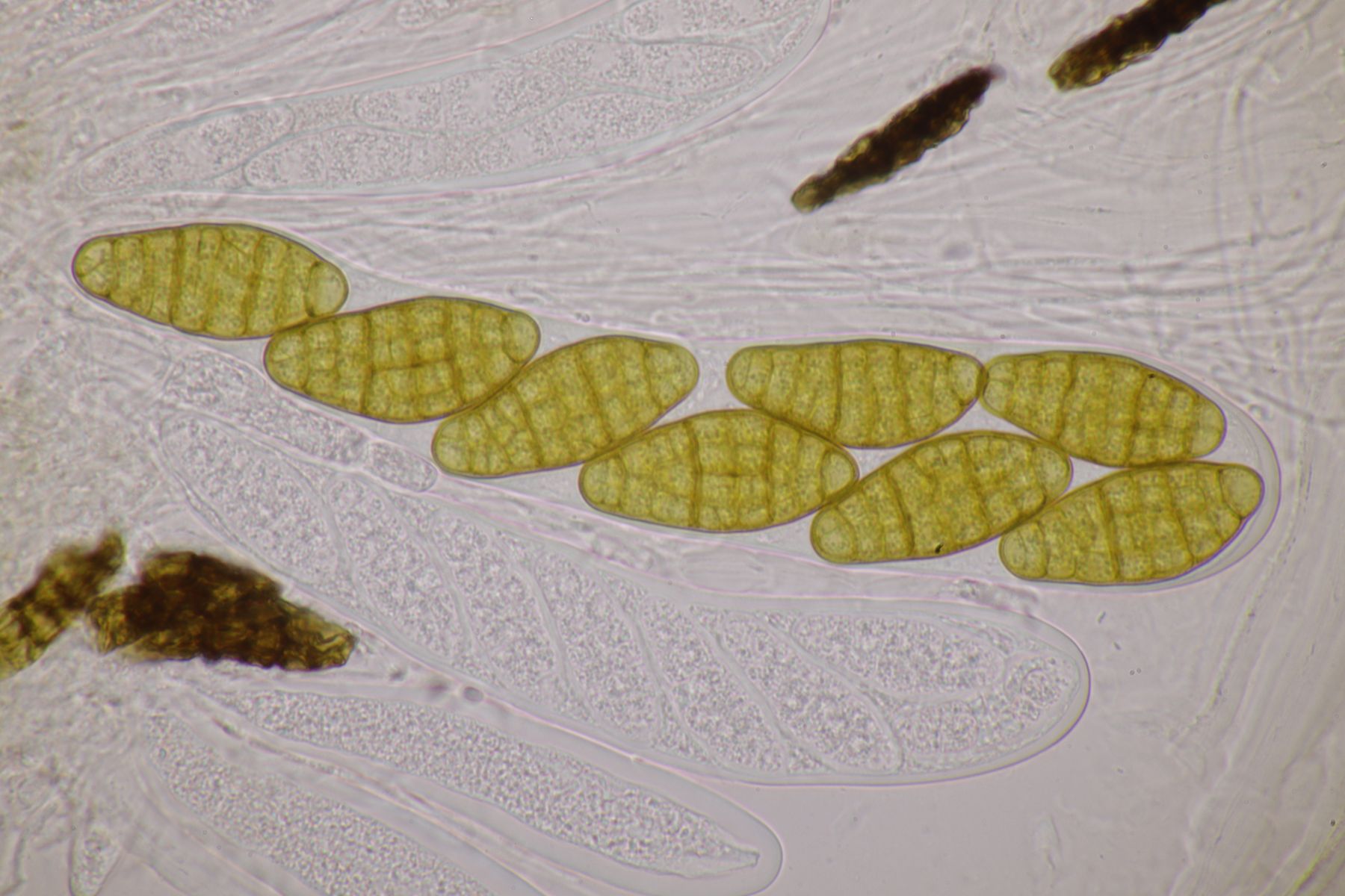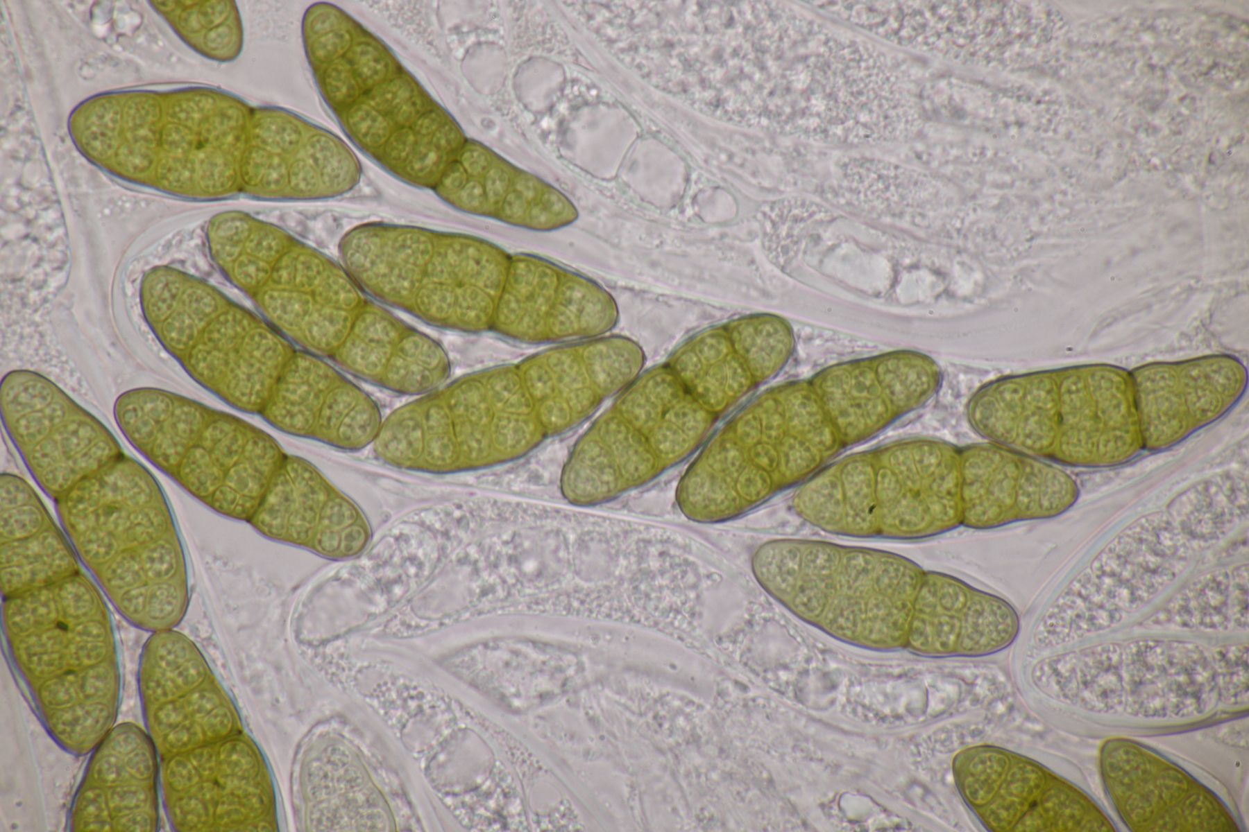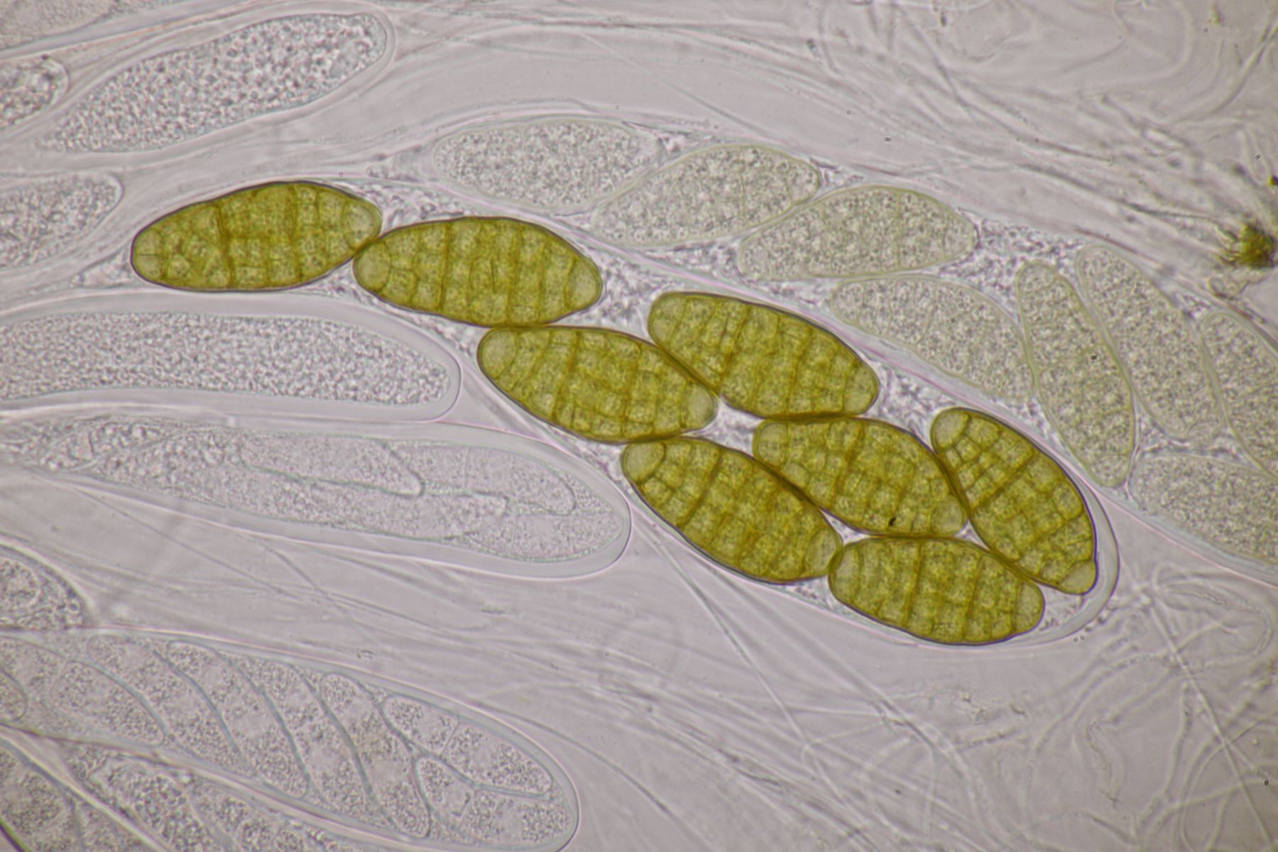 6. Noch ein Sirobasidium, ebenfalls neu für den Volksgarten: Die runden, vierfach septierten Basidien bringen uns hier zu Sirobasidium albidum.