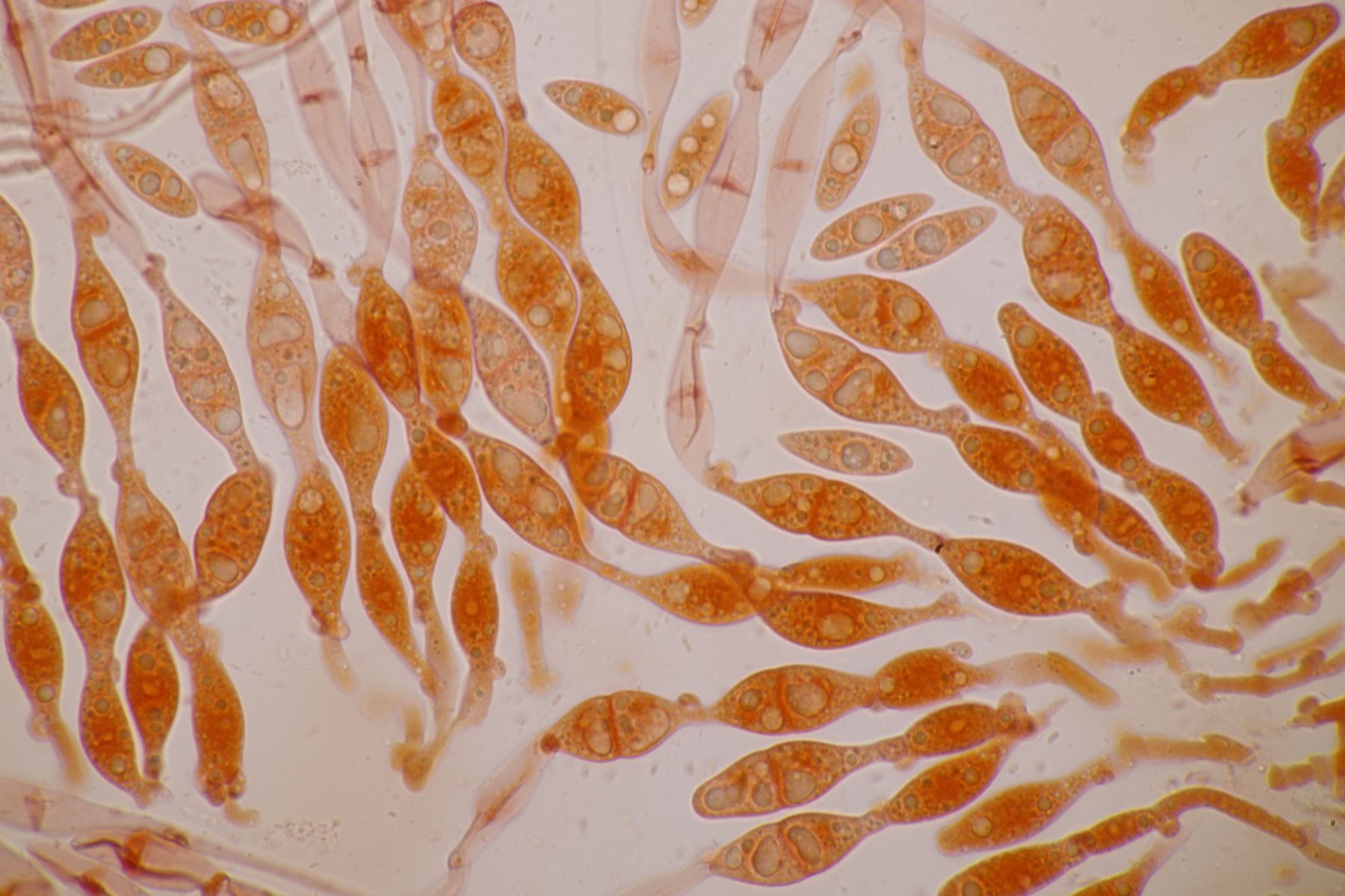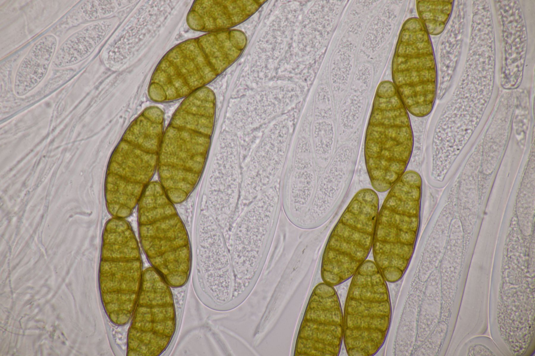 3. Sirobasidium brefeldianum an Linde. Die Art hatte ich vor einem Jahr schon im Mülheimer Stadtwald gefunden, dort ebenfalls an Linde. Mit den länglichen, zweizelligen Basidien, die in Ketten angeordnet sind, ist die Art mikroskopisch leicht anzusprechen. Witzigerweise hatte ich mir ein Stück Ast mit dem Pilz abgebrochen, das zu lang für meinen Sortimentskoffer war. Ich hab den Ast also lose in der Hand mit mir rumgetragen, bis mir irgendwann auffiel, daß ich den Pilz nicht mehr bei mir hatte. Also wieder zurück zu den verschiedenen Stationen, wo ich mir Dinge angeschaut hatte. Immer Fehlanzeige. Also war klar, daß ich den Stock in einem Stück mit Pappeln hab liegenlassen, wo es jede Menge umgestürzter Bäume gab und wo ich keine echte Orientierung hatte. Also hatte ich den Ast an der Stelle schon abgeschrieben. Im Laufe der Tour kam ich dann aber von der anderen Seite an das Pappelwäldchen und konnte eine Stelle wiedererkennne, an der ich vorher schon mal war. Von da konnte ich mich dann langsam vorarbeiten bis zu der Stelle, wo ich den Ast hatte liegenlassen. Die ganze Mühe hat sich also gelohnt, nicht nur, weil der Pilz mikroskopisch hübsch ist, sondern auch, weil er neu für den Volksgarten ist.