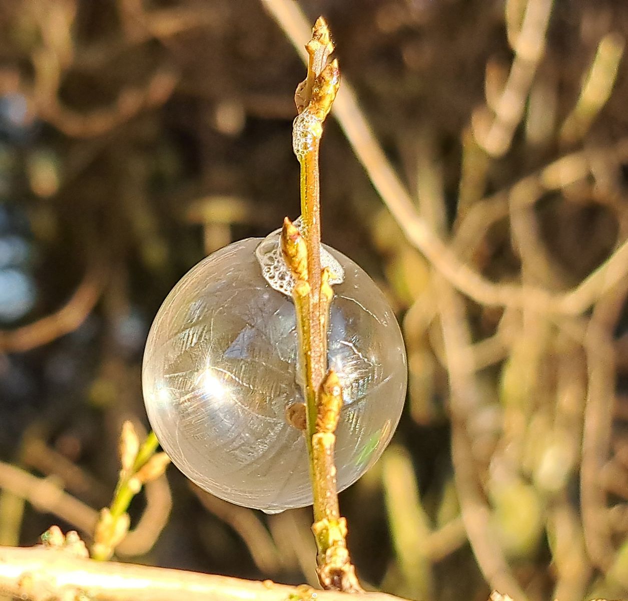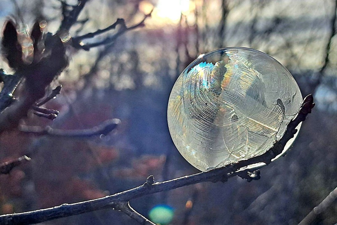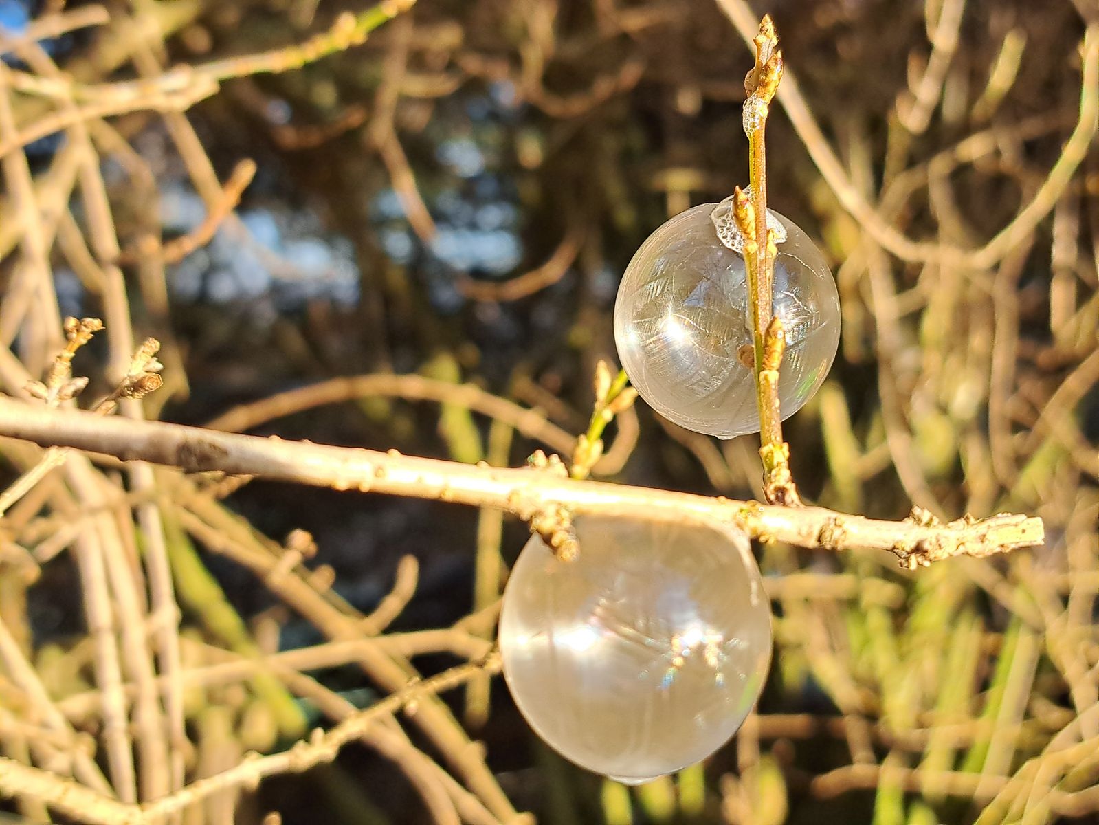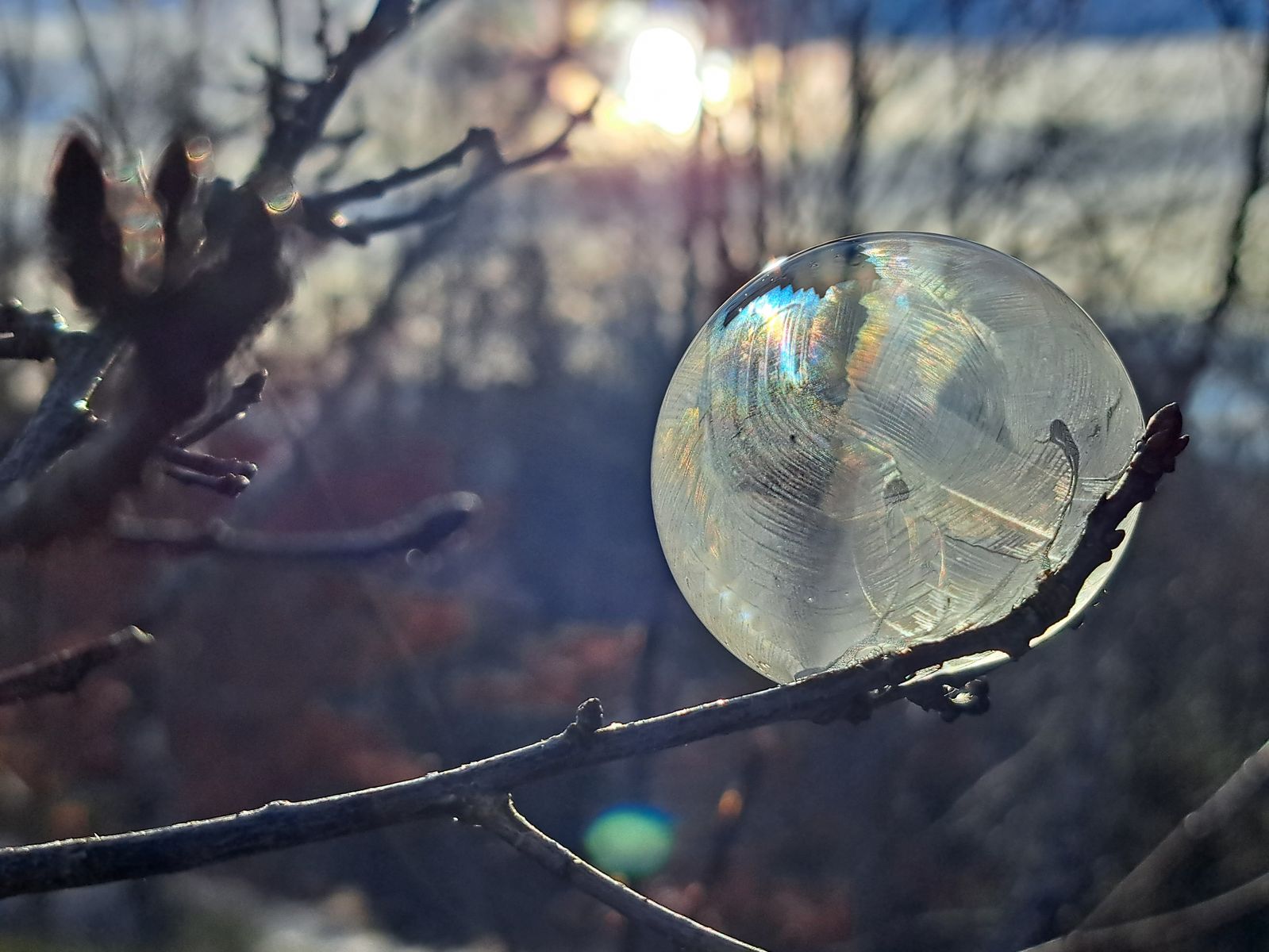 Neuer Versuch Glasplatte vor Hecke. Geht besser - toll, dass sich einige Blasen an einem Ast verfingen - und die aufgehende Sonne dazu - TOLL !