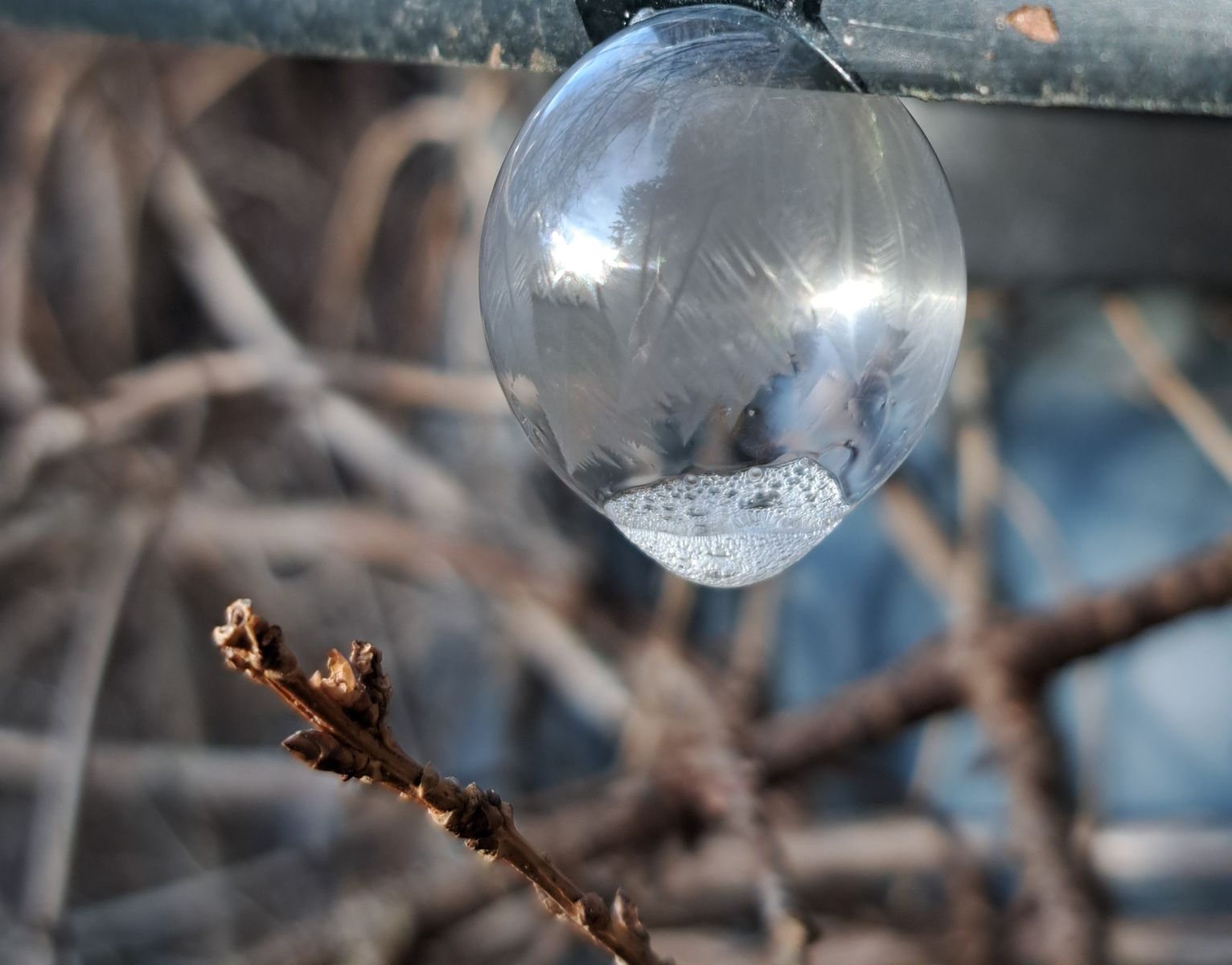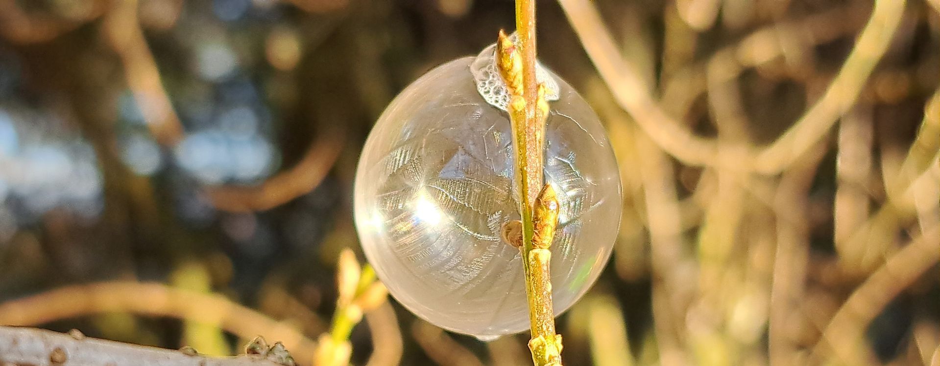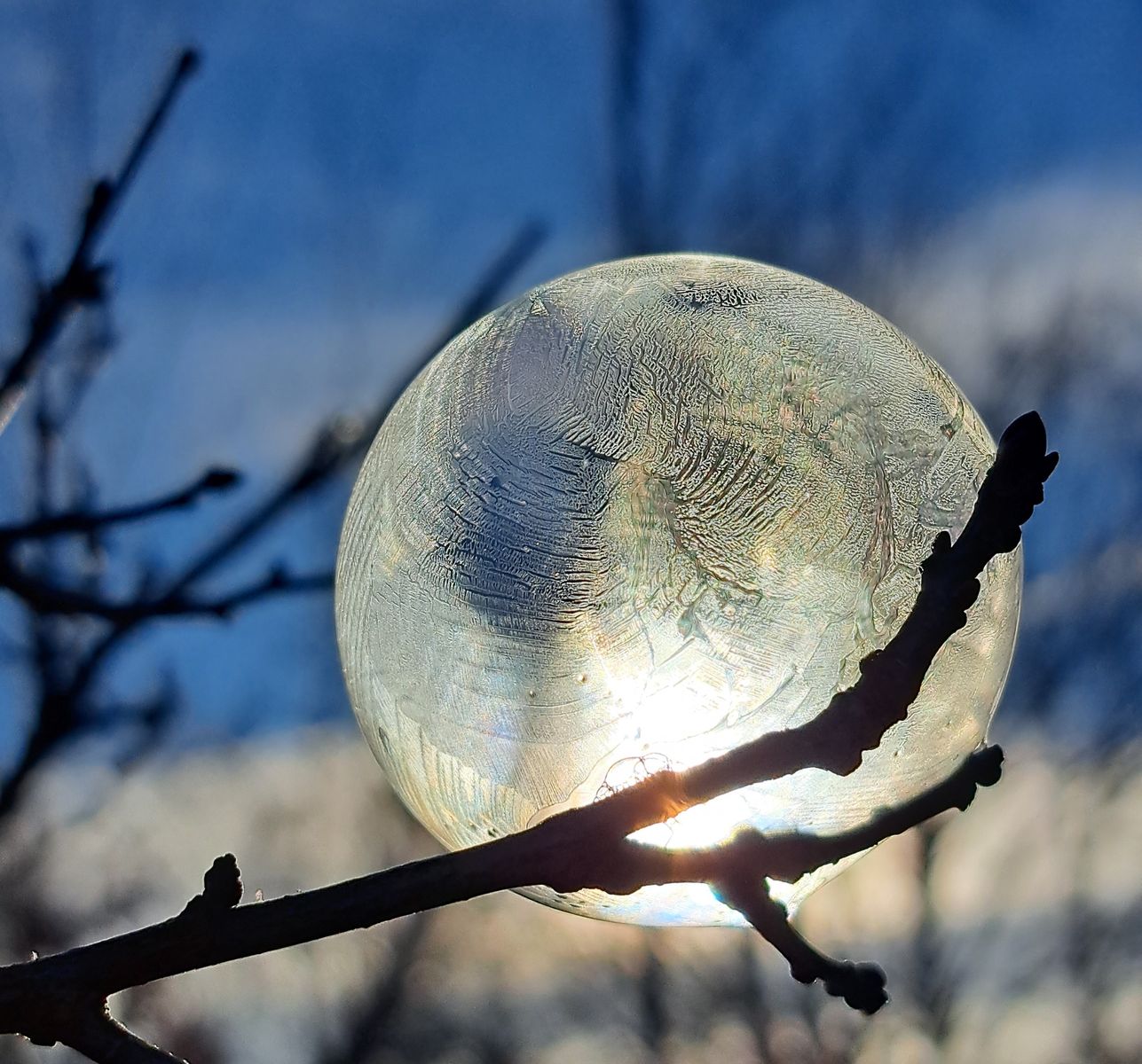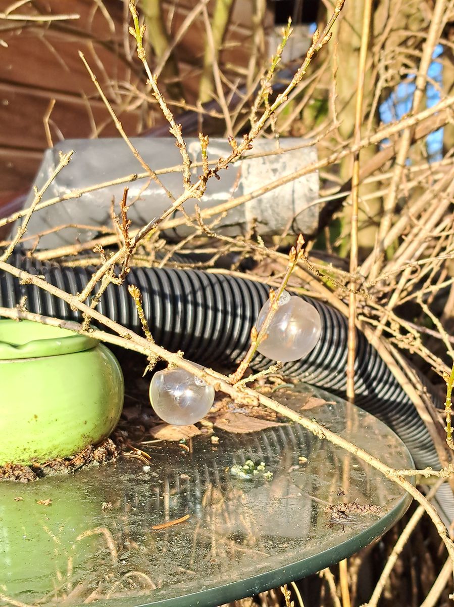 Neuer Versuch Glasplatte vor Hecke. Geht besser - toll, dass sich einige Blasen an einem Ast verfingen - und die aufgehende Sonne dazu - TOLL !