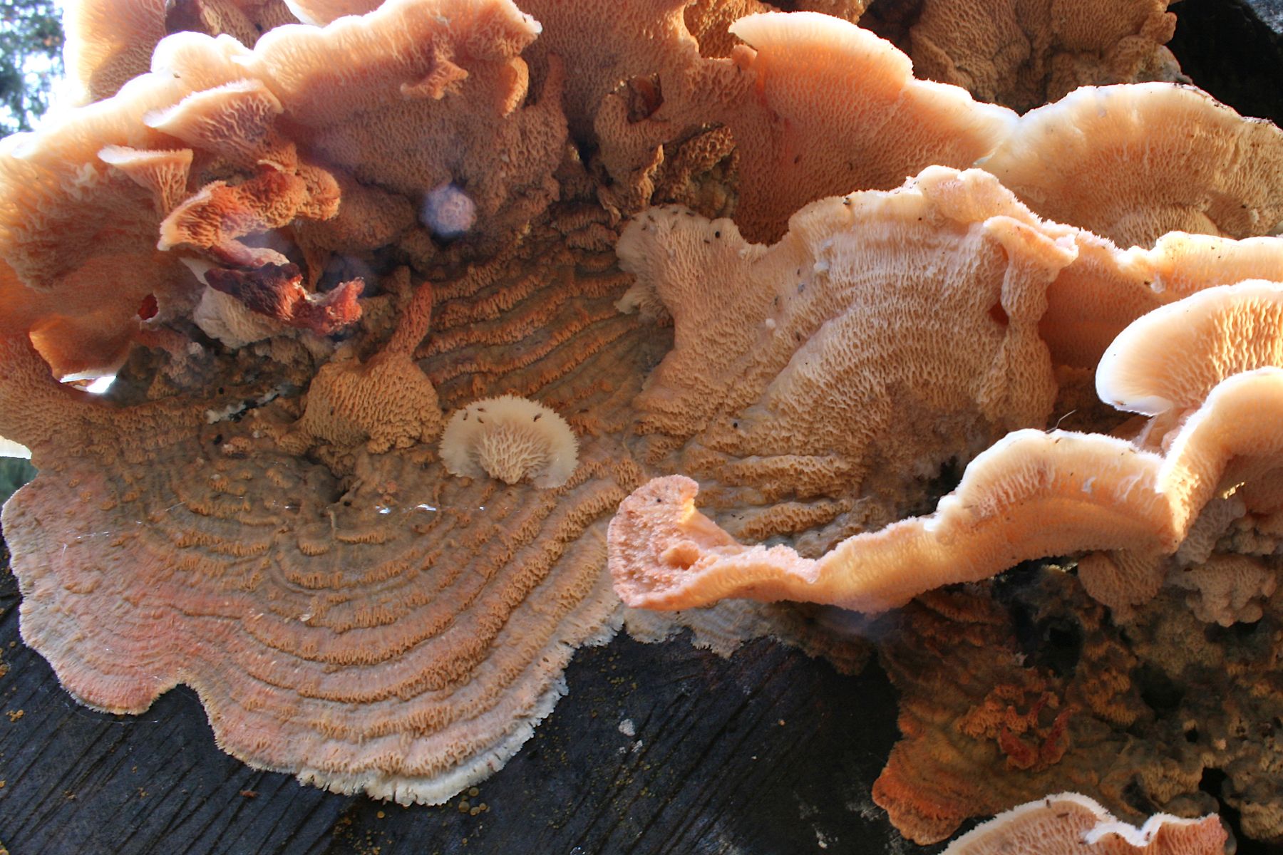 Ich favoritisiere nachwievor den Wilden Hausschwamm (Serpula himantioides) – noch mal ein Foto vom jungen Zuwachsrand, da sind die Falten noch recht hell, rosa-bräunlich. Nach rechts oben hin sieht man den Farbverlauf zum "üblichen"/reifen Zustand.