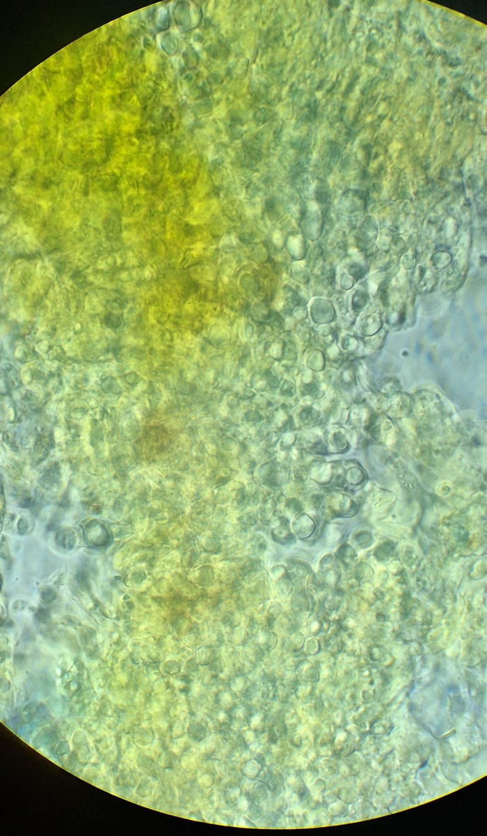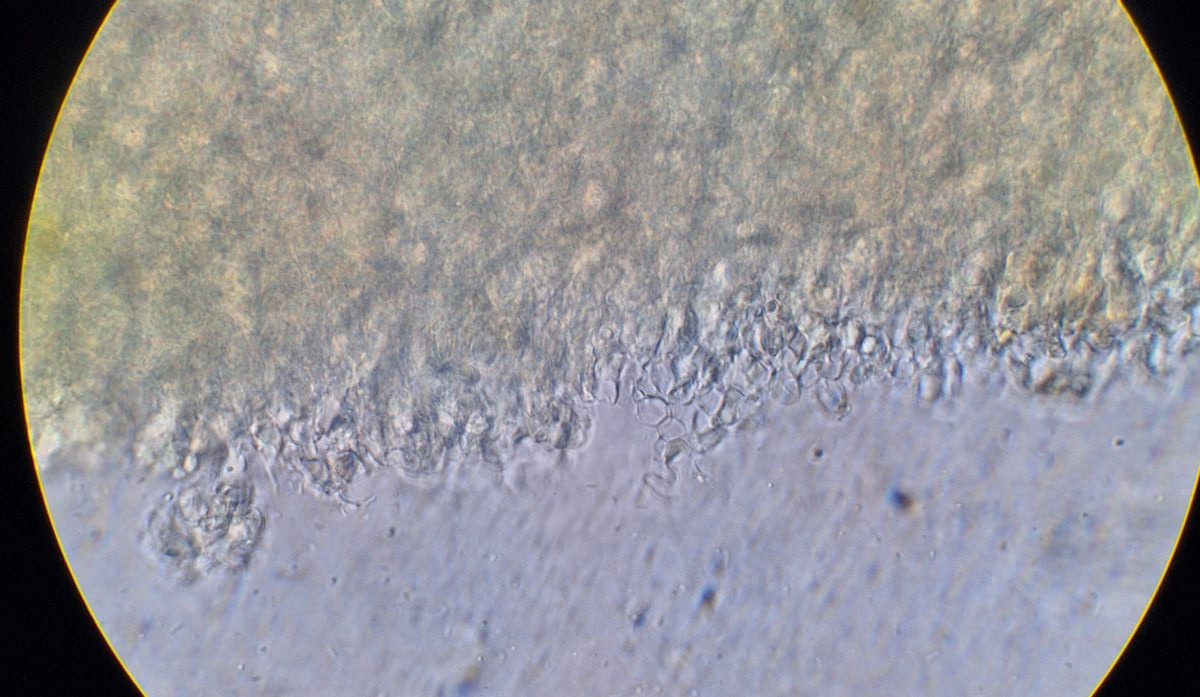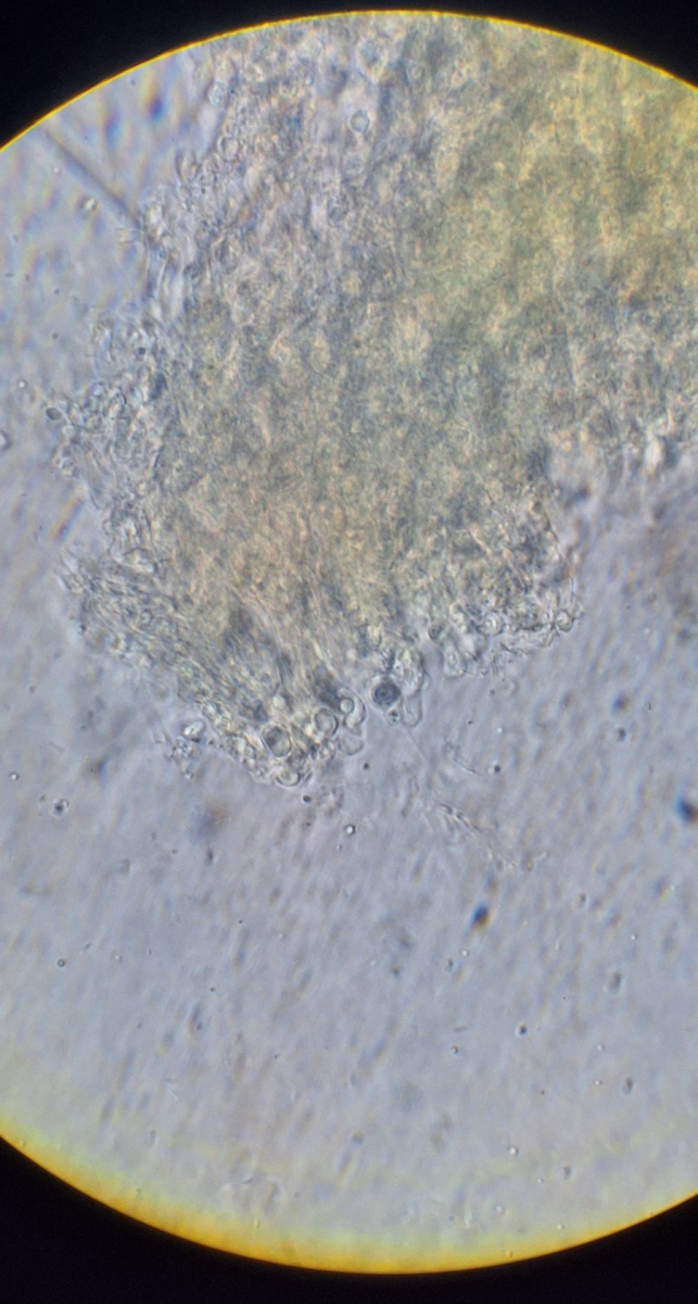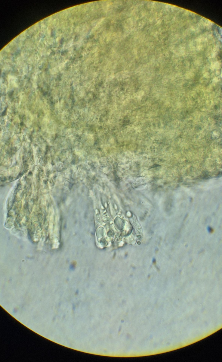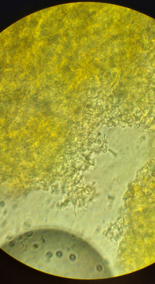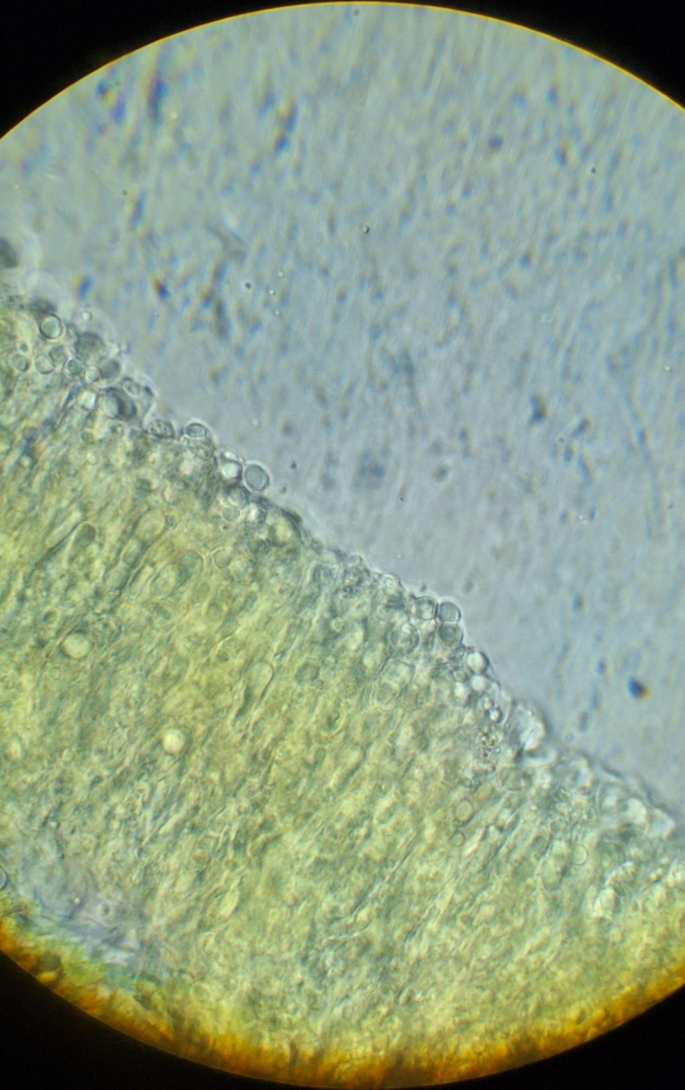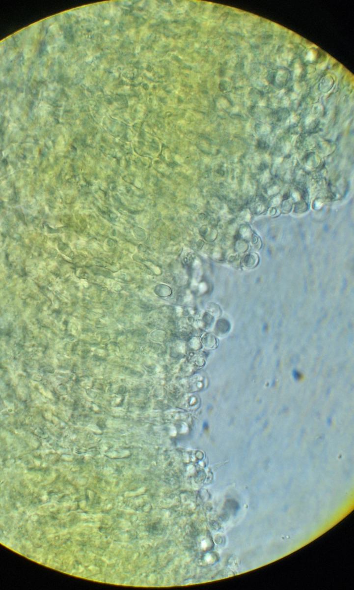 Nur mit der Rasierklinge etwas von der Oberfläche kratzen, im Präparat müssen gar keine dicken Stücke sein. Oder aufquellen lassen und dann mit 2 Nadeln zu Brei zerpflücken (nicht zu sehr quetschen, irgendwann kriegt man damit auch Sporen platt). Hauptsache, die Sporen schwimmen frei herum.