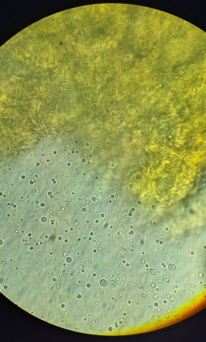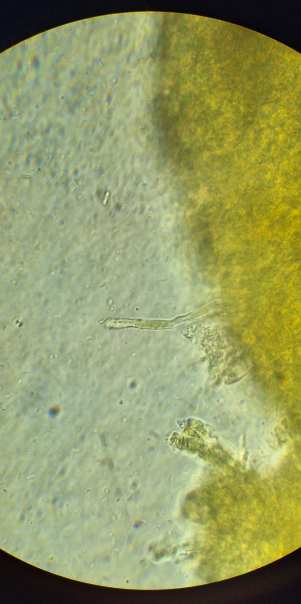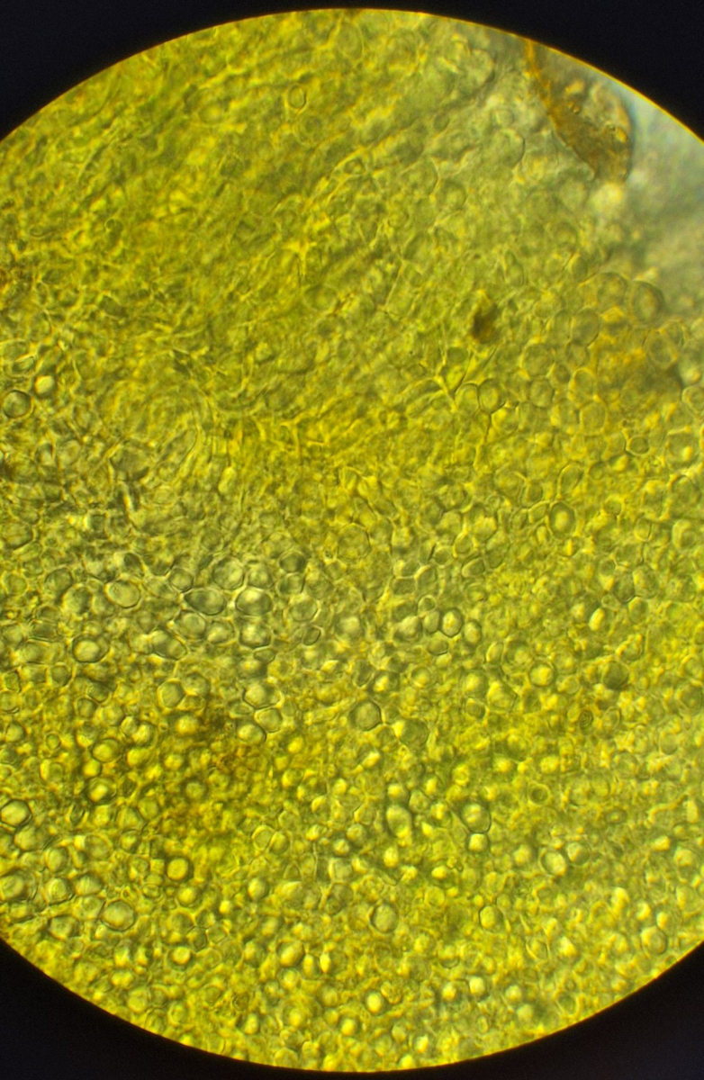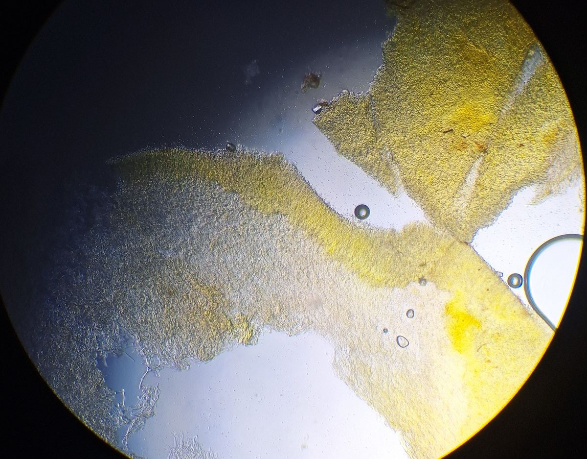 Nur mit der Rasierklinge etwas von der Oberfläche kratzen, im Präparat müssen gar keine dicken Stücke sein. Oder aufquellen lassen und dann mit 2 Nadeln zu Brei zerpflücken (nicht zu sehr quetschen, irgendwann kriegt man damit auch Sporen platt). Hauptsache, die Sporen schwimmen frei herum.