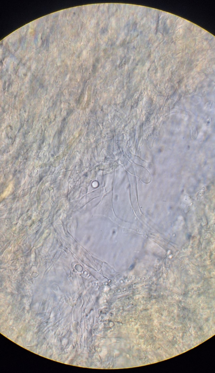 Überall nahezu kreisrunde Sporen verschiedener Größe (also wohl vielfach unreif) bis zu 4 µm im Durchmesser, glatt, womit C. helvola raus ist. C. laeticolor konnte passen.