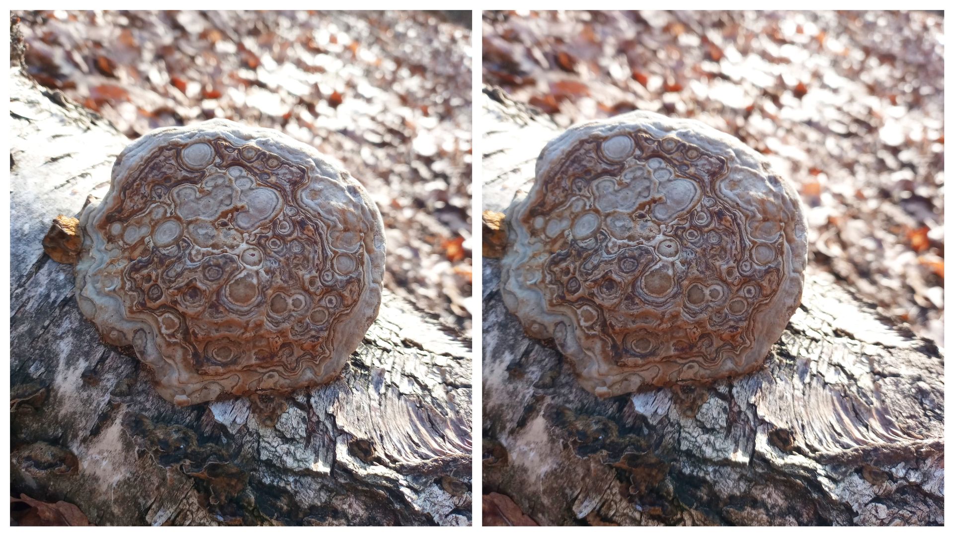 Gute Idee! Was ist bei Pilzen schon sicher. Die Fruchtkörper der übrigen Fruchtkörper waren alle sichtbar "richtig" ausgerichtet. Auch der 2. Fruchtkörper mit dieser seltsamen Hautstruktur war mit dieser deutlich zum Zenit gerichtet. Der Stamm machte schon mit seiner Größe nicht den Eindruck, dass er bewegt wurde. Ich habe noch ein 3-D Bild. Wer den Parallel-Blick beherrscht, kann vielleicht mehr erkennen (so ist mir erst die Tramete unter den Pilz aufgefallen).
