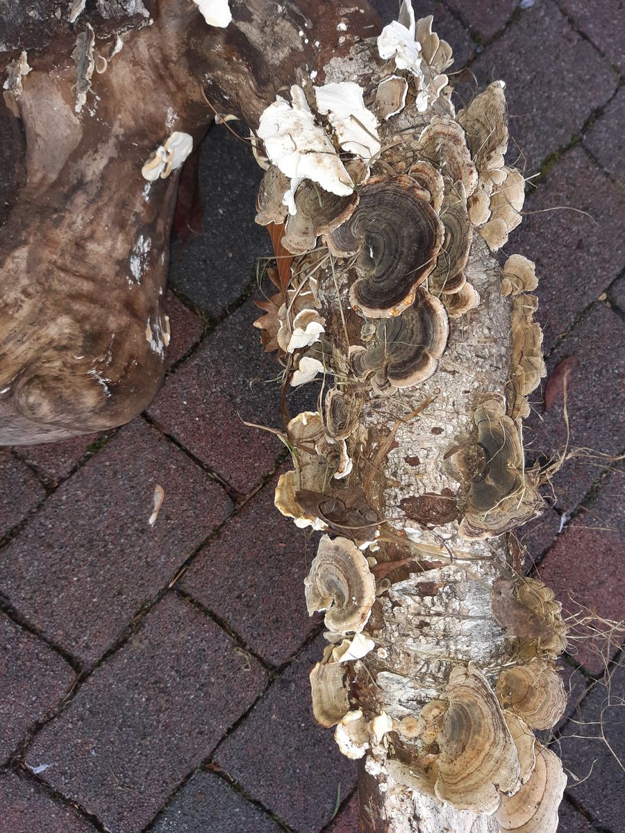 Den Birkenstamm hatte ich im Garten liegen und ihn aufzuarbeiten. Kerzenhalter etc. Dann entdeckte ich die Pilze und wurde neugierig. Derr Seite 123Pilze entnahm ich, dass es ein Birkenporling sei könnte und es ein Vitalpilz sei.