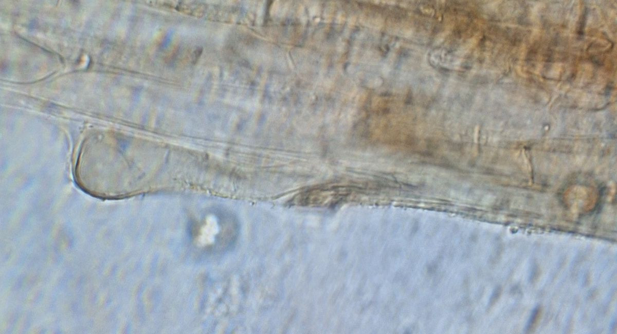 Schnallen kann ich nirgends erkennen. Auffällig ist aber, dass die Septen vielfach nicht senkrecht sondern schräg zur Faser verlaufen. Und an den Septen gibt es teils Einschnürungen. Inkrustierungen am Rand, wenn ich das richtig interpretiere.