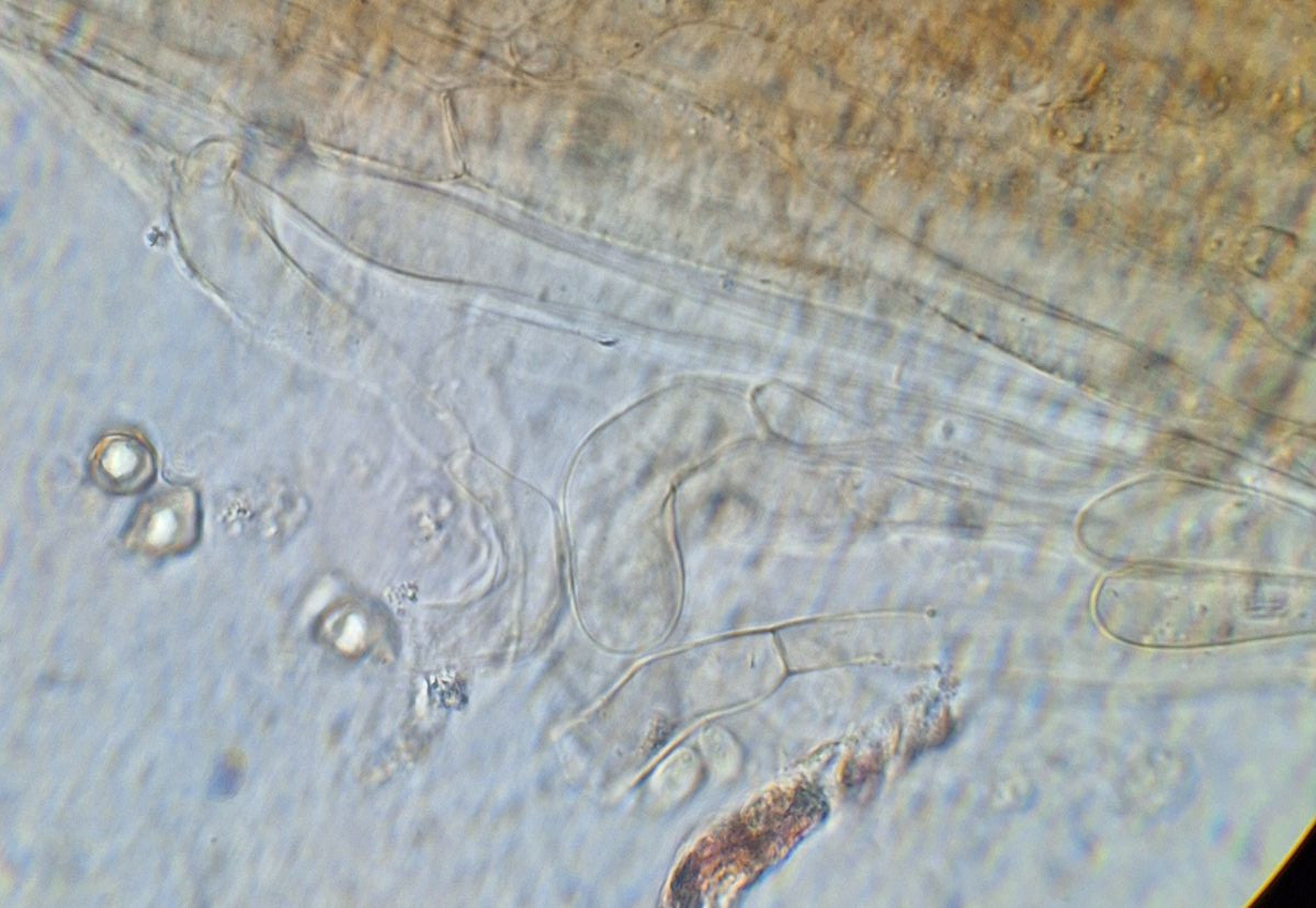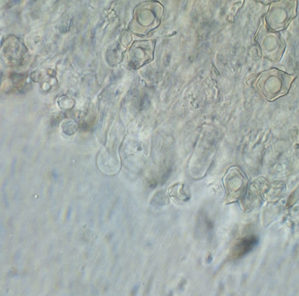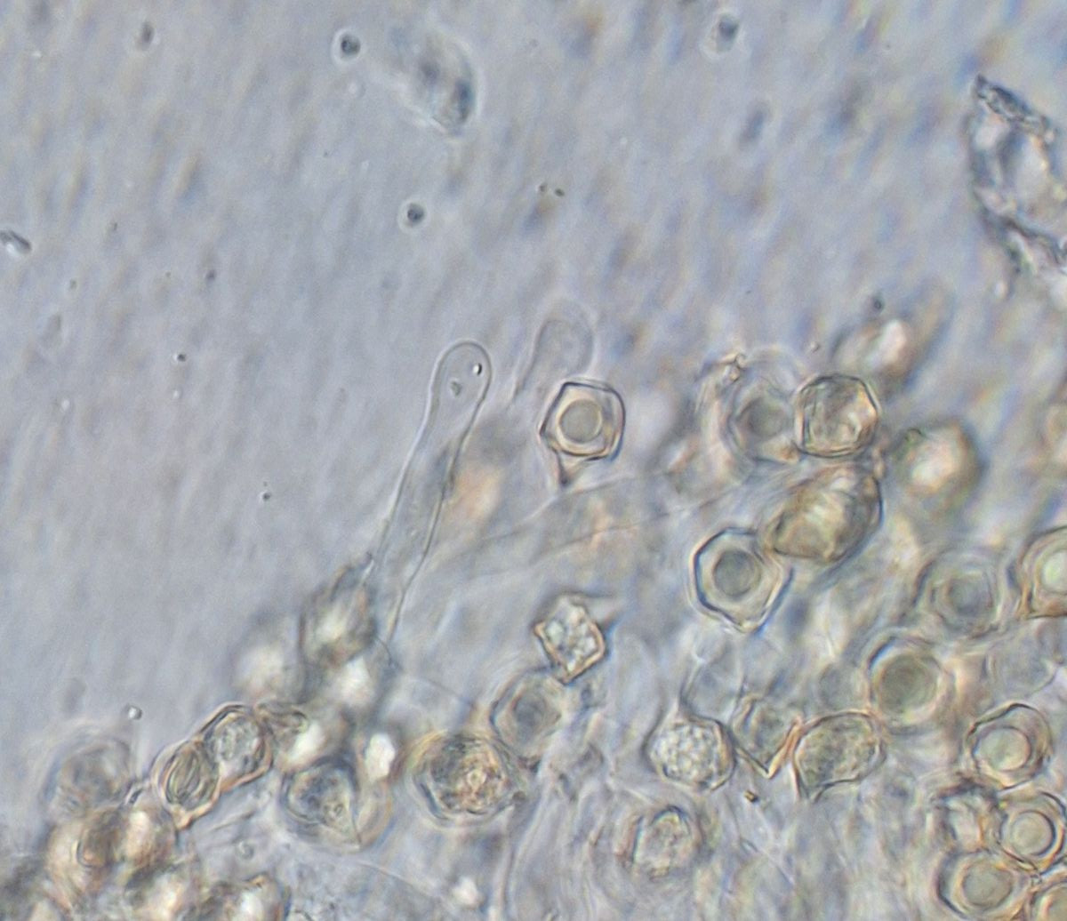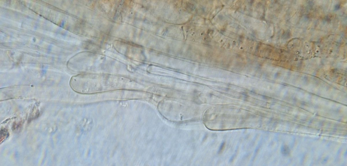 Die Cheilozystiden haben eine auffällige Form, teils mit kugelförmiger Spitze von 4-7 µm, die Länge kann ich selten erkennen, in den wenigen Fällen sind es 26-28 µm. Basidien wenigstens teilweise mit 4 Hörnern.