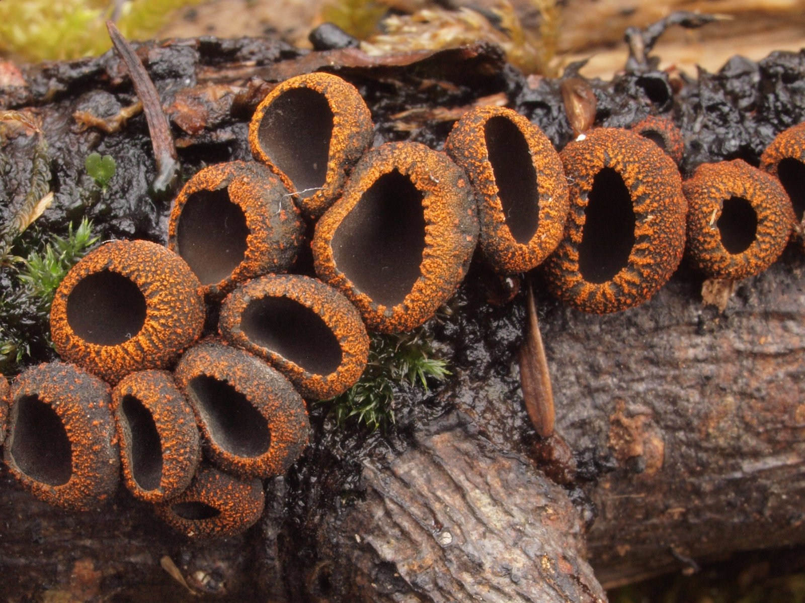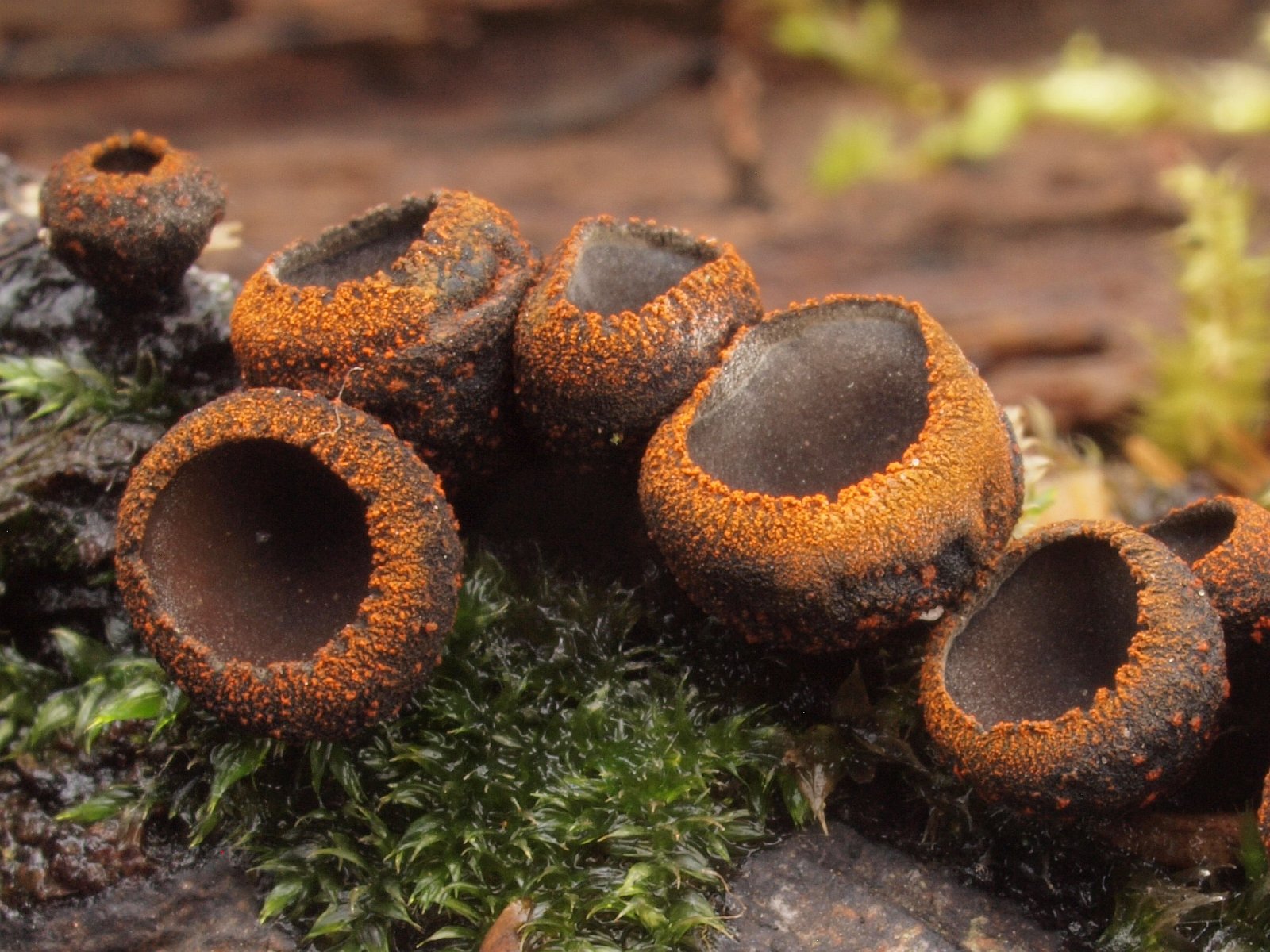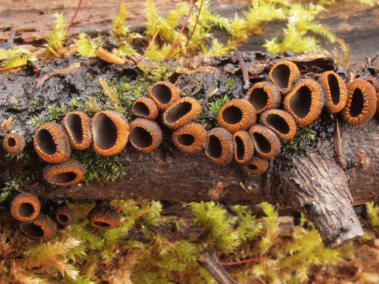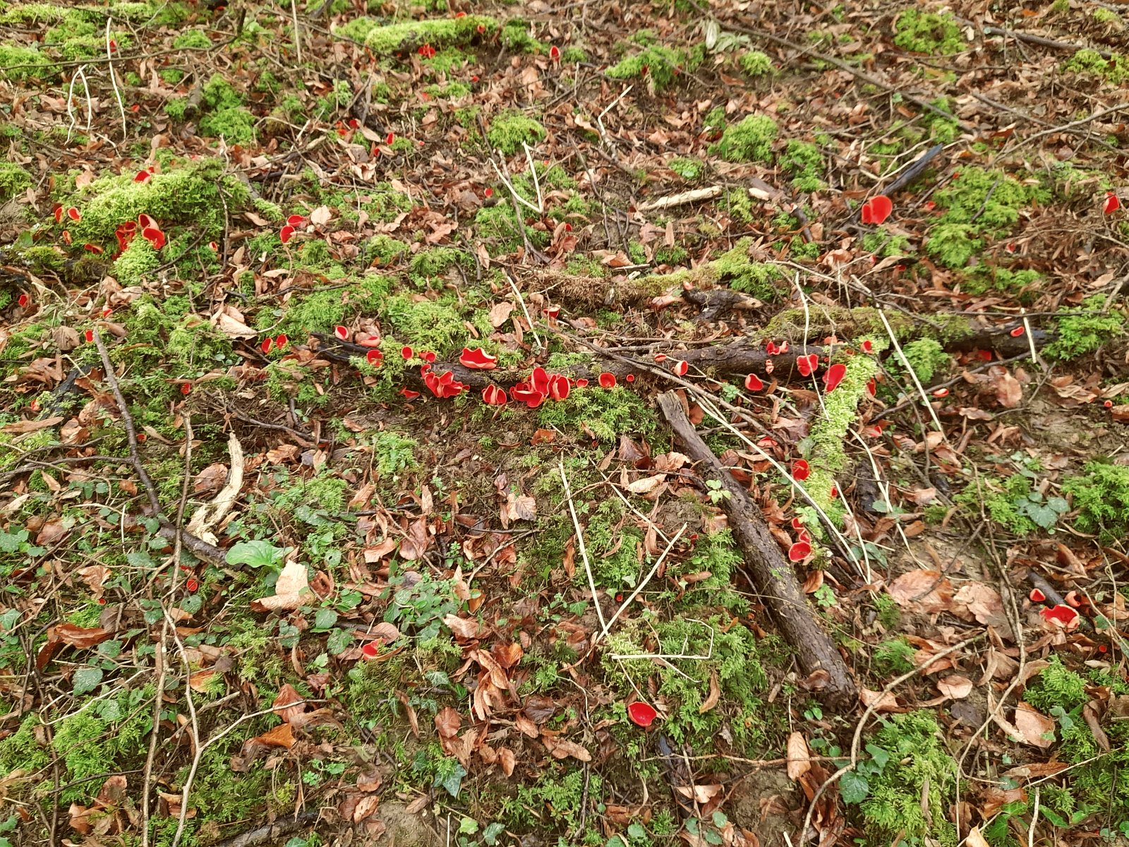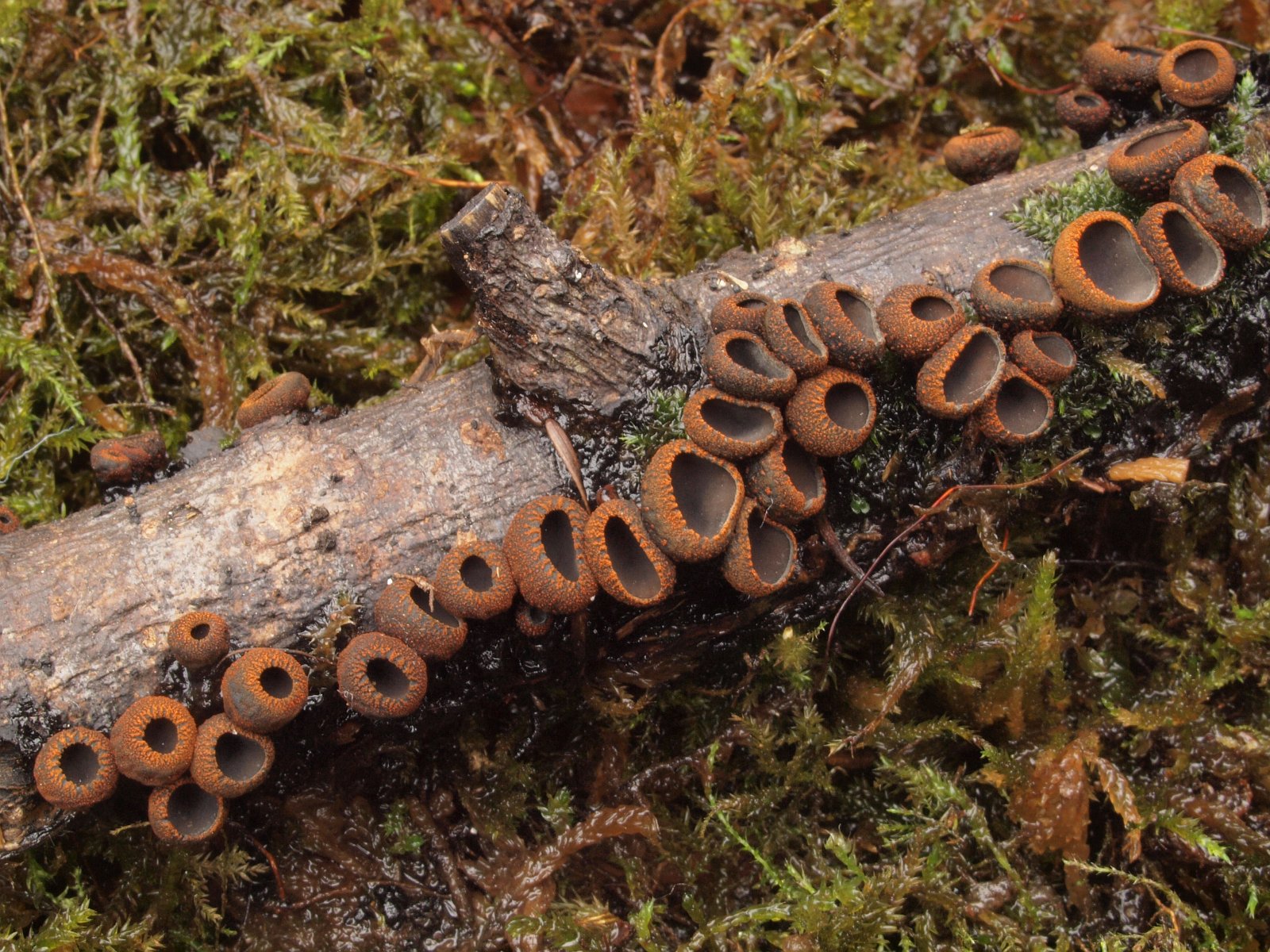 Der Knaller war aber ein dünner Zweig mit Schwarzmündigen Kelchbecherlingen (Plectania melastoma) in nie gesehener Zahl