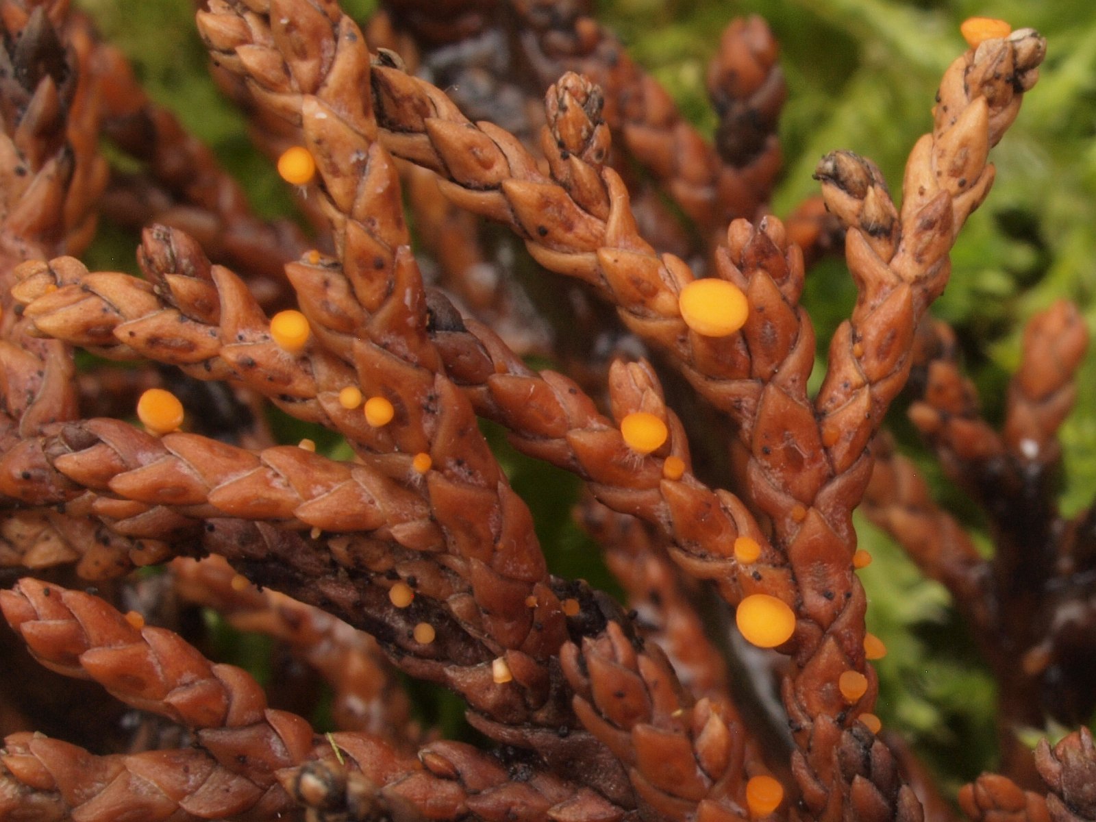 Nicht weit entfernt gab es an vertrockneten Zweigen den Sadebaum-Becherling (Pithya cupressina) in Massen, wobei die Größe von kaum einen Millimeter an der Grenze meiner fotografischen Möglichkeiten lag.