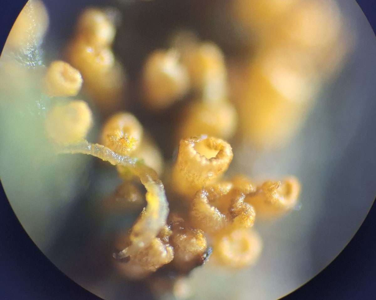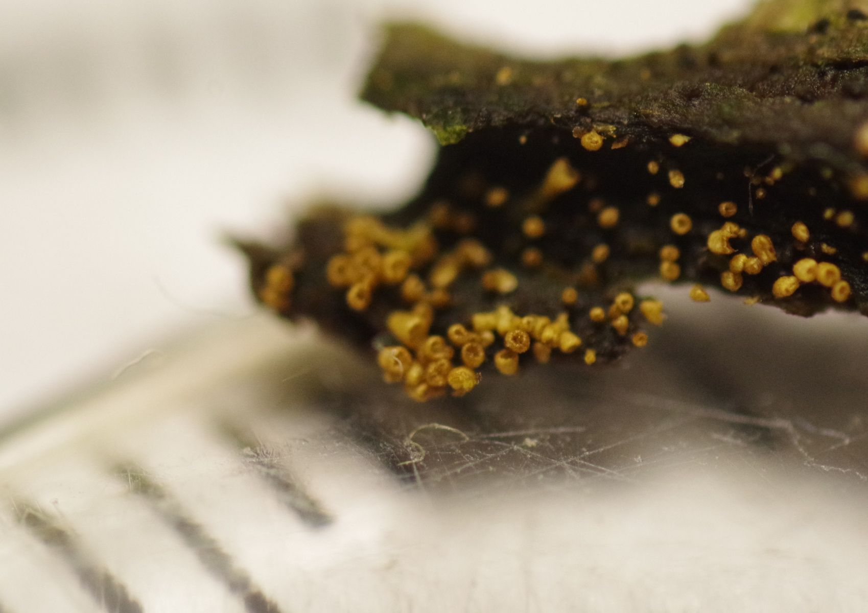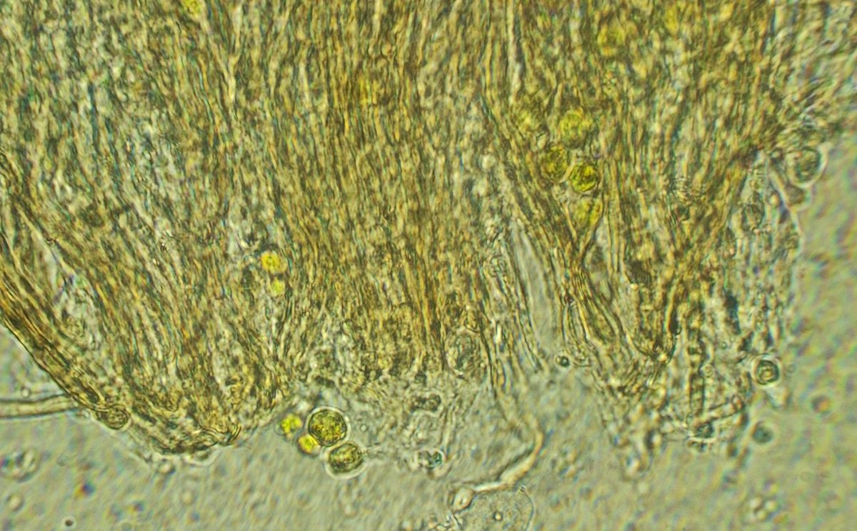 Und außer den grünlichen Kullerdingern sehe ich nichts, was Sporen sein könnten.