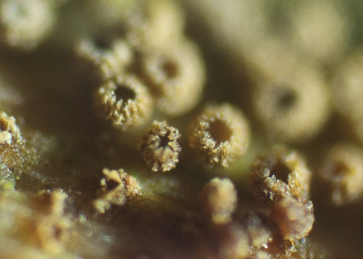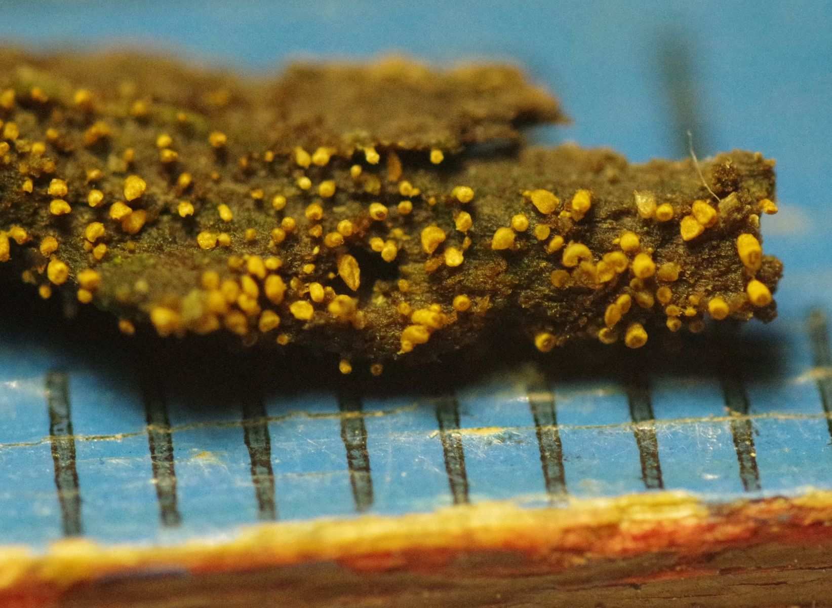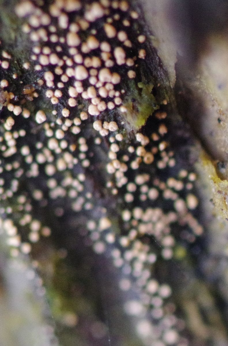 Mein Arbeitstitel war ja Cyphellopsis ochracea, der wird von Bridge Cooke 1957 (Sydowia Beihefte IV) ausführlich beschrieben u.a. mit Belegen aus D, PL und LV. Mal abgesehen davon, dass der da deutlich größer beschrieben wird (Durchmesser 0,2-0,6 mm, Höhe 0,5-3 mm) finde ich das nicht so abwegig. Kennt jemand diese Art oder gibt es irgendwelche anderen Vorschläge?