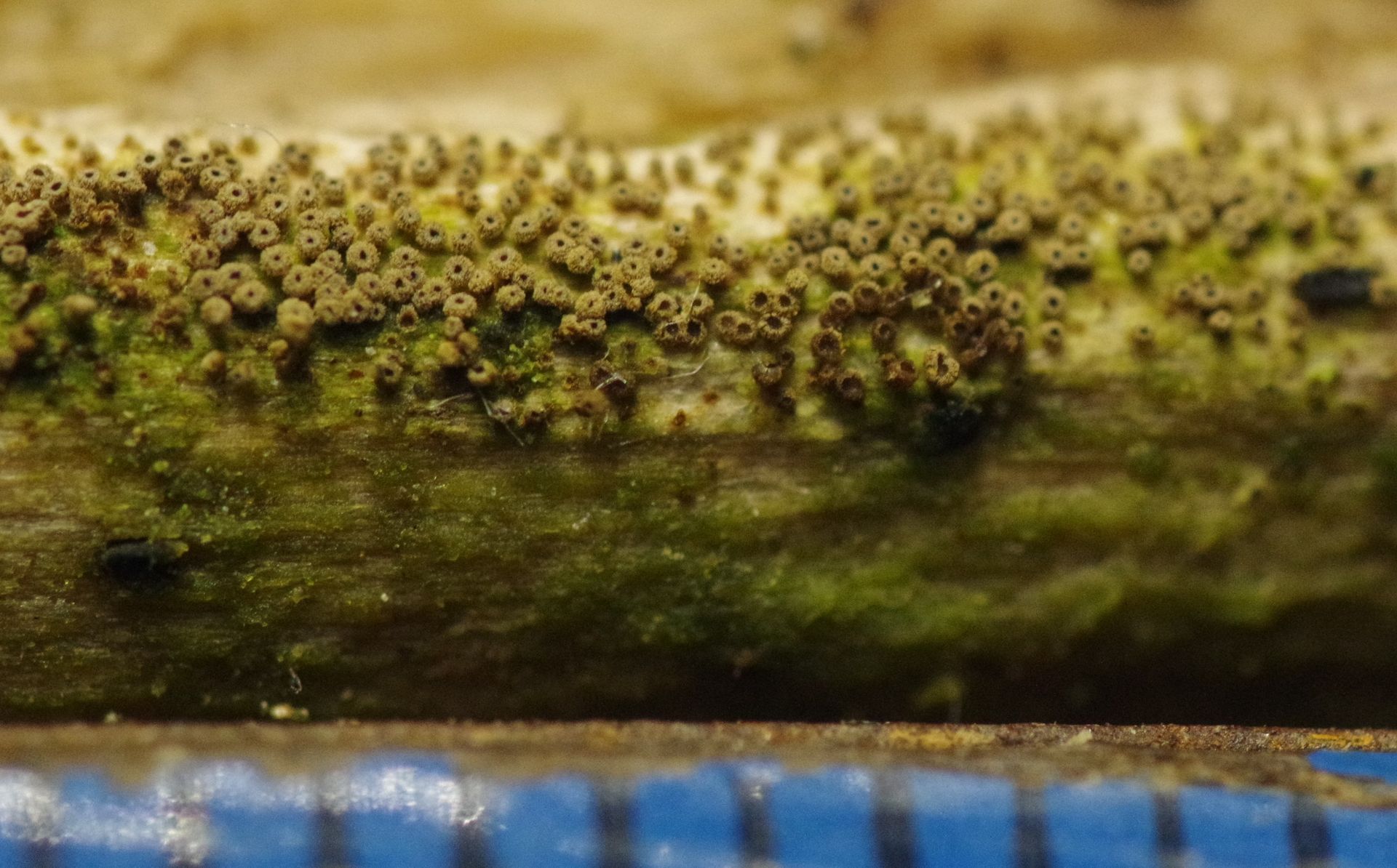 • Und schließlich noch ein dritter Pilz, an totem Zweig von Zitterpappel, so etwa in Augenhöhe. Unterseits wachsend. Max. 0,4 mm groß. Eher nicht glockenförmig, sondern flach. Dabei hätte ich erwartet, dass Merismodes anomale rasukommt. Im Vergleich mit Ingos Bildern kommt das vielleicht hin