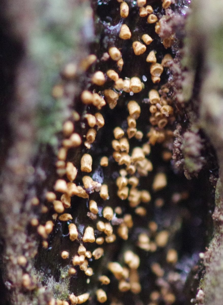 Mein Arbeitstitel war ja Cyphellopsis ochracea, der wird von Bridge Cooke 1957 (Sydowia Beihefte IV) ausführlich beschrieben u.a. mit Belegen aus D, PL und LV. Mal abgesehen davon, dass der da deutlich größer beschrieben wird (Durchmesser 0,2-0,6 mm, Höhe 0,5-3 mm) finde ich das nicht so abwegig. Kennt jemand diese Art oder gibt es irgendwelche anderen Vorschläge?