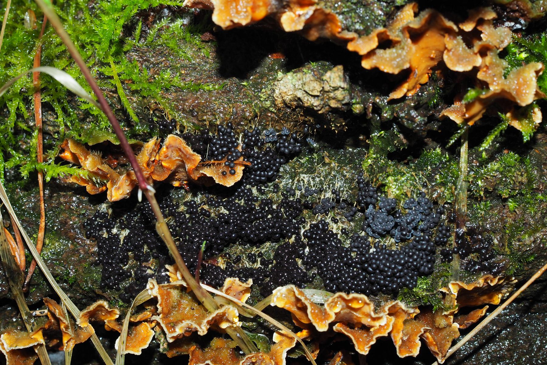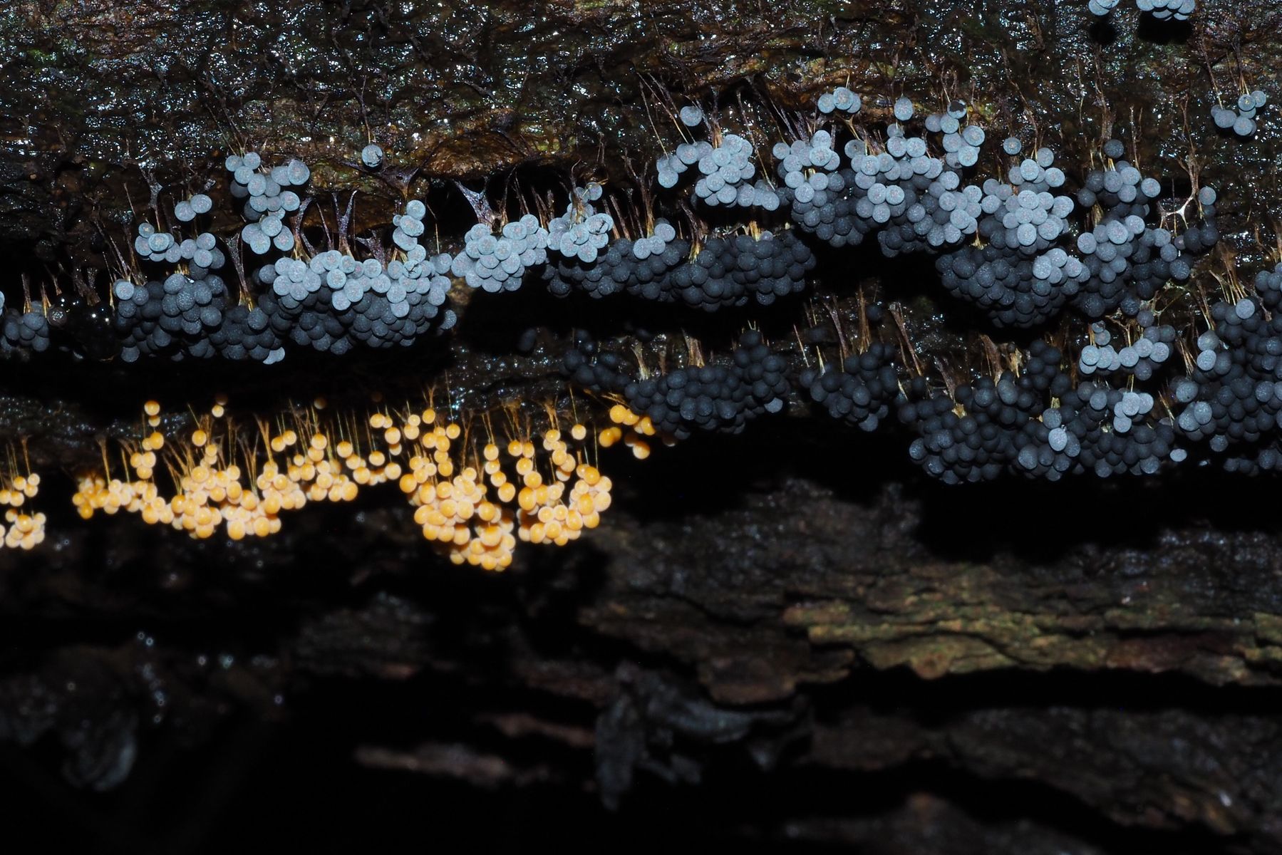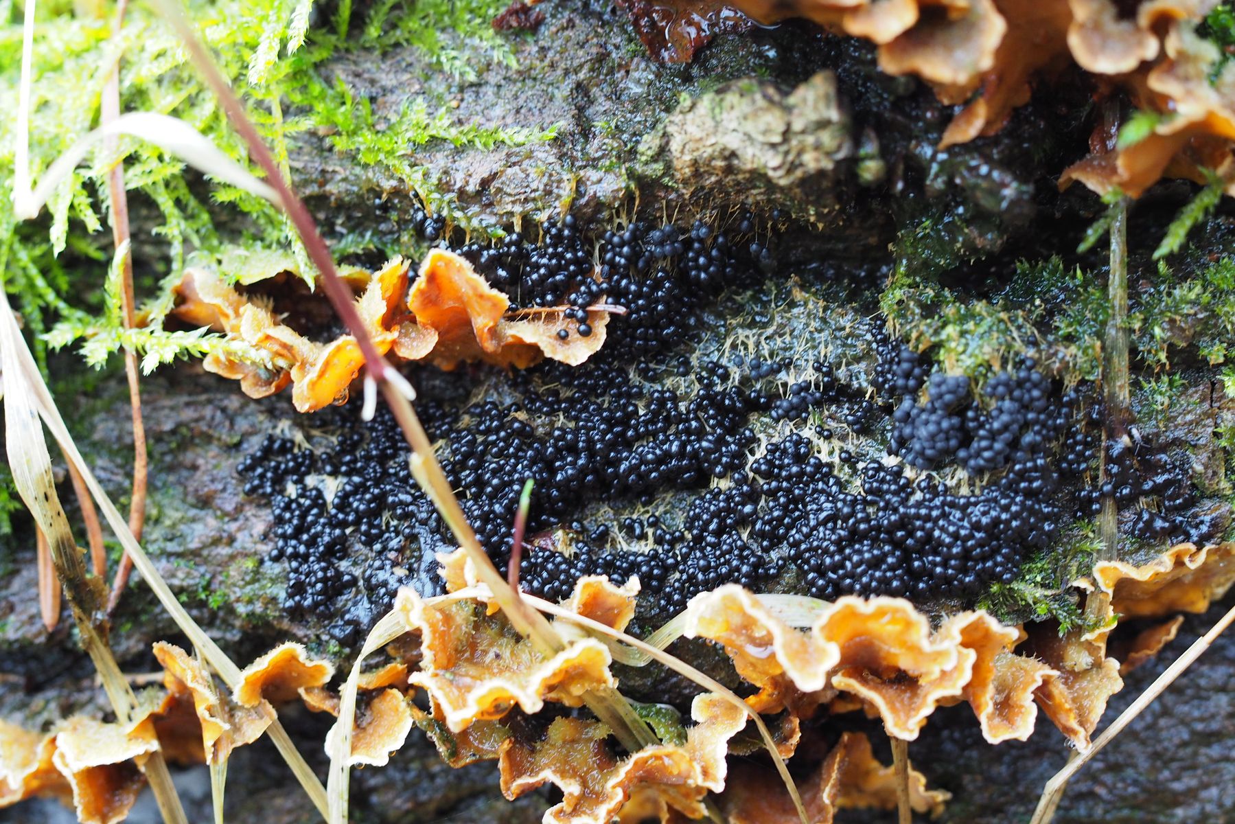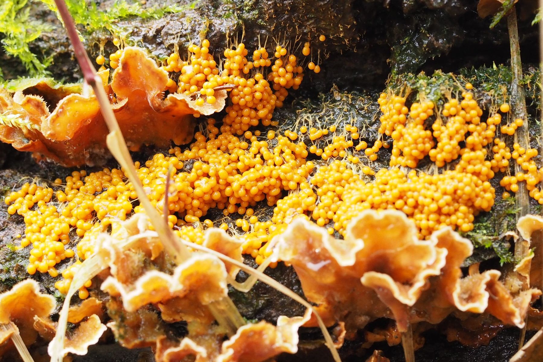 in den letzten Tagen, also Anfang Februar, habe ich an einem abgesägten alten dicken Eichenstamm seitlich bzw. etwas unterhalb sitzend den nachfolgend abgebildeten Schleimpilz gefunden. Nach meiner Meinung sollte es sich um den Fadenfrucht-Schleimpilz Physarum utriculare (Syn. Badhamia utricularis, Sphaerocarpus u.) handeln.