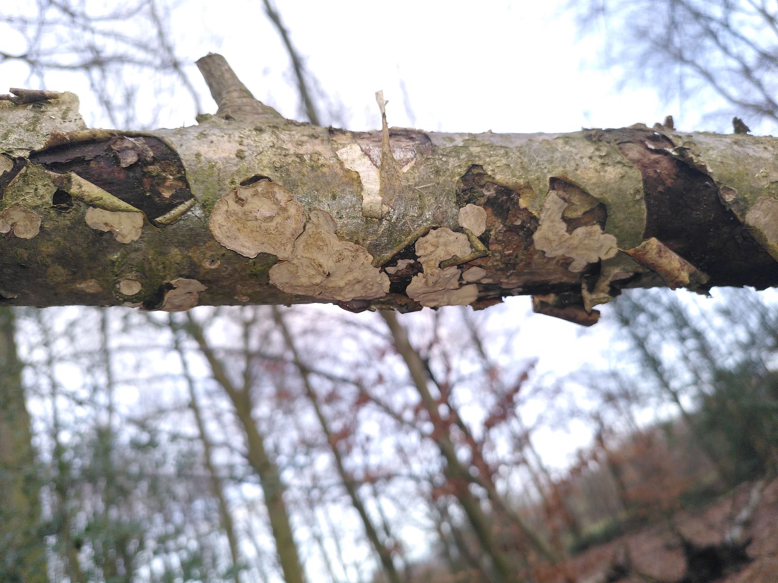 2. würde ich erst Mal mit altem Stereum rugosum abgleichen. Der sieht nämlich genau so aus. Einfach Mal mit Spucke feucht machen und stark reiben. Sollte rot werden, zumindest leicht.