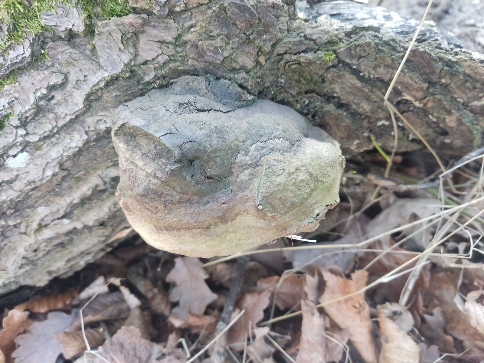 Eichenfeuerschwamm passt aus meiner Sicht und das Weiße/Grüne ist ein Schimmelpilz welcher den Feuerschwamm zersetzt. Penicillium oder Trichoderma