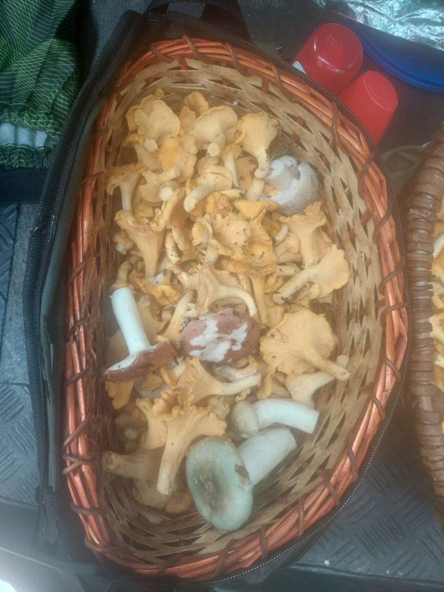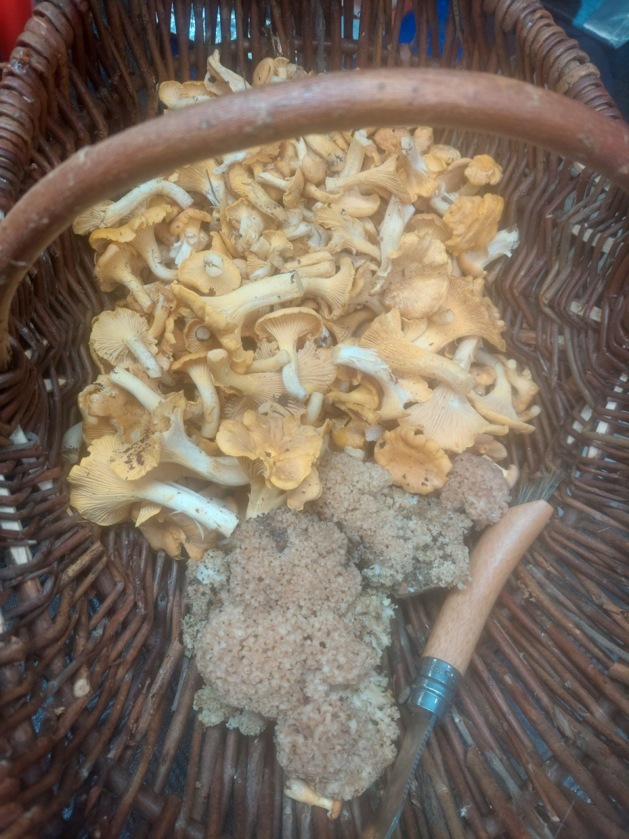 Am Ende haben wir eine Stelle gefunden, wie ich es selbst noch nie erlebt habe. Massenhaft Pfifferlinge in allen Wachstumsstadien. Fast alle unter Buchen, meist im Laub. Einige wenige hatten bereits leichte Trockenschäden. Viele blieben stehen aber am Ende hatten wir wieder etwas über 2,5 kg...zu zweit.