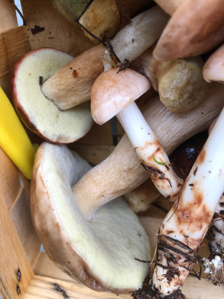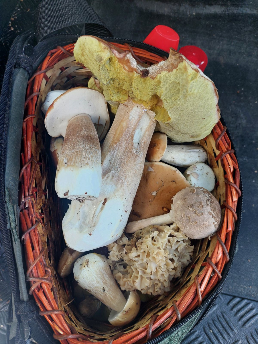 Alles Erstfunde in diesem Jahr: einige knackige Butterpilze, viele frische Steinpilze (hatte ich gar nicht mit gerechnet), die ersten Grünlinge, ein paar Schirmpilze und ein paar rosarote Schmierlinge. Massenhaft junge Kuhpilze, die mich aber nicht interessiert haben.