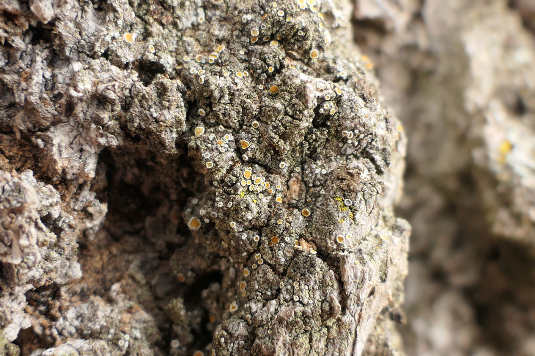 In der rissigen Borke in Richtung Südwest, bequem in Kopfhöhe, wächst eine Caloplaca: lecanorin, orangefrüchtig, mit weiß bereiftem Thallusrand.