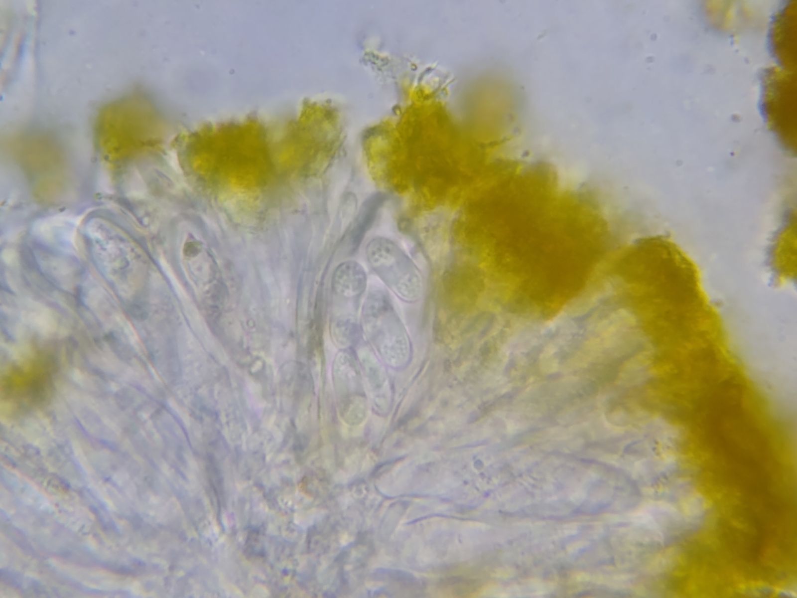Bild 7 Querschnitt Hymenium zart gelb, Hypothecium weiß (in Wasser)