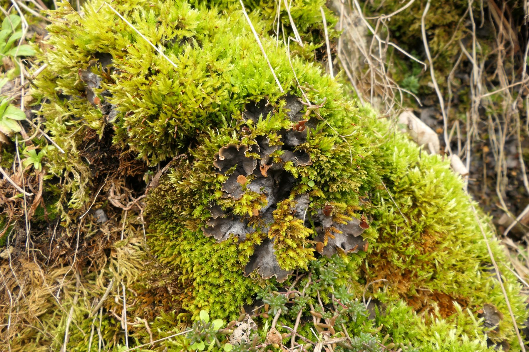 Graue Peltigera auf Moos an mäßig heller Stelle auf Erd/Steinschutt an Nordseite der Burg.