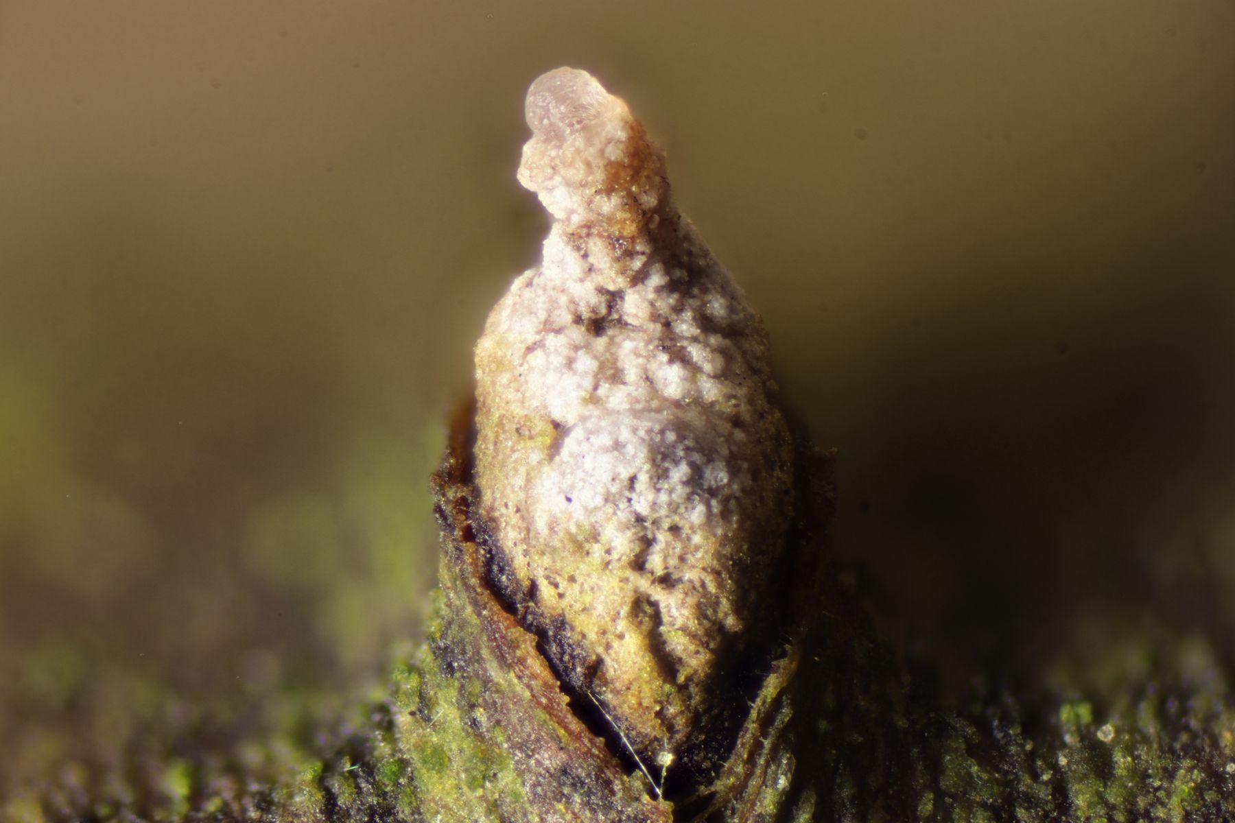 3. An Kirsche entdecke ich dann einige weiße Pinüppel. Ganz klar irgendeine Anamorphe, die ich für mich alleine wahrscheinlich direkt hätte fallen lassen. Aber wir hatten mit Dirk ja extra einen Ascomyceten-Experten aus Weimar einfliegen lassn. Der war direkt begeistert, weil er diesen Pilz schon länger nicht mehr gefunden hatte und wies mich auf die kleinen schwarzen Becher hin, die ich selber erst gar nicht gesehen hatte: Dermea cerasi
