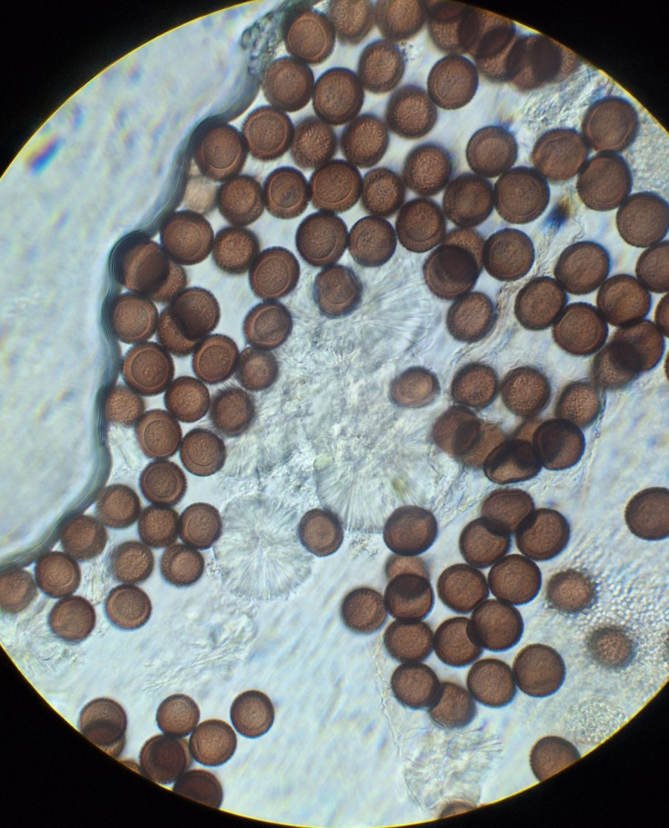 Sporen auffällig geclustert, feinstachelig, Größe ca. 10-12 µm, nahezu kugelig