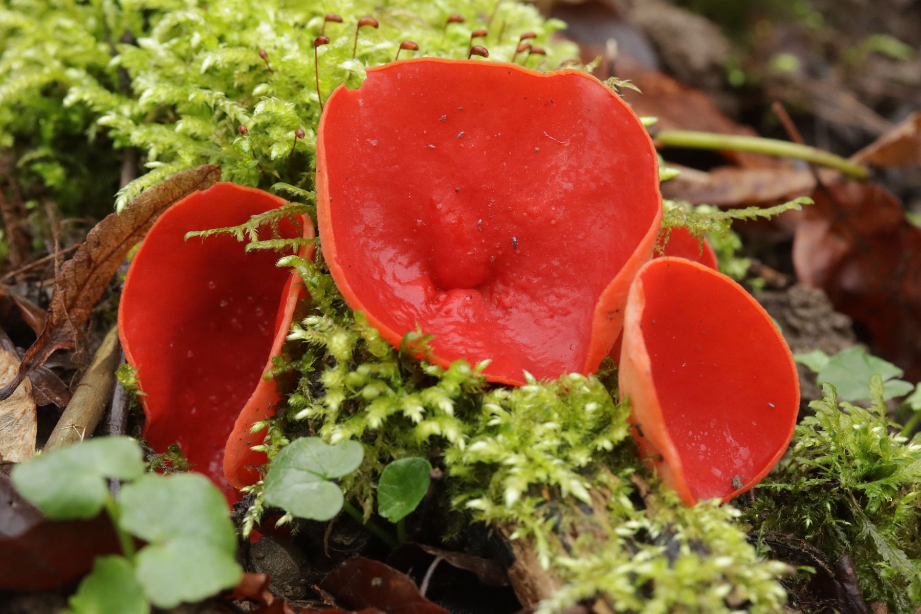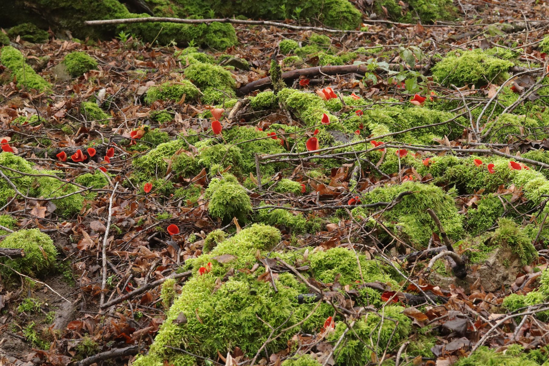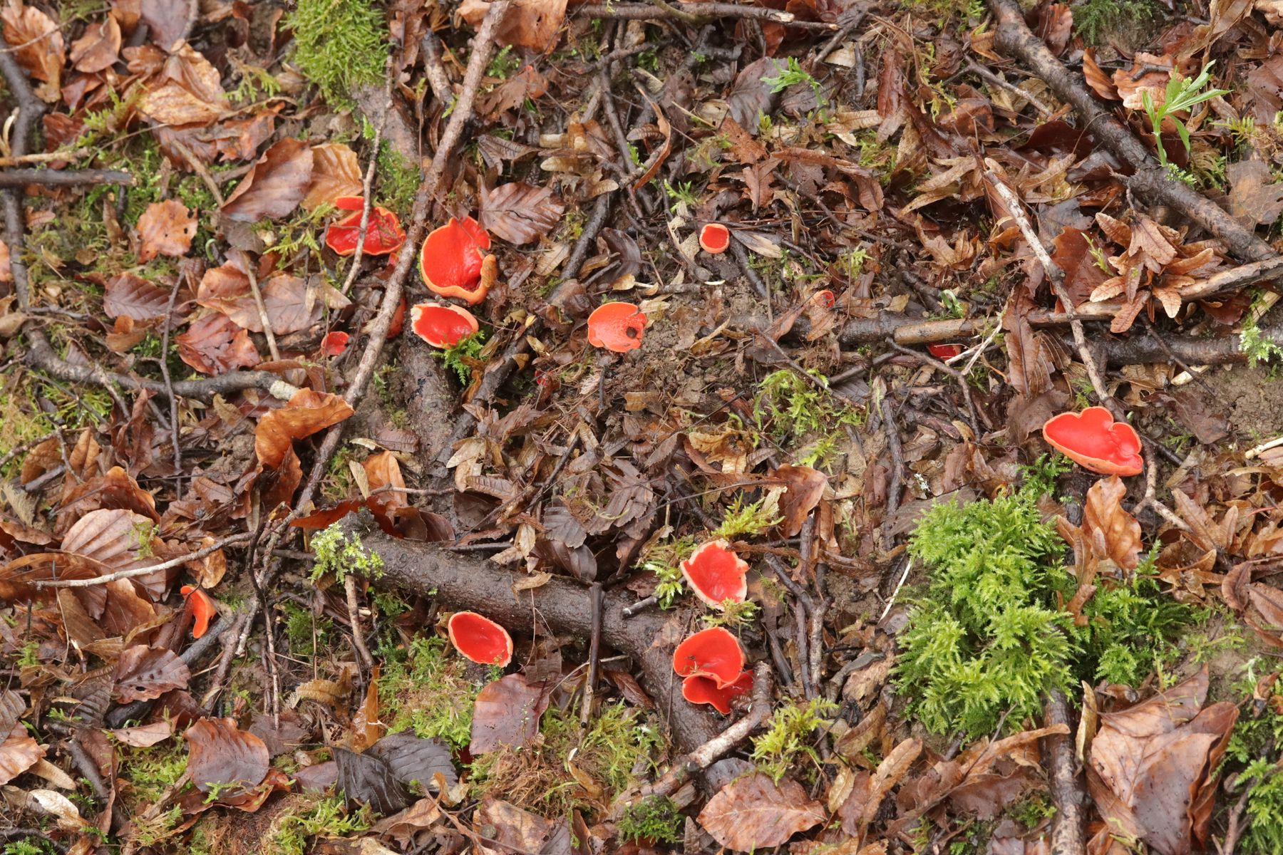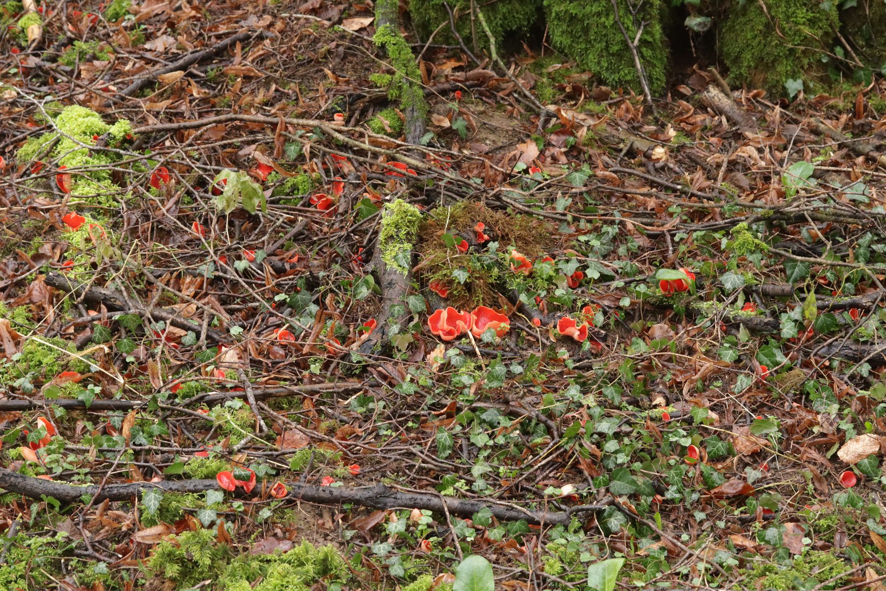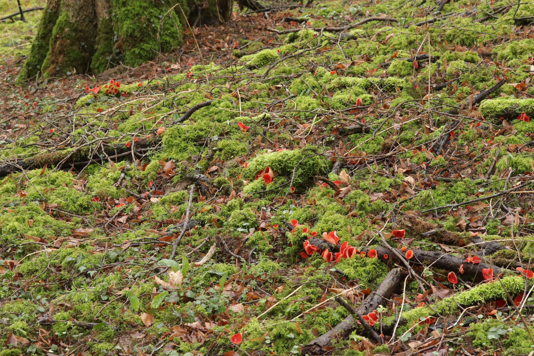 nachdem Karl von seinem Ausflug auf die Jurana-Plantagen berichtet hatte, stand für mich fest: Das muß ich mir unbedingt auch mal selber anschauen. Die Bahn versprach, daß sie mich bei einem Start um 5:41 in viereinhalb Stunden ans Ziel bringen würde und so hatte ich den Wecker auf 5:10 gestellt und mich am Vorabend gegen 21 Uhr ins Bett begeben. Als ich dann irgendwann im Dunkeln wach wurde, zeigte ein kurzer Kontrollblick auf die Uhr 5:38... ich hatte die Weckzeit zwar eingestellt, aber den Alarm nicht aktiviert. Also erstmal in Ruhe aufstehen, Tee trinken und dann eben eine Stunde später los. Das hat auch reibungslos und ohne Verspätung funktioniert, obwohl ich am Karnevalssamstag durch Düsseldorf und Köln mußte. Vor Ort ließen die Massen an Sarcoscypha jurana dann auch nicht lange auf sich warten. Immer wenn man an einer Linde vorbeikam, gab es auch rote Becher auf dem Boden, stellenweise dann wirklich ein rotes Meer. Aber es gab auch zahlreiche andere Pilze, die ich euch nicht vorenthalten möchte: