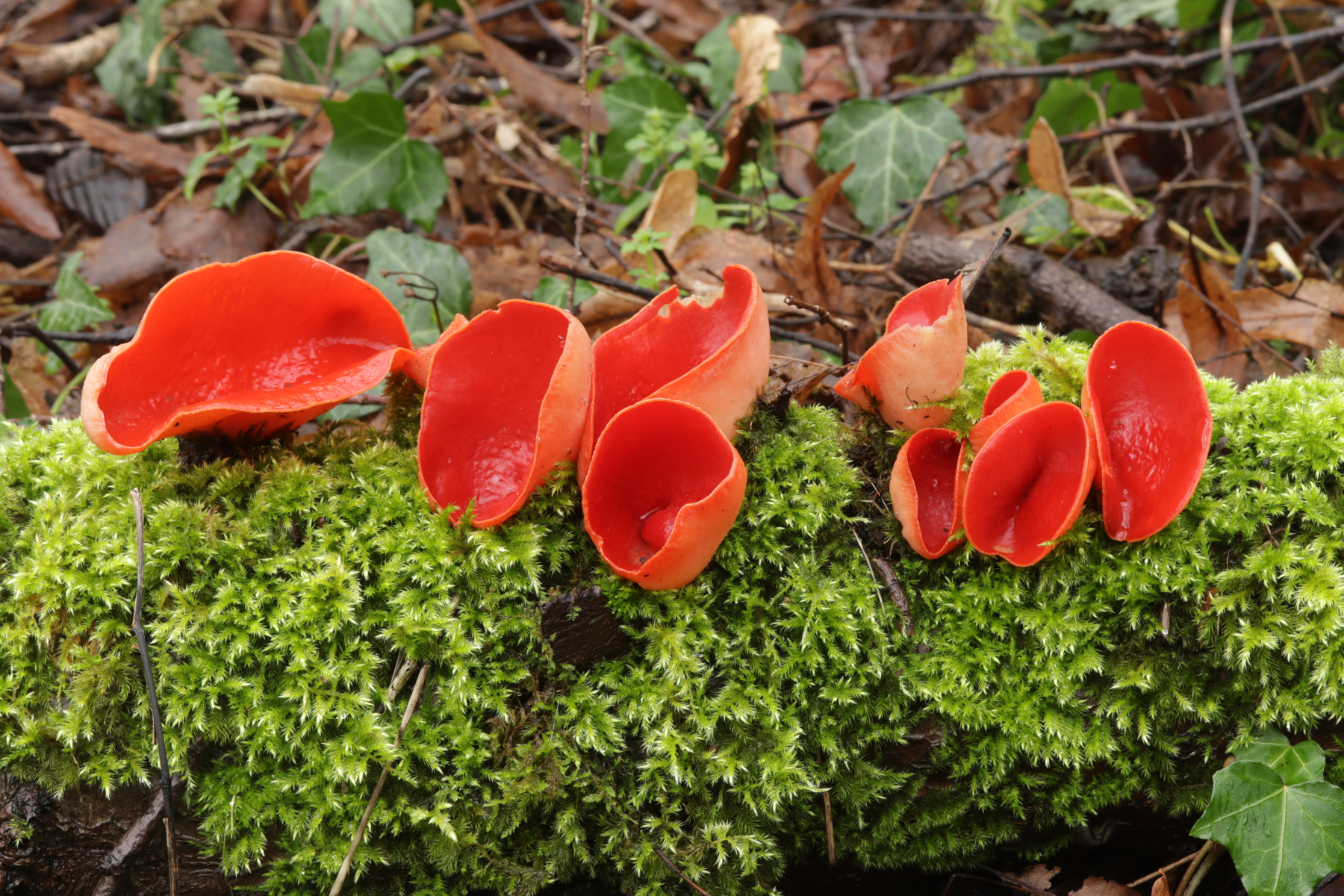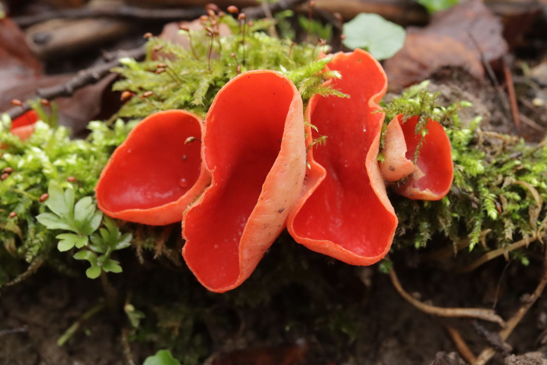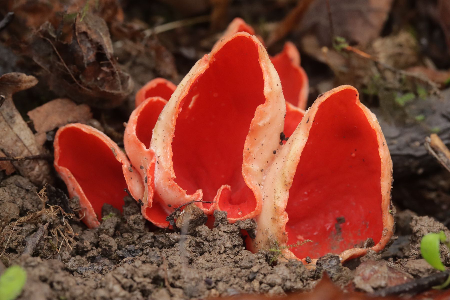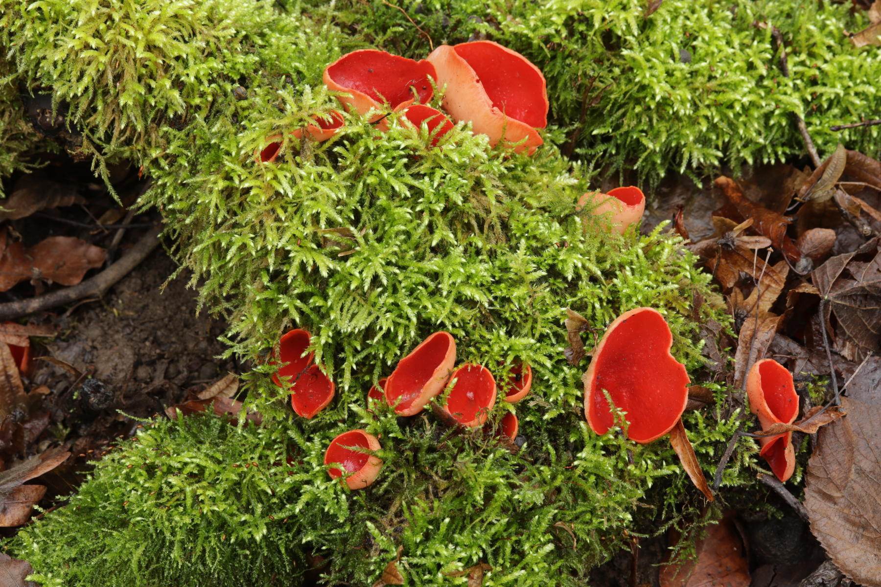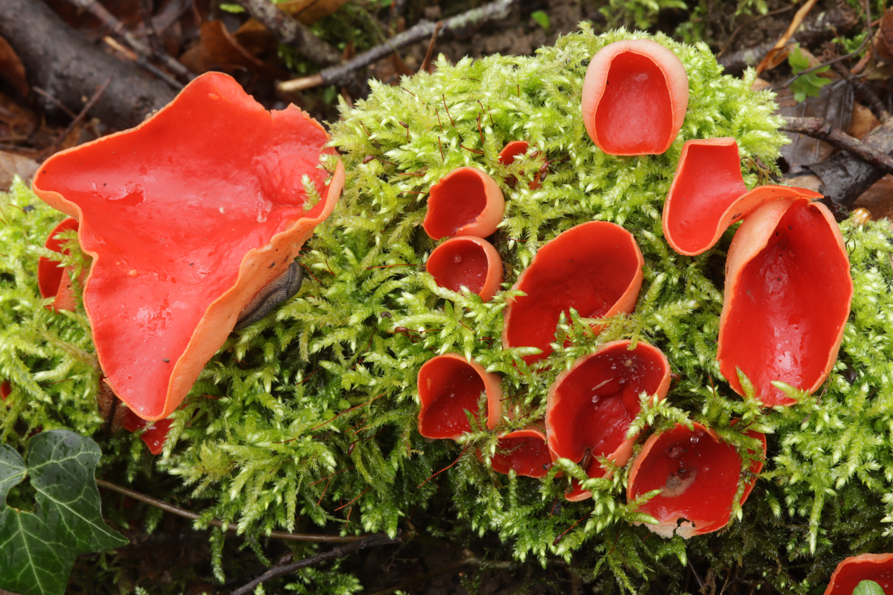 nachdem Karl von seinem Ausflug auf die Jurana-Plantagen berichtet hatte, stand für mich fest: Das muß ich mir unbedingt auch mal selber anschauen. Die Bahn versprach, daß sie mich bei einem Start um 5:41 in viereinhalb Stunden ans Ziel bringen würde und so hatte ich den Wecker auf 5:10 gestellt und mich am Vorabend gegen 21 Uhr ins Bett begeben. Als ich dann irgendwann im Dunkeln wach wurde, zeigte ein kurzer Kontrollblick auf die Uhr 5:38... ich hatte die Weckzeit zwar eingestellt, aber den Alarm nicht aktiviert. Also erstmal in Ruhe aufstehen, Tee trinken und dann eben eine Stunde später los. Das hat auch reibungslos und ohne Verspätung funktioniert, obwohl ich am Karnevalssamstag durch Düsseldorf und Köln mußte. Vor Ort ließen die Massen an Sarcoscypha jurana dann auch nicht lange auf sich warten. Immer wenn man an einer Linde vorbeikam, gab es auch rote Becher auf dem Boden, stellenweise dann wirklich ein rotes Meer. Aber es gab auch zahlreiche andere Pilze, die ich euch nicht vorenthalten möchte: