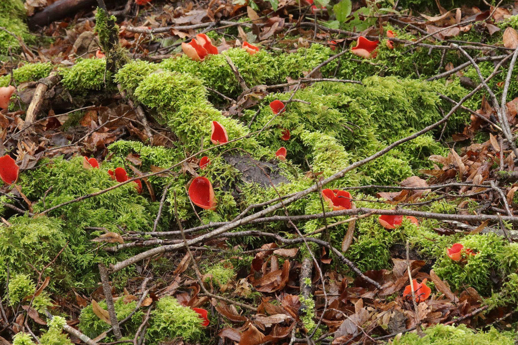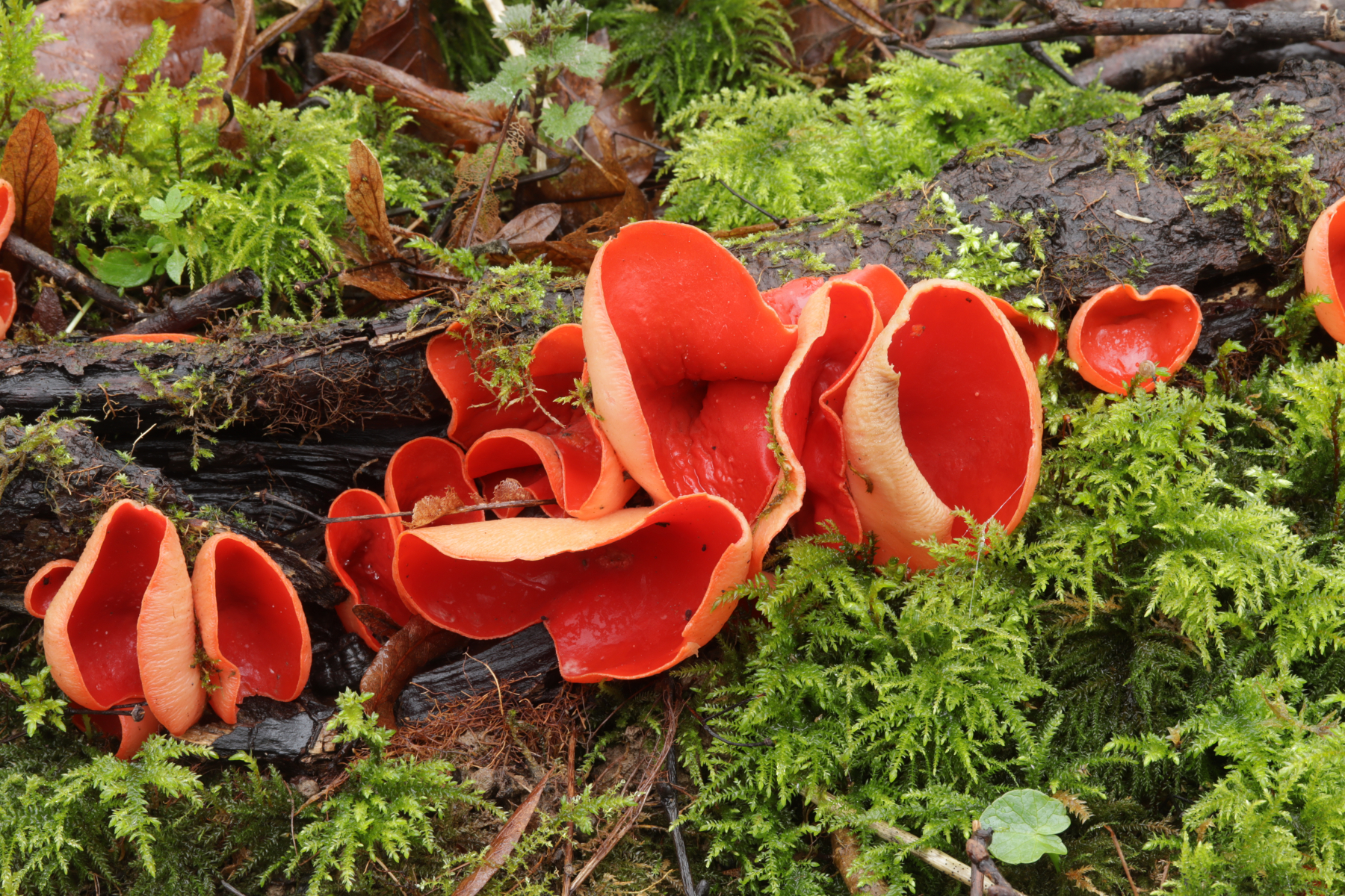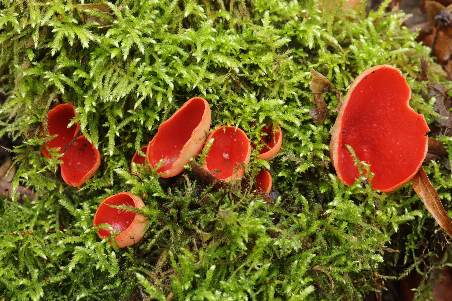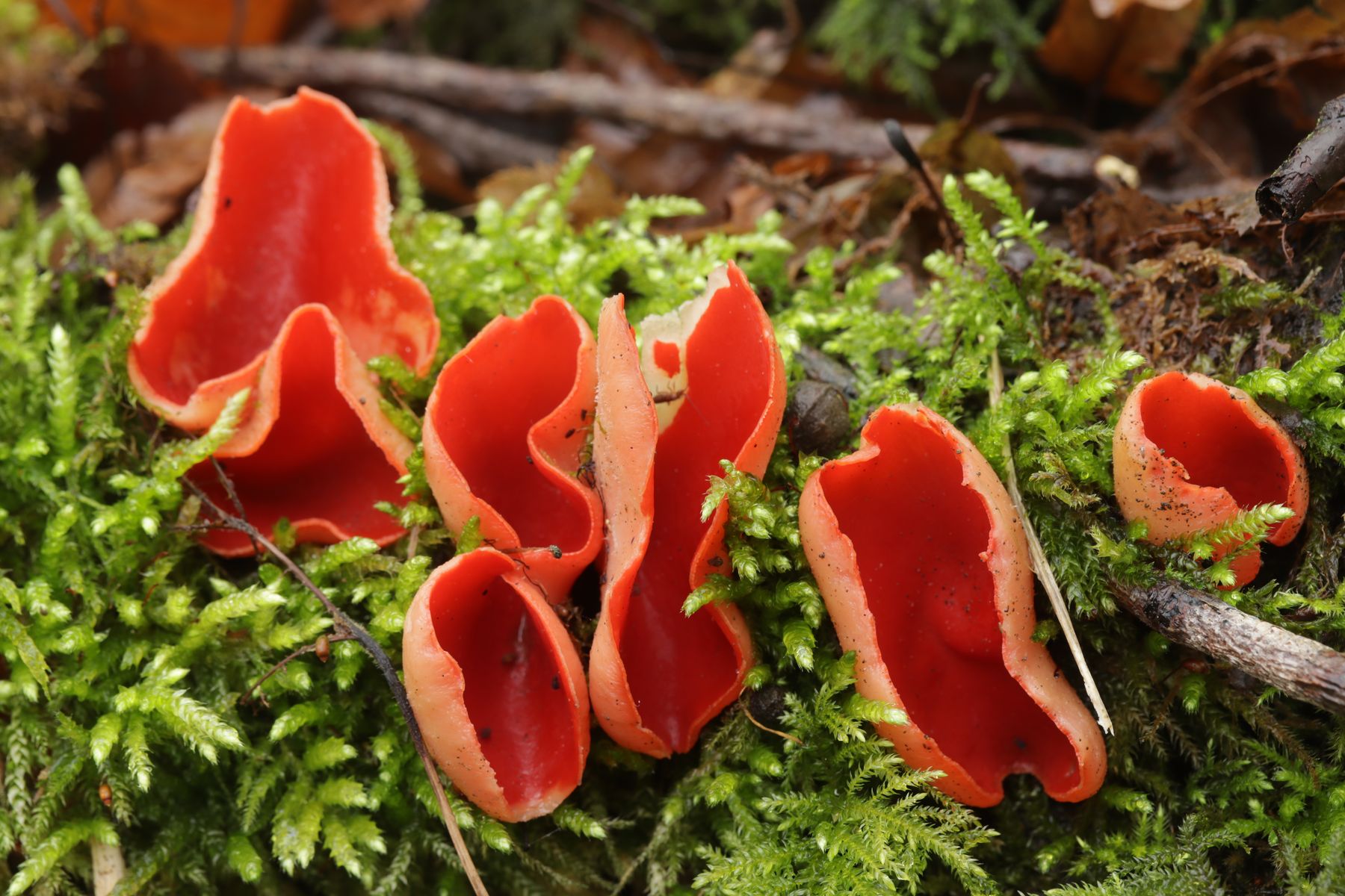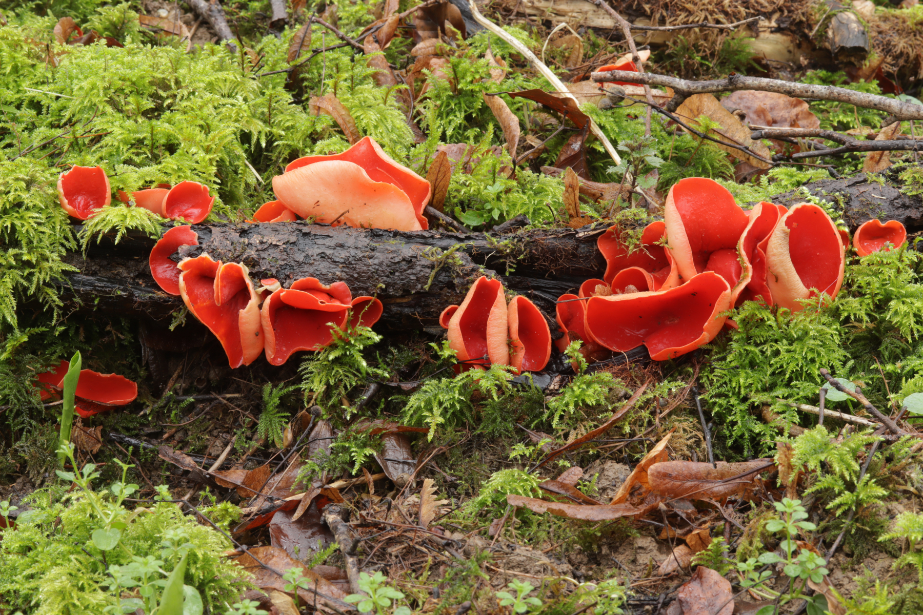 nachdem Karl von seinem Ausflug auf die Jurana-Plantagen berichtet hatte, stand für mich fest: Das muß ich mir unbedingt auch mal selber anschauen. Die Bahn versprach, daß sie mich bei einem Start um 5:41 in viereinhalb Stunden ans Ziel bringen würde und so hatte ich den Wecker auf 5:10 gestellt und mich am Vorabend gegen 21 Uhr ins Bett begeben. Als ich dann irgendwann im Dunkeln wach wurde, zeigte ein kurzer Kontrollblick auf die Uhr 5:38... ich hatte die Weckzeit zwar eingestellt, aber den Alarm nicht aktiviert. Also erstmal in Ruhe aufstehen, Tee trinken und dann eben eine Stunde später los. Das hat auch reibungslos und ohne Verspätung funktioniert, obwohl ich am Karnevalssamstag durch Düsseldorf und Köln mußte. Vor Ort ließen die Massen an Sarcoscypha jurana dann auch nicht lange auf sich warten. Immer wenn man an einer Linde vorbeikam, gab es auch rote Becher auf dem Boden, stellenweise dann wirklich ein rotes Meer. Aber es gab auch zahlreiche andere Pilze, die ich euch nicht vorenthalten möchte: