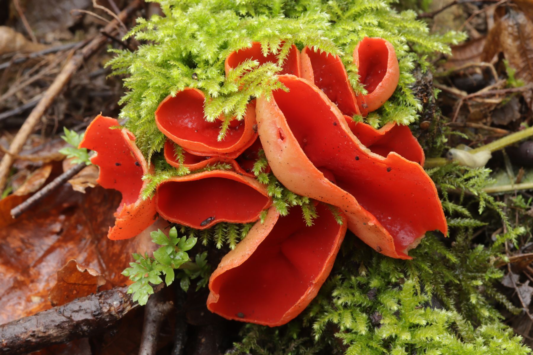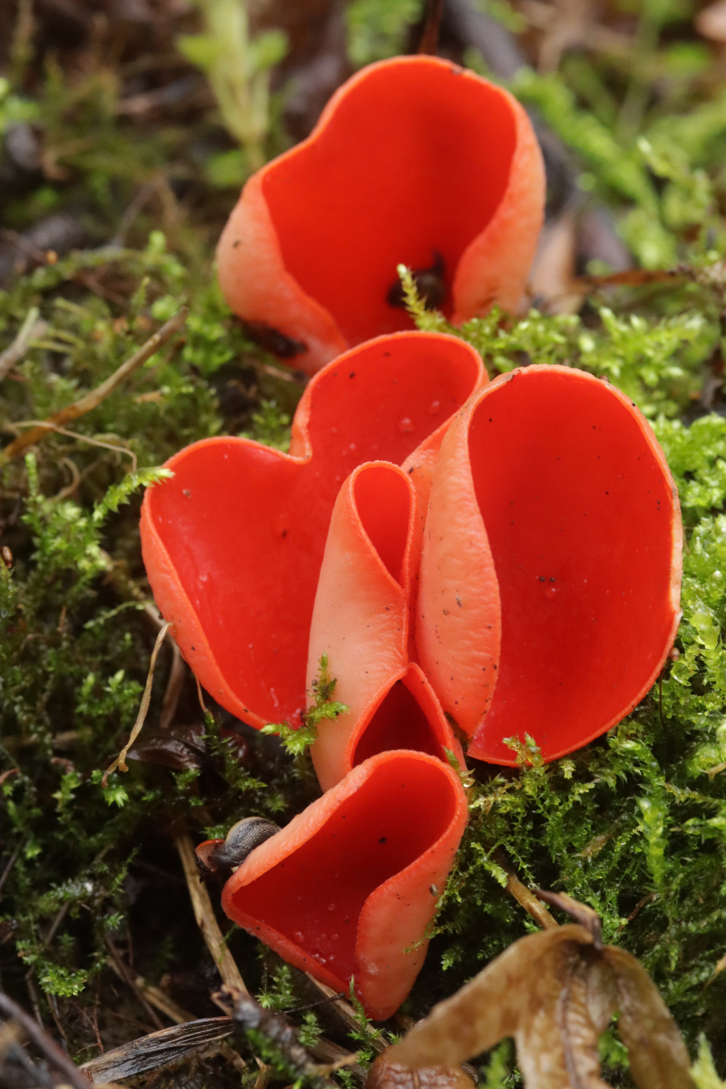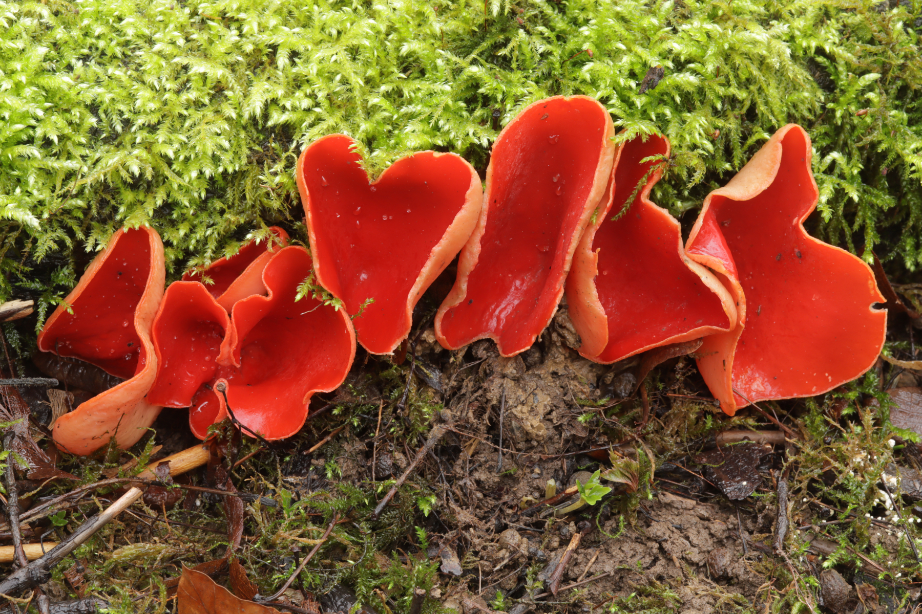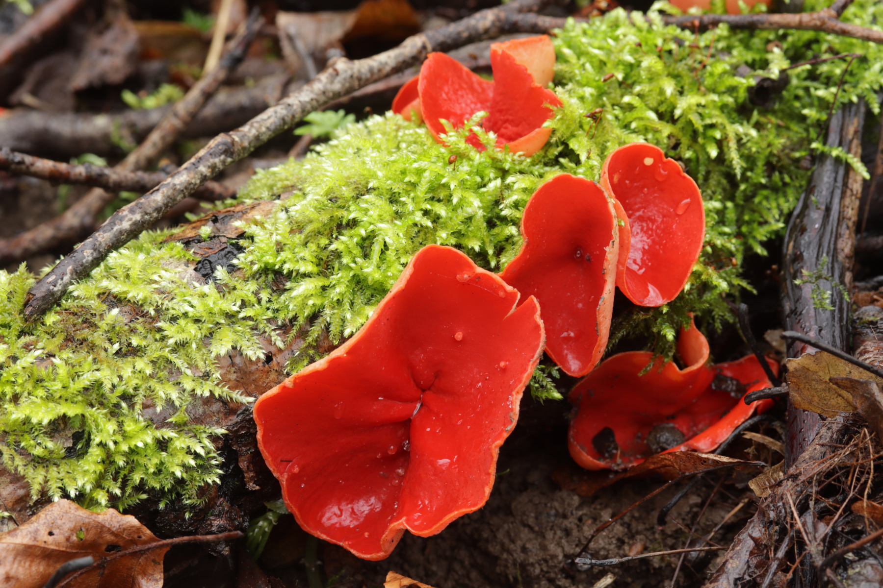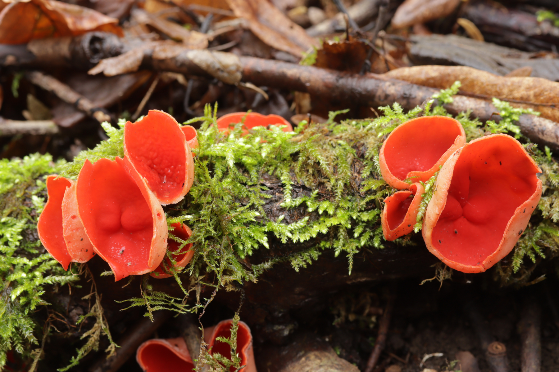 nachdem Karl von seinem Ausflug auf die Jurana-Plantagen berichtet hatte, stand für mich fest: Das muß ich mir unbedingt auch mal selber anschauen. Die Bahn versprach, daß sie mich bei einem Start um 5:41 in viereinhalb Stunden ans Ziel bringen würde und so hatte ich den Wecker auf 5:10 gestellt und mich am Vorabend gegen 21 Uhr ins Bett begeben. Als ich dann irgendwann im Dunkeln wach wurde, zeigte ein kurzer Kontrollblick auf die Uhr 5:38... ich hatte die Weckzeit zwar eingestellt, aber den Alarm nicht aktiviert. Also erstmal in Ruhe aufstehen, Tee trinken und dann eben eine Stunde später los. Das hat auch reibungslos und ohne Verspätung funktioniert, obwohl ich am Karnevalssamstag durch Düsseldorf und Köln mußte. Vor Ort ließen die Massen an Sarcoscypha jurana dann auch nicht lange auf sich warten. Immer wenn man an einer Linde vorbeikam, gab es auch rote Becher auf dem Boden, stellenweise dann wirklich ein rotes Meer. Aber es gab auch zahlreiche andere Pilze, die ich euch nicht vorenthalten möchte: