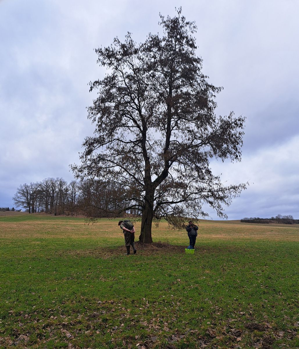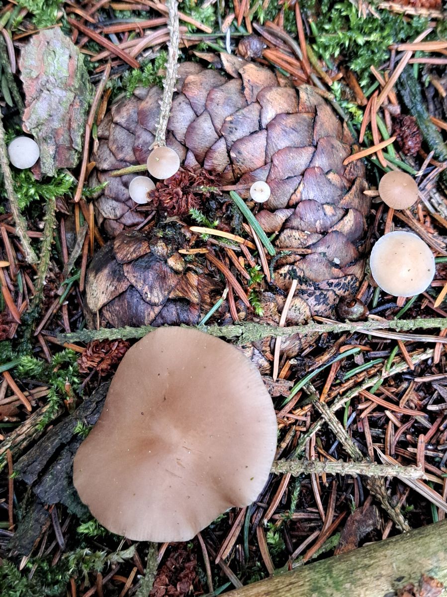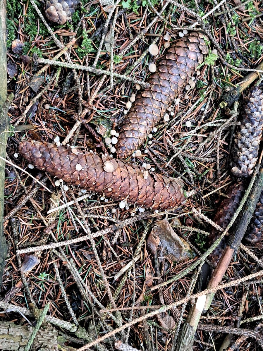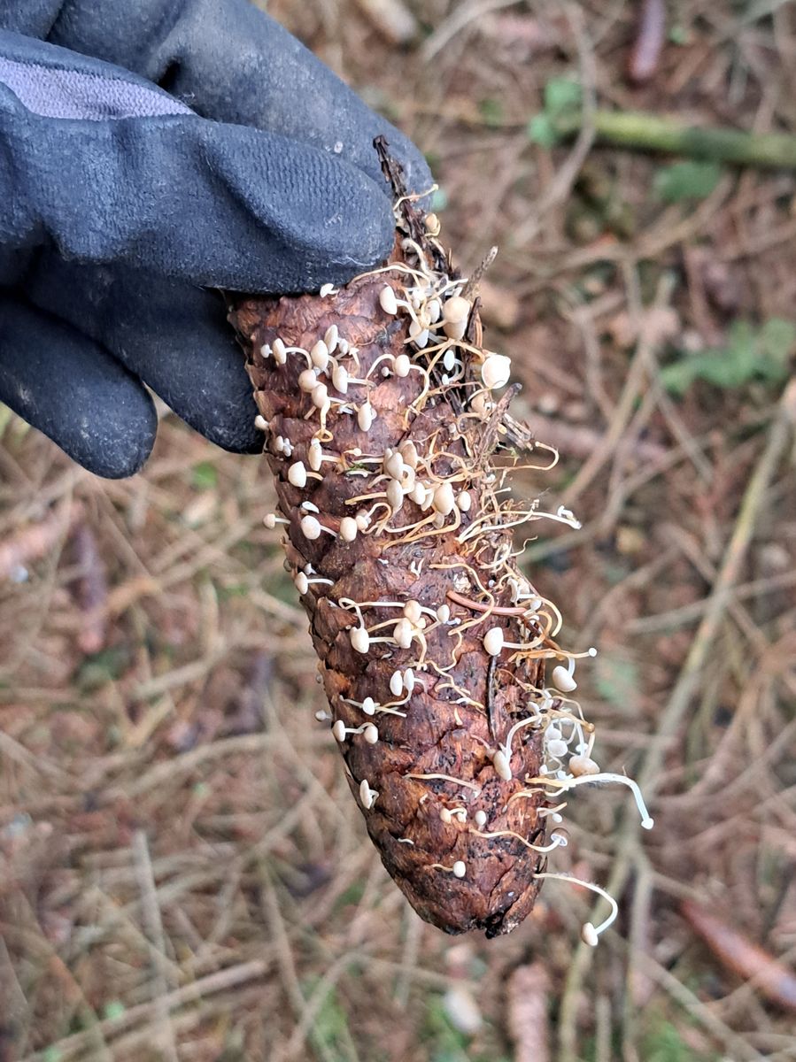 Die erste kleine Pilzgruppe befand sich nur ein paar Meter vom Auto entfernt, ganz untypisch auf einem Maulwurfshügel, der zugehörige Zapfen darunter begraben: