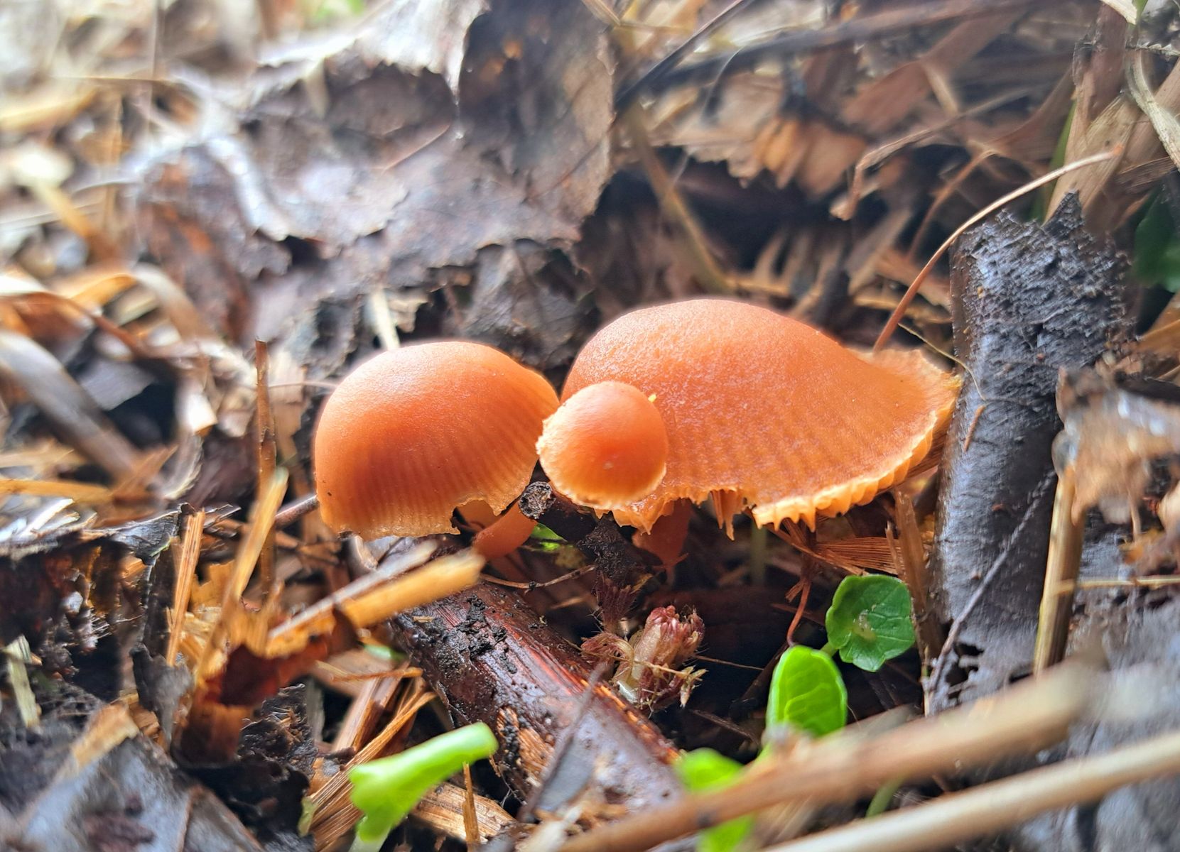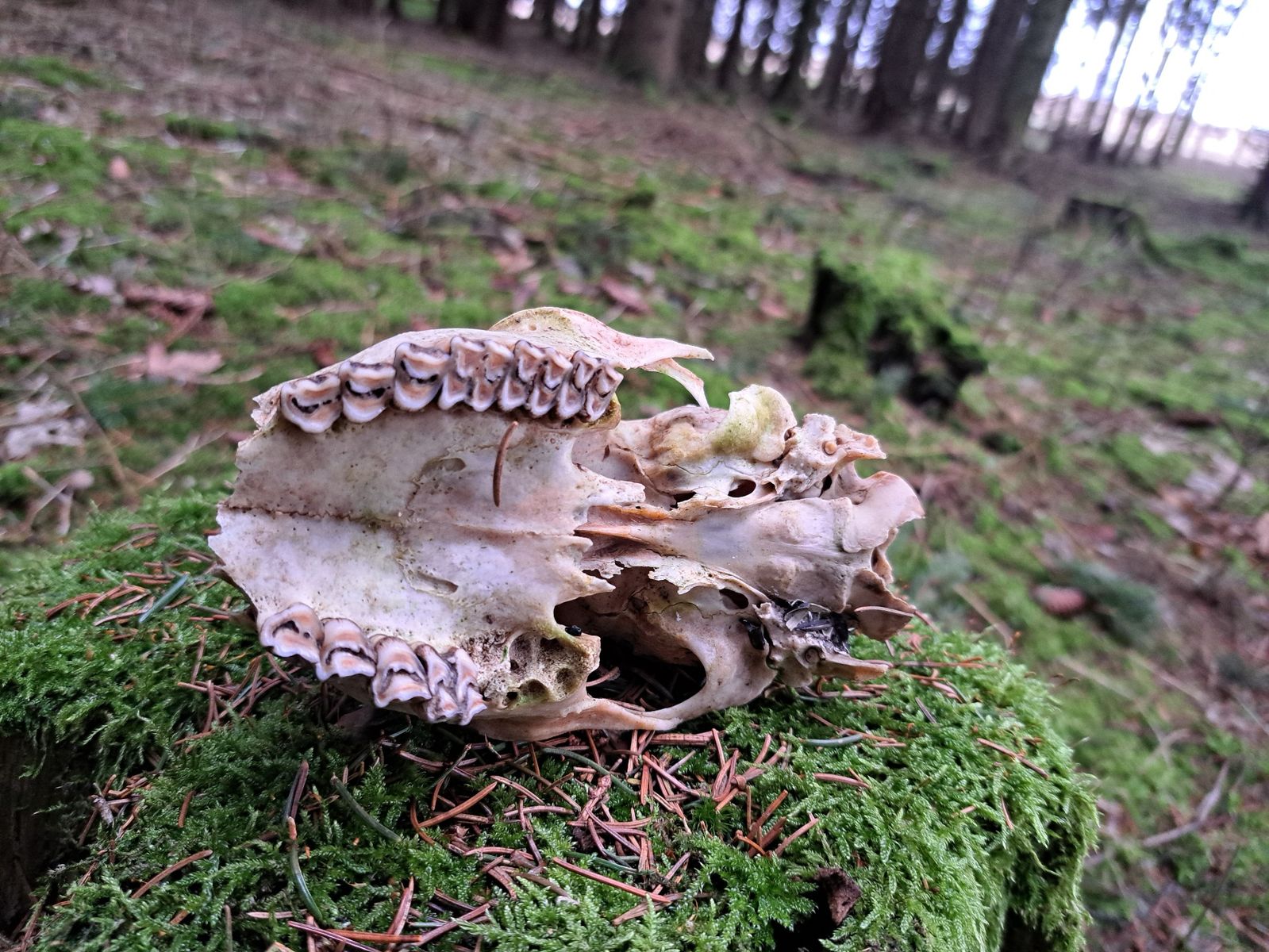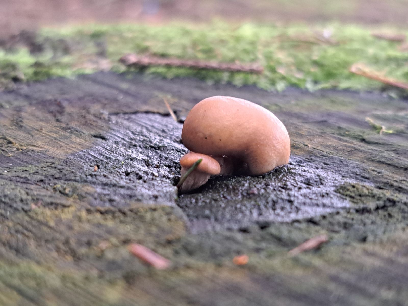 Die erste kleine Pilzgruppe befand sich nur ein paar Meter vom Auto entfernt, ganz untypisch auf einem Maulwurfshügel, der zugehörige Zapfen darunter begraben: