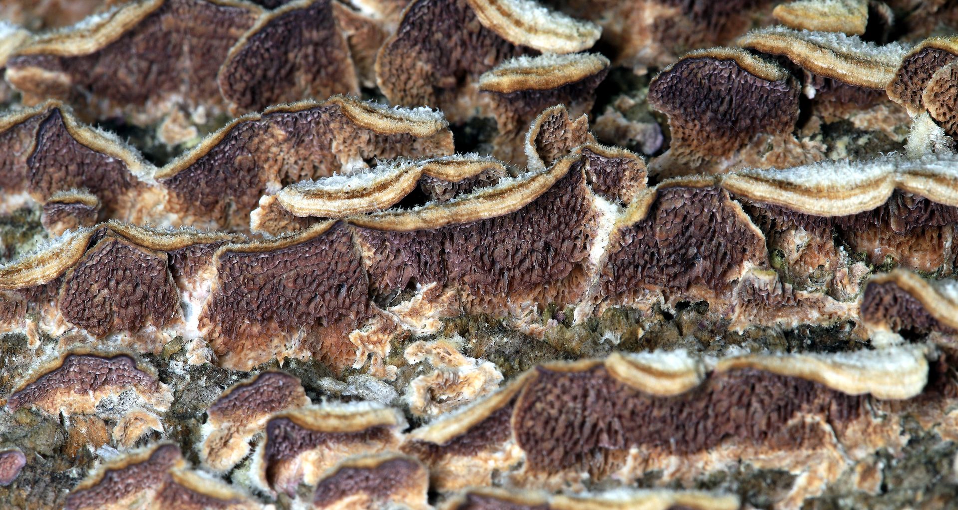 Vor kurzem habe ich zuerst die Unterseite dieser Art fotografiert, dachte an Porlinge. Heute war ich nochmal da um die Oberseite und das Umfeld zu fotografieren. Was mir auffiel war, dass sich die Unterseite in den vergangen paar Tagen anstelle von "lila" nun braun gefärbt hat. Kann mir jemand bei der Bestimmung helfen ? Fundort ist ein Holzstapel am Waldwirtschaftsweg an Möhnesee Südufer.