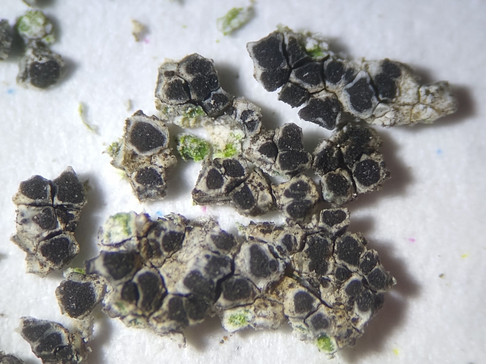 Die Apothecien sind in der Thallusmitte sehr zahlreich, mit hellem Thallusrand und schwarzbrauner Scheibe, die stark mit dem Lager kontrastiert.