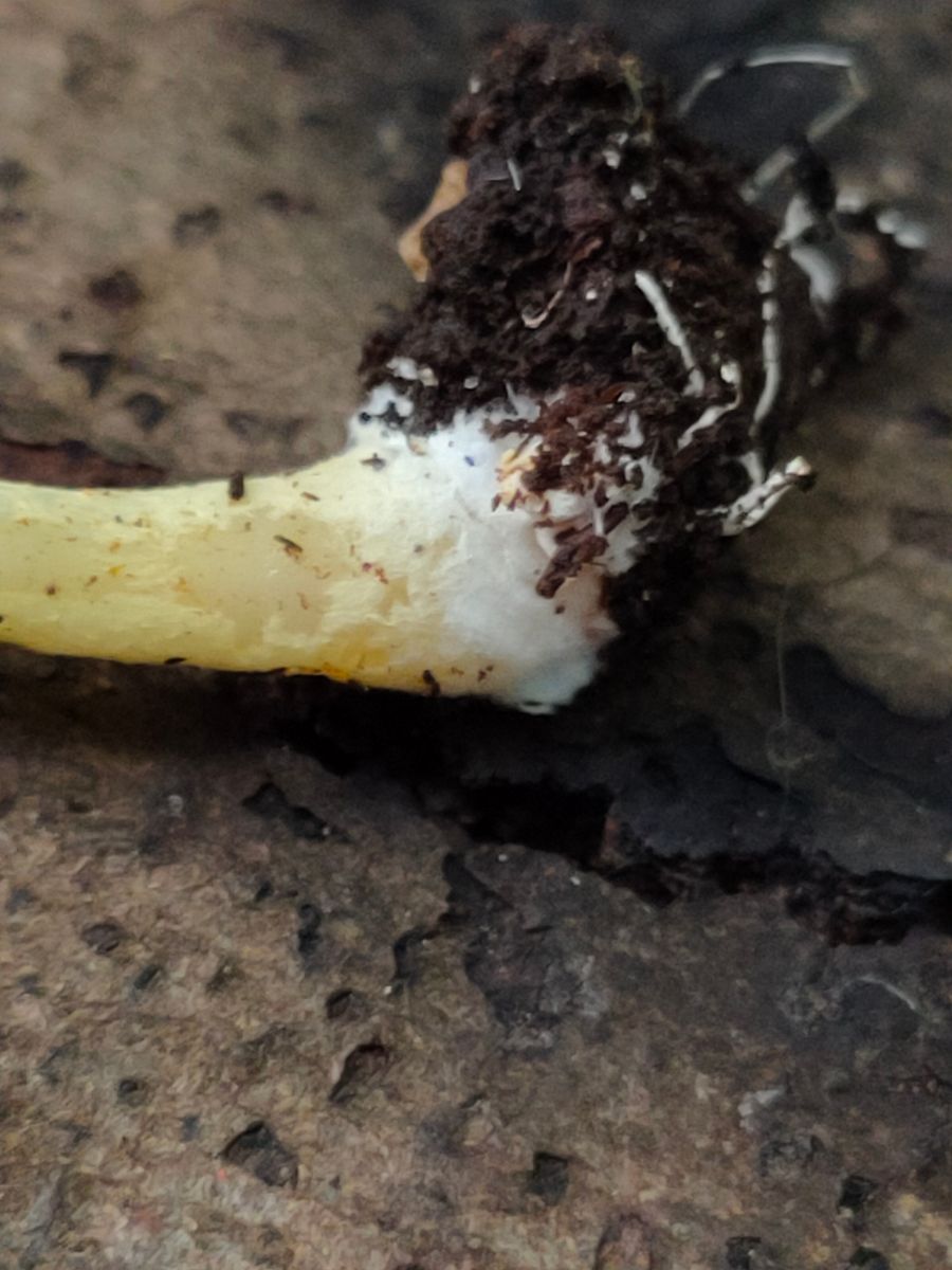 Die Stielbasis ist leicht verdickt und das weiße Myzel ist gut zu erkennen.
