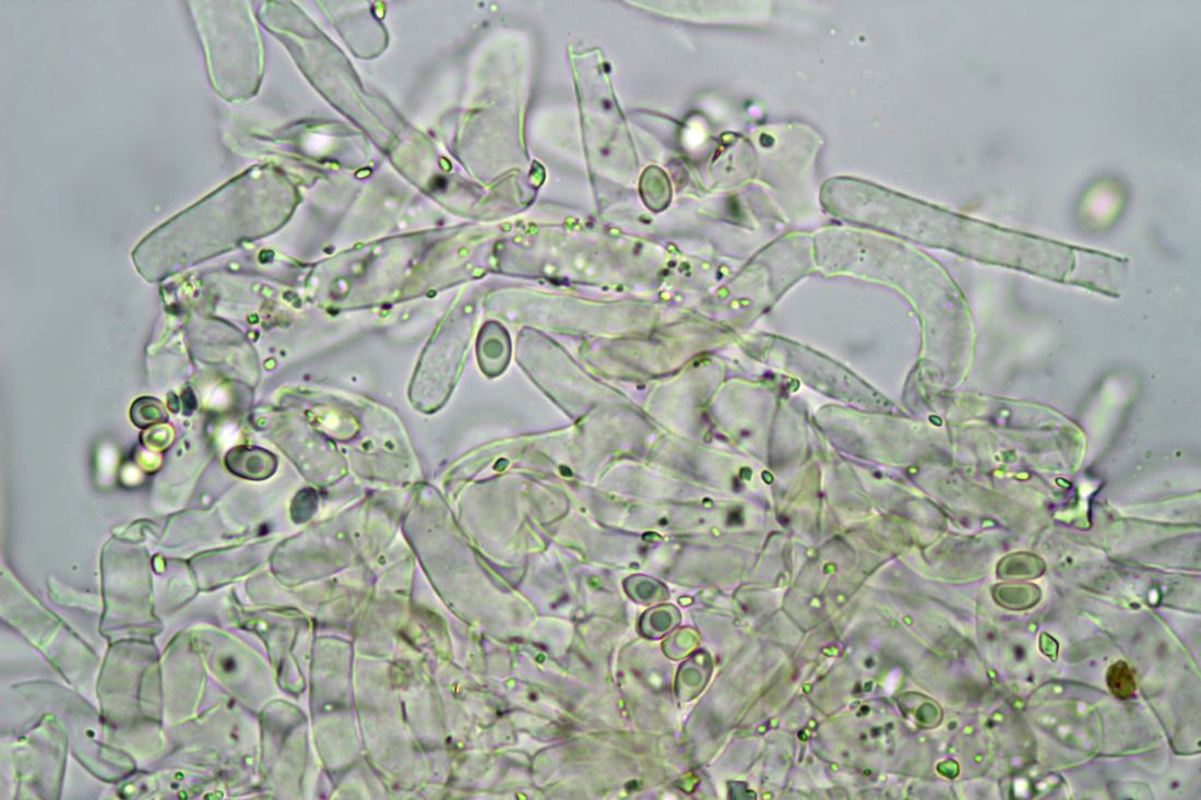 Habe bereits alle Mikromerkmale, eben außer die des Stiels, fotografiert, die Bearbeitung dauert aber noch etwas. Hier schon mal ein Foto der HDS (Hutdeckschicht) in 3% KOH. Zu sehen sind liegende, septierte Hyphen ohne Schnallen mit zahlreichen Kristallen dazwischen.