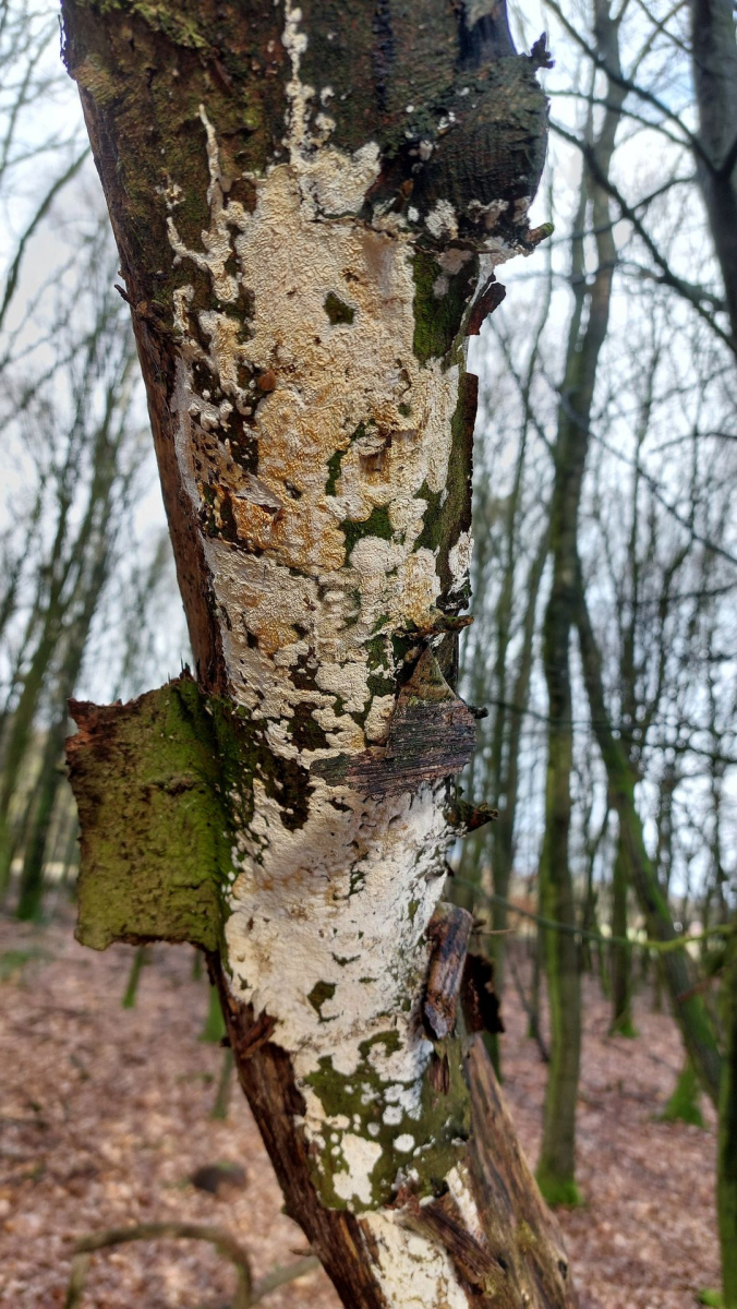 (5) Ein gelblich-weißer, schuppiger Belag auf einem stehenden, toten Baum im Laubwald. Bei der Recherche bin ich auf den Milchweißen Eggenpilz (Irpex lacteus) gestoßen. Ist vermutlich schwer auf Artebene zu bestimmen, aber könnte ich damit zumindest ungefähr richtig liegen?