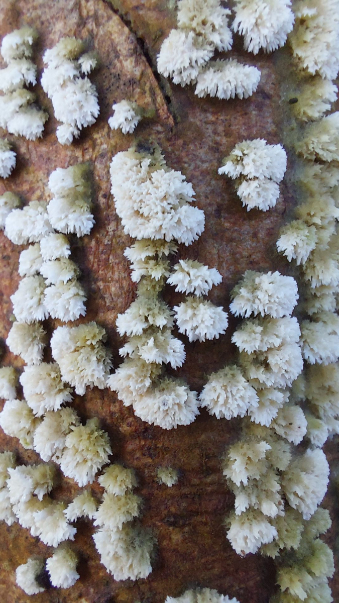 (5) Ein gelblich-weißer, schuppiger Belag auf einem stehenden, toten Baum im Laubwald. Bei der Recherche bin ich auf den Milchweißen Eggenpilz (Irpex lacteus) gestoßen. Ist vermutlich schwer auf Artebene zu bestimmen, aber könnte ich damit zumindest ungefähr richtig liegen?