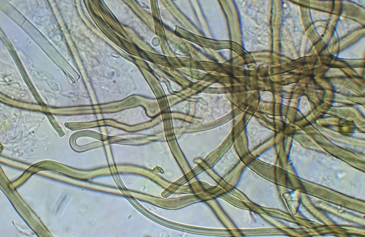 finde ich den Gedanken, dass es sich um L. marginatum handeln kann, noch plausibler. Einerseits wird hier gezeigt, dass die Sporen stachelig sind, zweitens werden diese komischen gestuften Hypen gezeigt. Die septierten farblosen Elemente, die ich gezeigt habe, könnte mit diesen hier übereinstimmen "Paracapillitium 2.54.2 μm diam., with thin and smooth walls, hyaline, septate, unbranched, scarce". Zudem "Rhizomorphs scarce, but a central and larger rhizomorph (pseudorrhiza) is present" - was auch immer das "larger" hier bedeutet. Bei meinem Exemplar sind die Wurzeldinger 4 cm lang, weißlich. Fotos und wohl auch Mikrobilder dieser Wurzeln reiche ich nach.